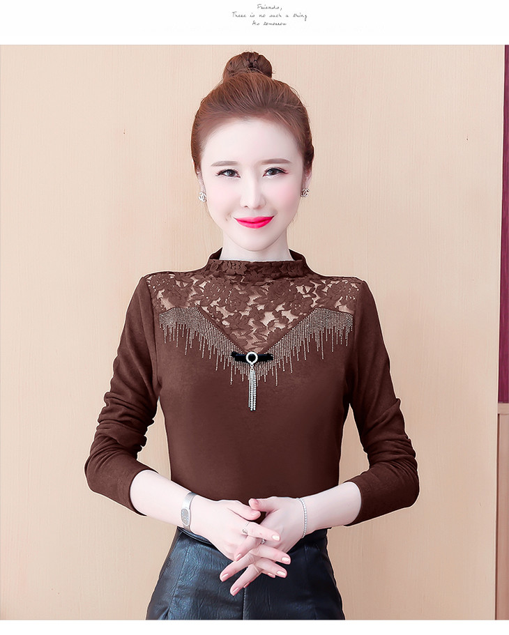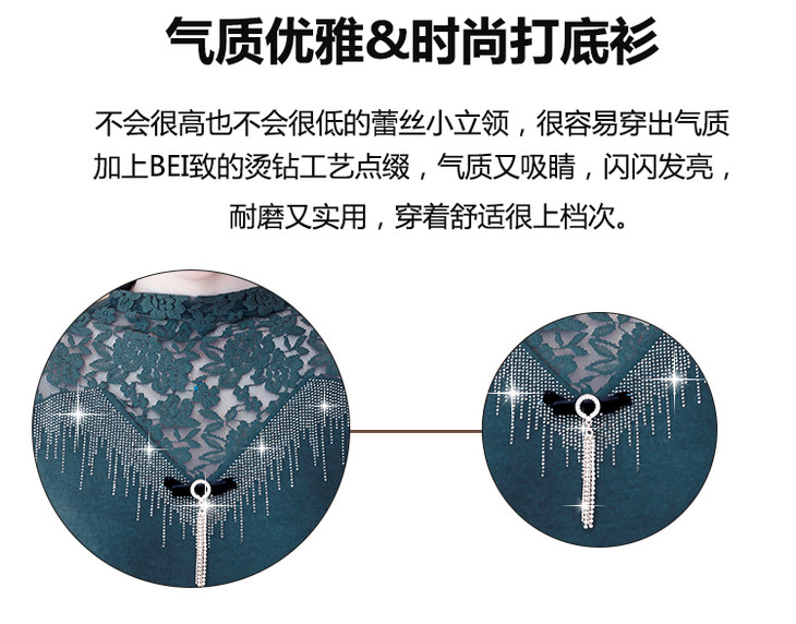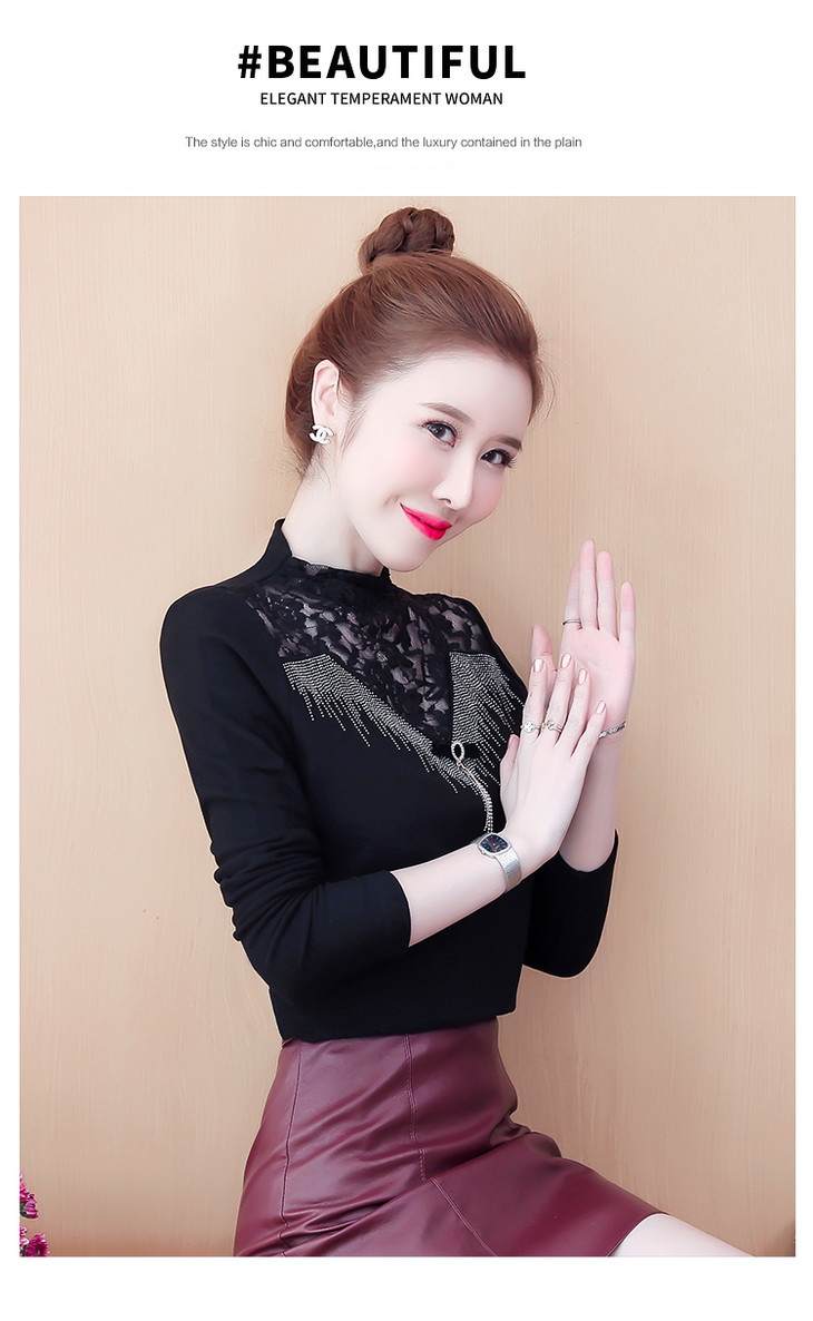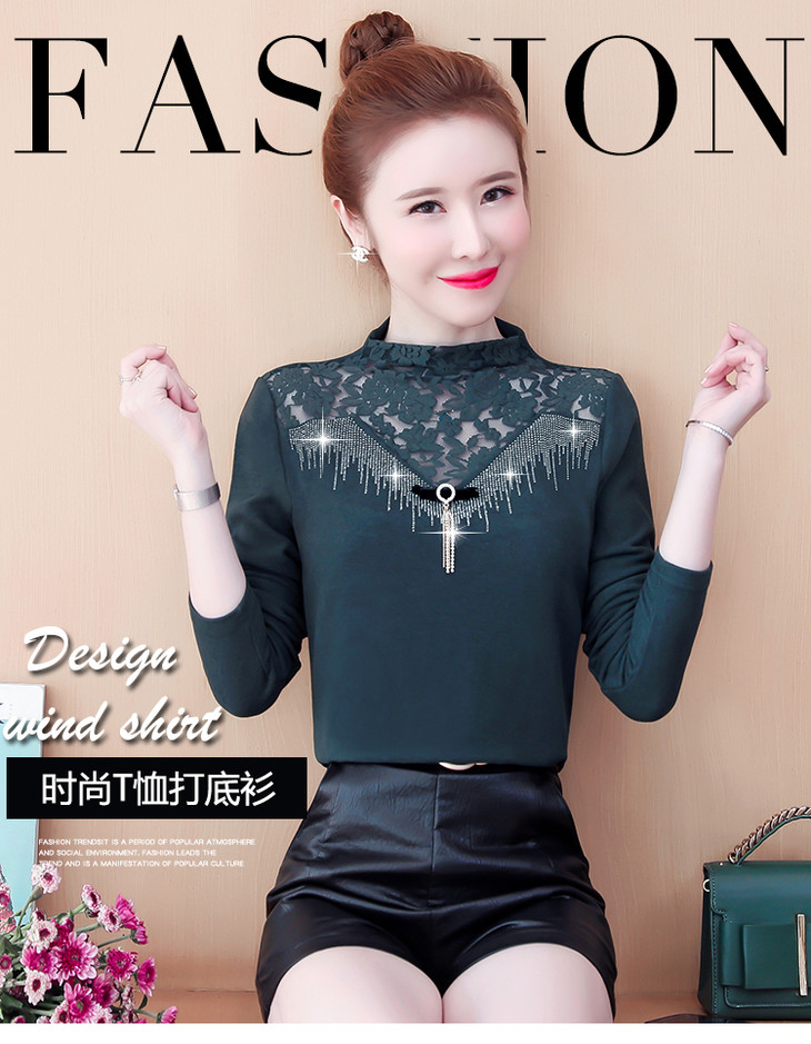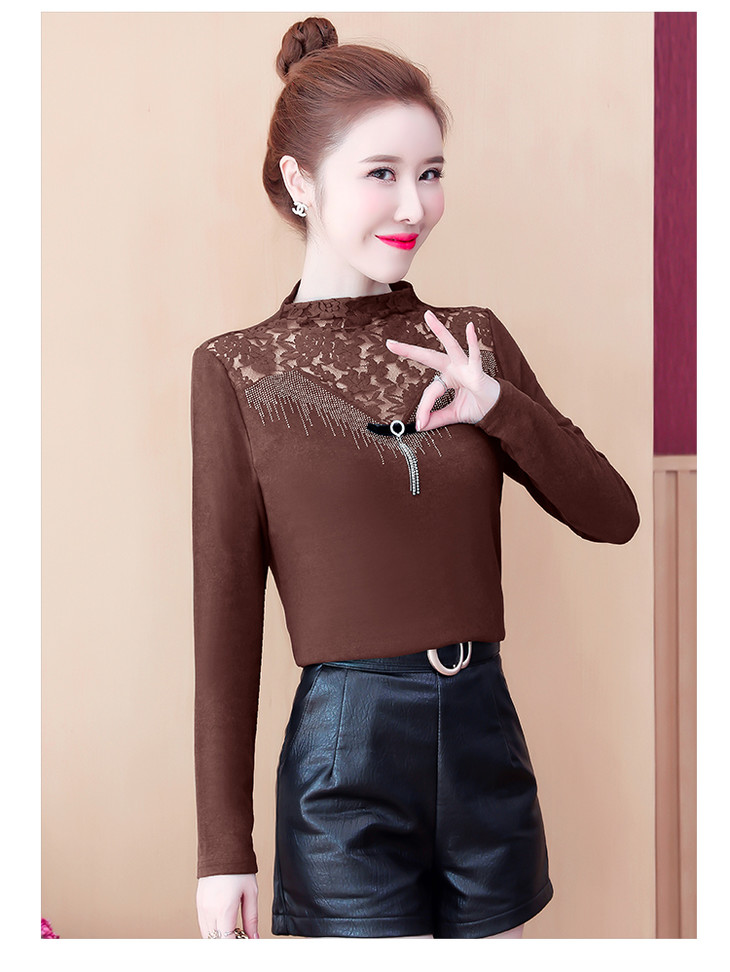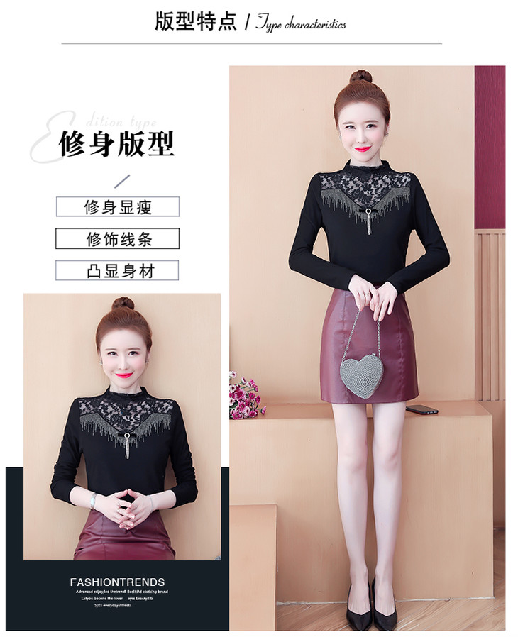 KQL-320H1750 秋冬蕾丝拼接加绒加厚高领打底衫女T恤2020新款洋气烫钻长袖上衣