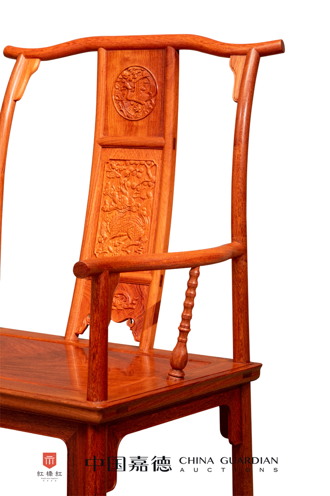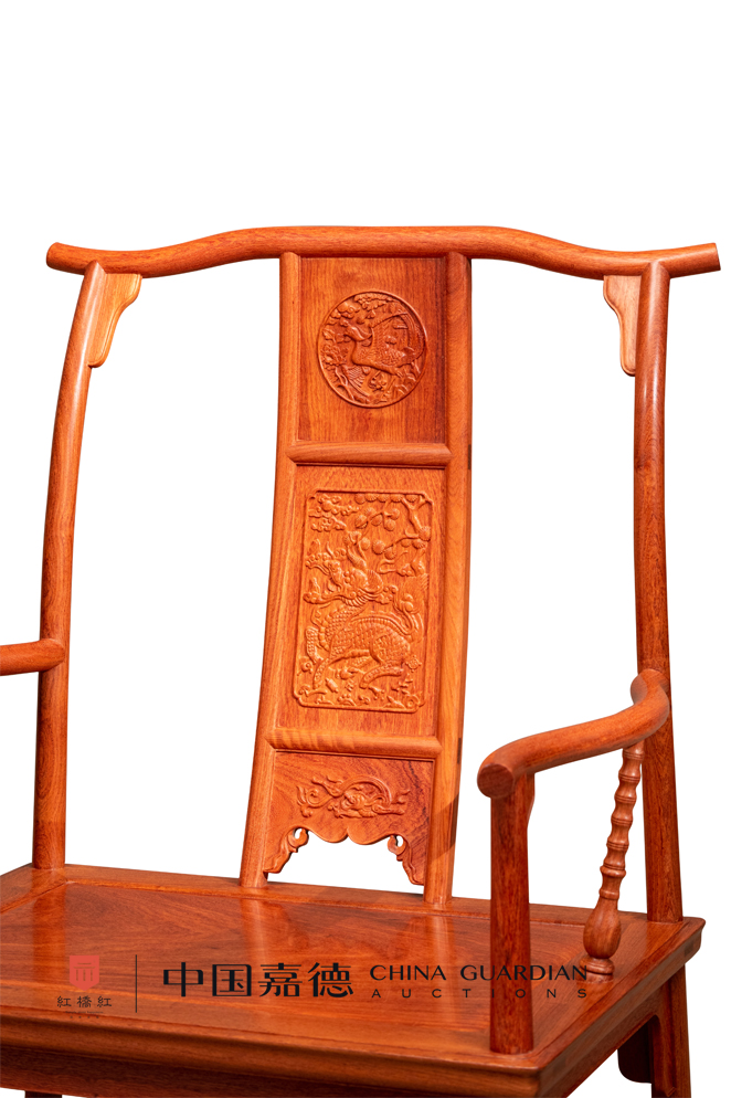 此四出头官帽椅,缅甸花梨木制作,三攒靠背板,麒麟引凤纹主题纹饰,瓶竹纹联帮棍,雕工精致,细节耐人寻味。