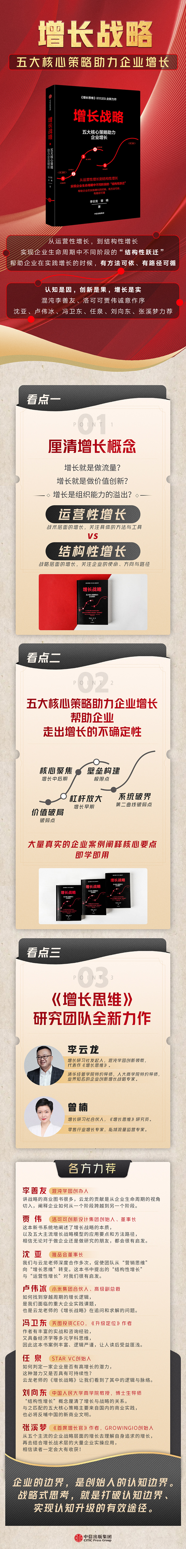 《增长思维》是我们团队在中信出版集团出版的第一本书,内容以运营性增长为主。为了保持连贯性,本书第一章“增长的本质”会接续一些和运营性增长有关的内容。从第二章至第六章,则是为结构性增长匹配的5 个核心策略:价值破局、杠杆放大、核心聚焦、壁垒构建、系统破界。