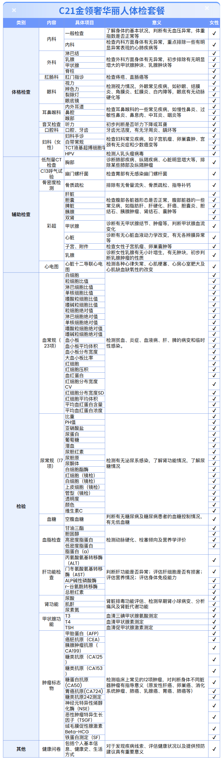 【女性 | 金领奢华丽人】含HPV/TCT+甲功3项+C13+十二项肿瘤标志物 C21