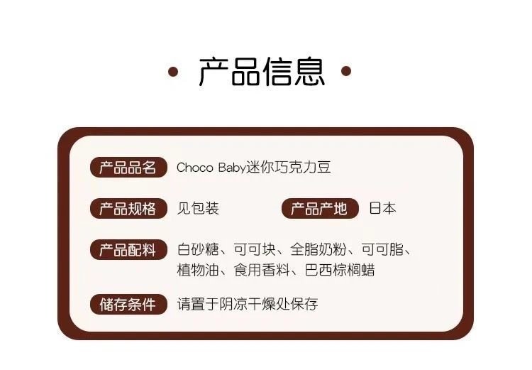 【品名】日本明治CHOCO BABY牛奶巧克力豆 【产品规格】小盒:32g 【赏味期】效期到26年7月 【发货时间】72小时 【快递说明】三通一达不指定 【不配送区域】新疆、西藏 注意事项:收到货后,请冷藏后再吃口感更佳,如高温地区造成表面轻微融化,不影响食用,介意慎拍,感谢理解 【售后说明】 1.产品发出不支持无理由拒收拦截撤单改地址 2.如出现异常情况,请带面单+产品拍照+产品包装照片与我们联系,我们会第一时间处理,如产品有质量问题可在收货24小时之内,联系客服进行售后或者补发