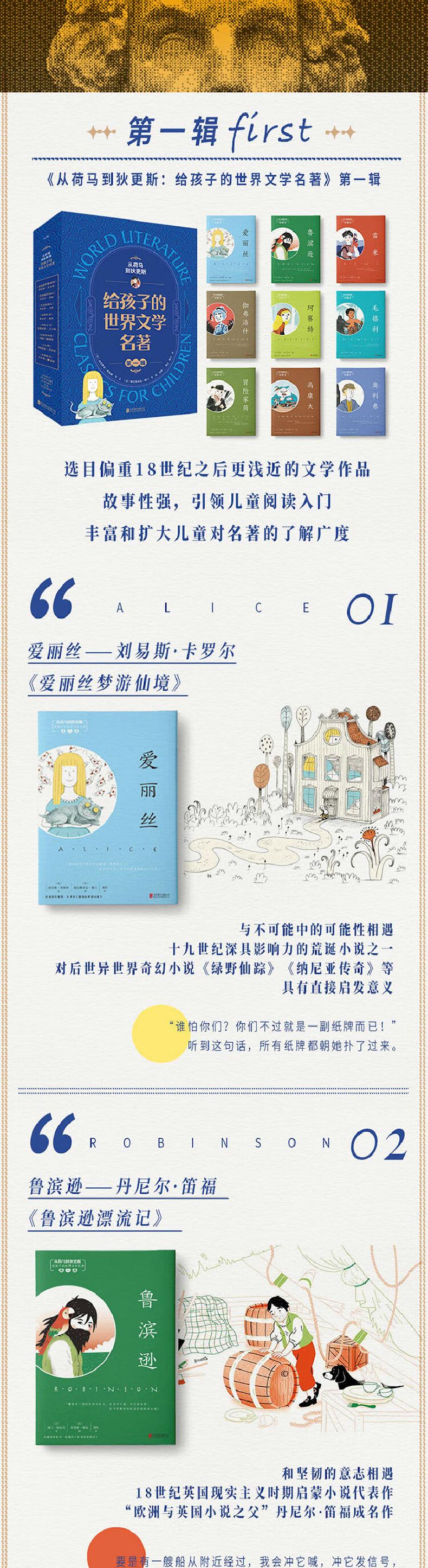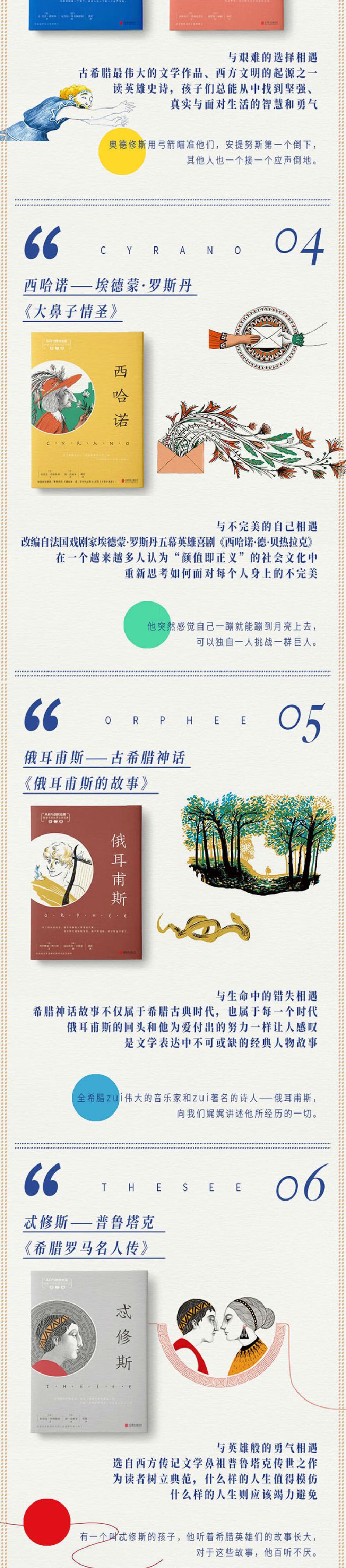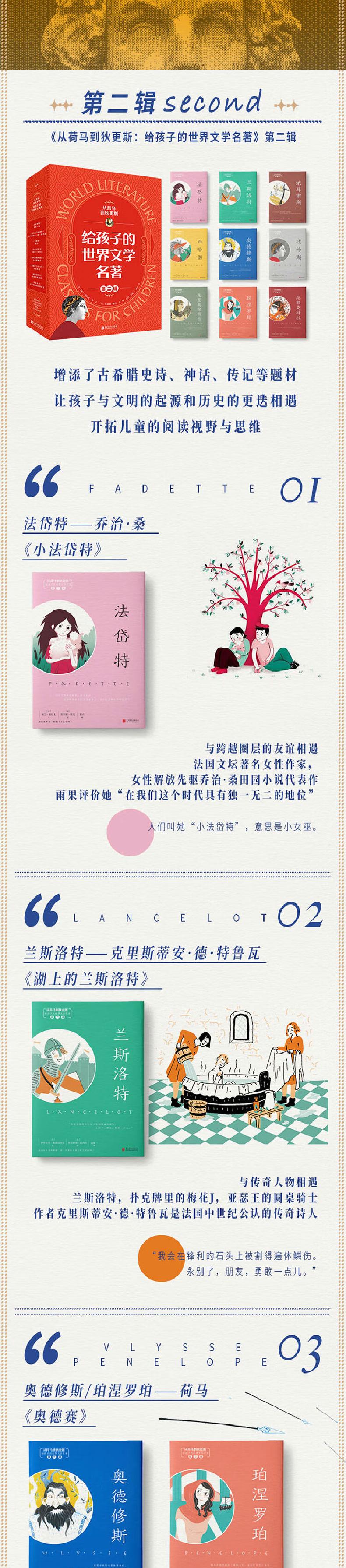 2. 选目编排:本书一辑9本偏重18世纪之后时间线更浅近的文学作品,难度和故事更贴近儿童理解力,故事性强,更易阅读,旨在丰富和扩大儿童对名著的阅读广度。本书第二辑依照循序渐进的认知规律,把时间线拉到公元前,增添了古希腊史诗、神话、传记等题材,让孩子与文明的起源和历史的更迭相遇,开拓儿童的阅读视野。