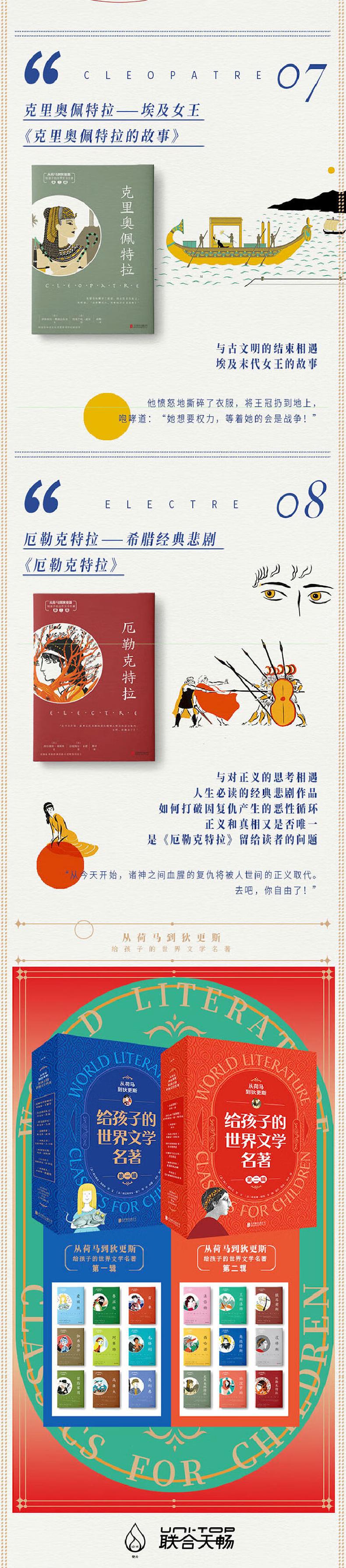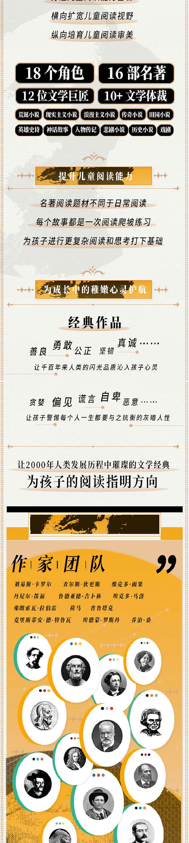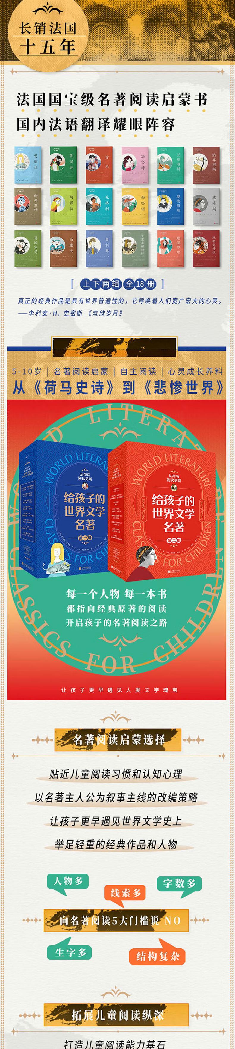 2. 选目编排:本书一辑9本偏重18世纪之后时间线更浅近的文学作品,难度和故事更贴近儿童理解力,故事性强,更易阅读,旨在丰富和扩大儿童对名著的阅读广度。本书第二辑依照循序渐进的认知规律,把时间线拉到公元前,增添了古希腊史诗、神话、传记等题材,让孩子与文明的起源和历史的更迭相遇,开拓儿童的阅读视野。