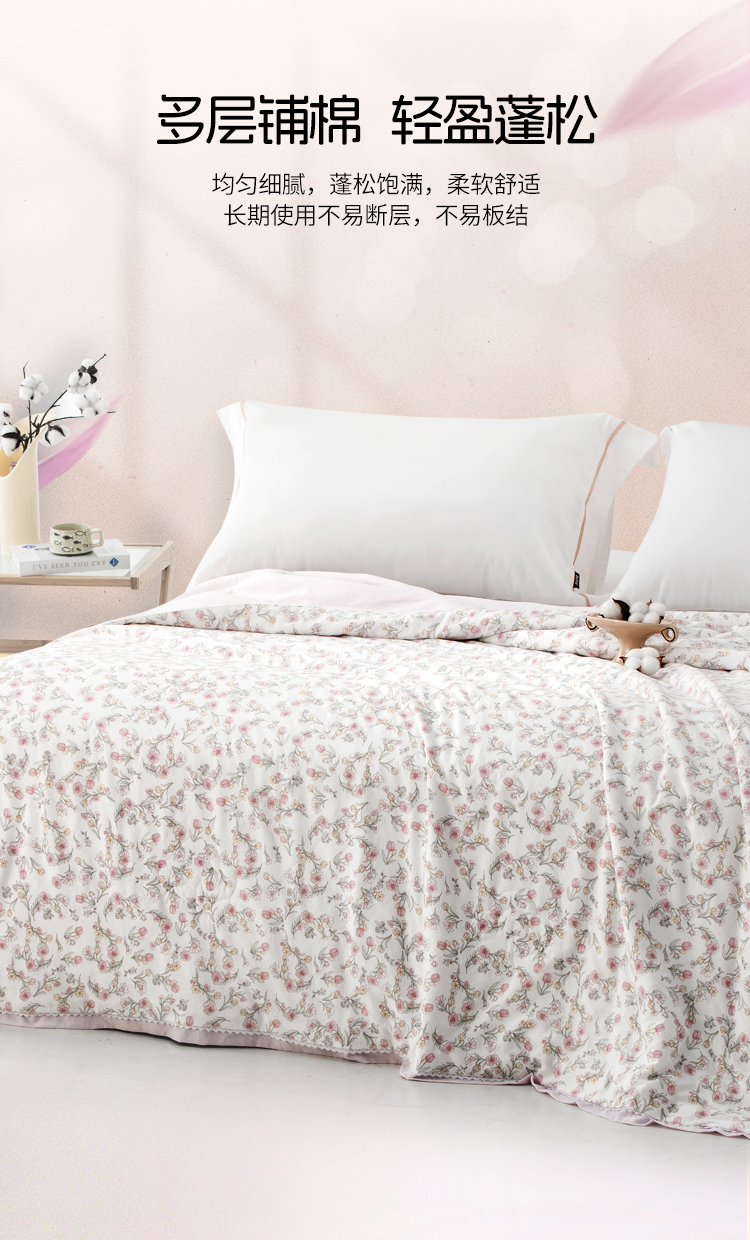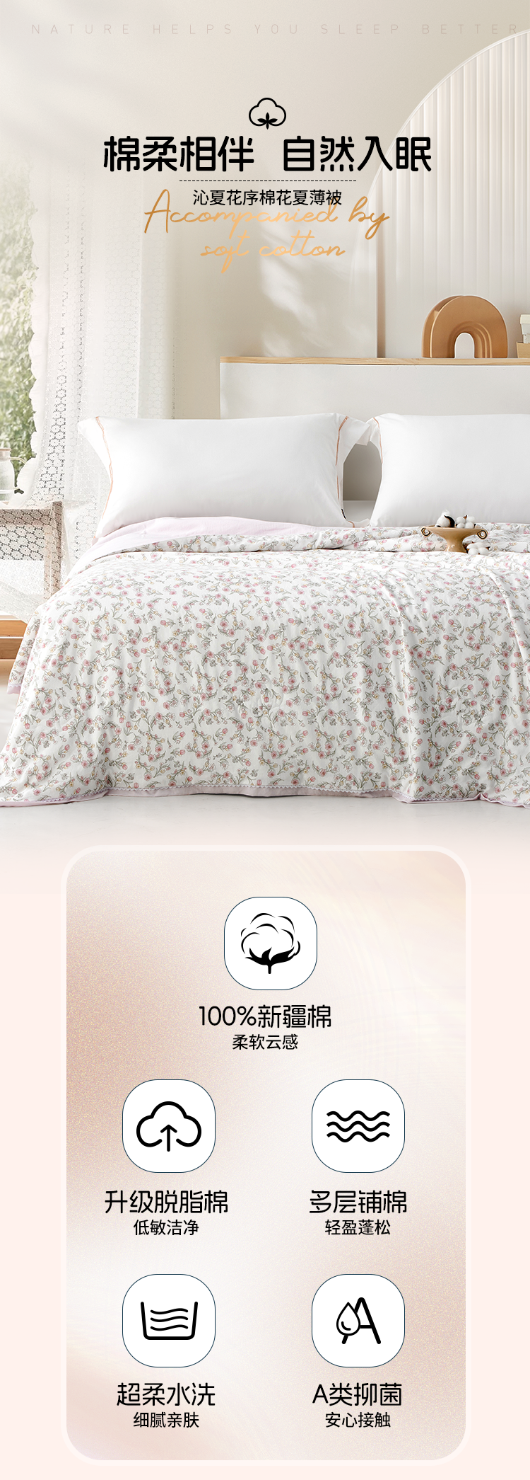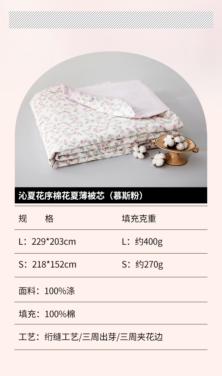 【会员专享】多喜爱 沁夏花序棉花夏薄被芯/空调被(慕斯粉)【花边&出芽】【100%新疆棉】【升级脱脂棉】【提花面料】【A类抑菌】多层铺垫超柔水洗
