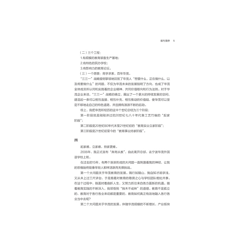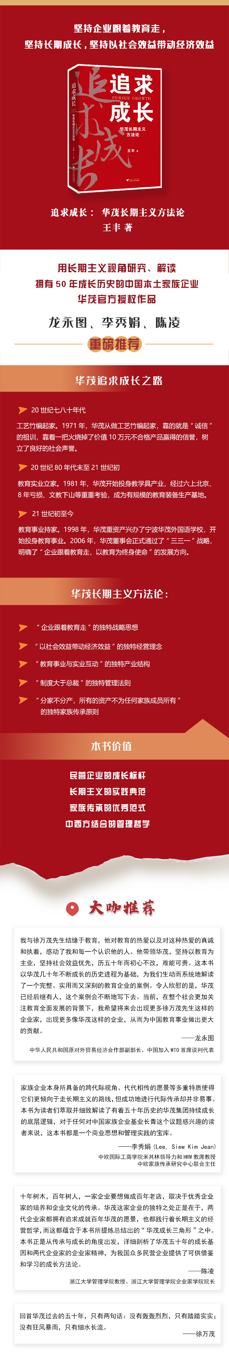50年的华茂,是中国民营企业中有数的长寿企业,这50年中,华茂经历过政策变化、转型变革、传承接班等,却依然坚定地沿着教育为主业的方向迈进,并不断成长,是中国当下的企业成长标杆和典范。华茂是如何成长以及依靠什么持续成长的?这个问题的答案,值得所有企业借鉴。