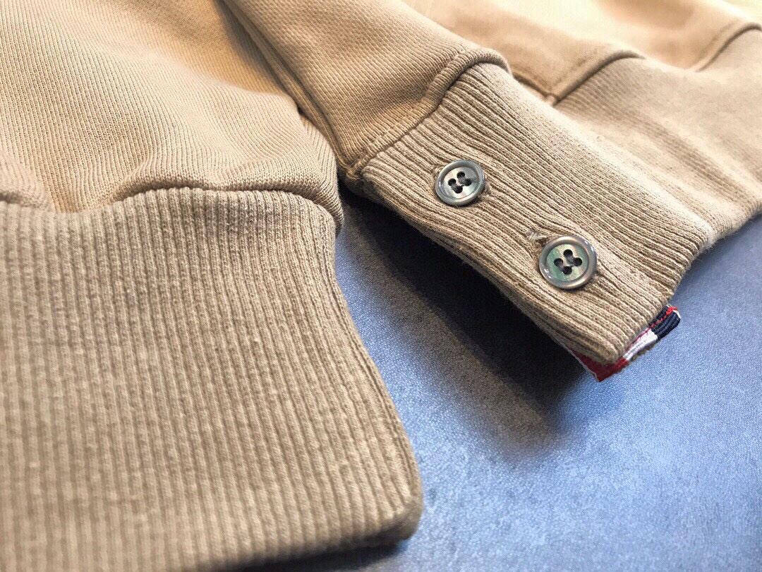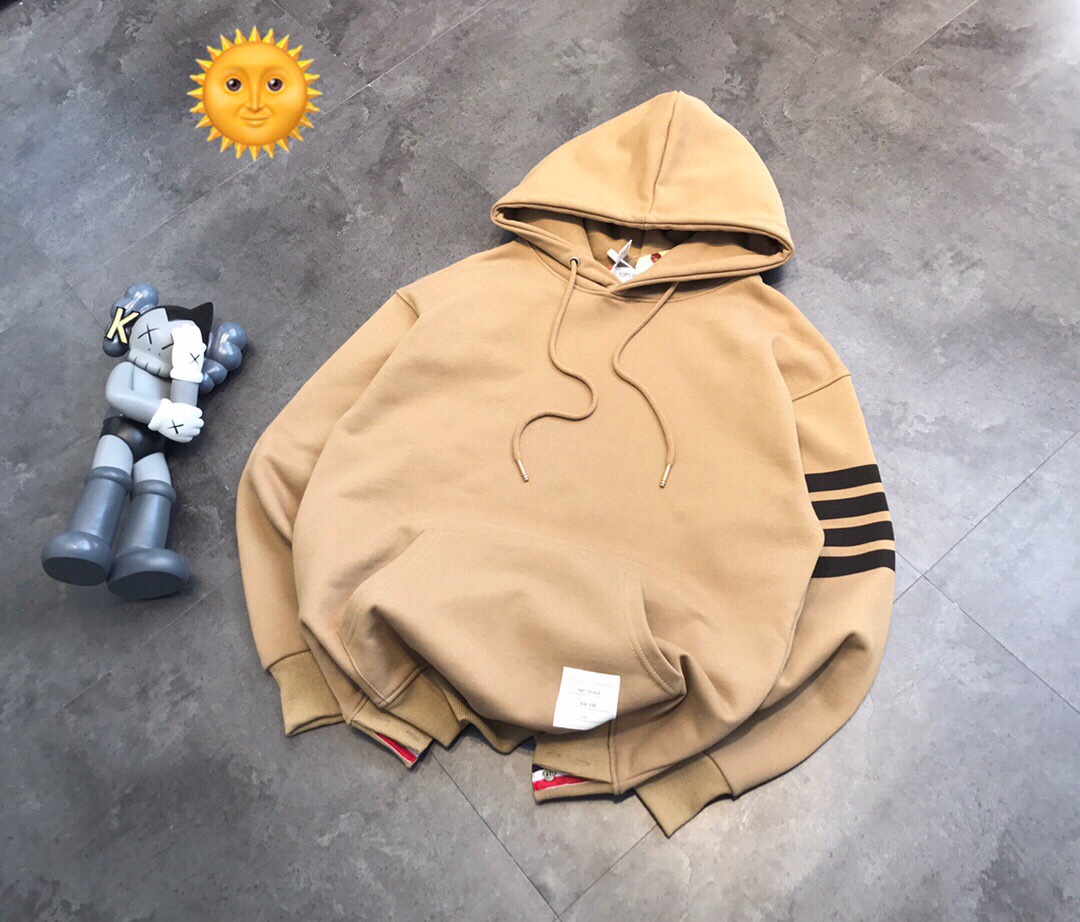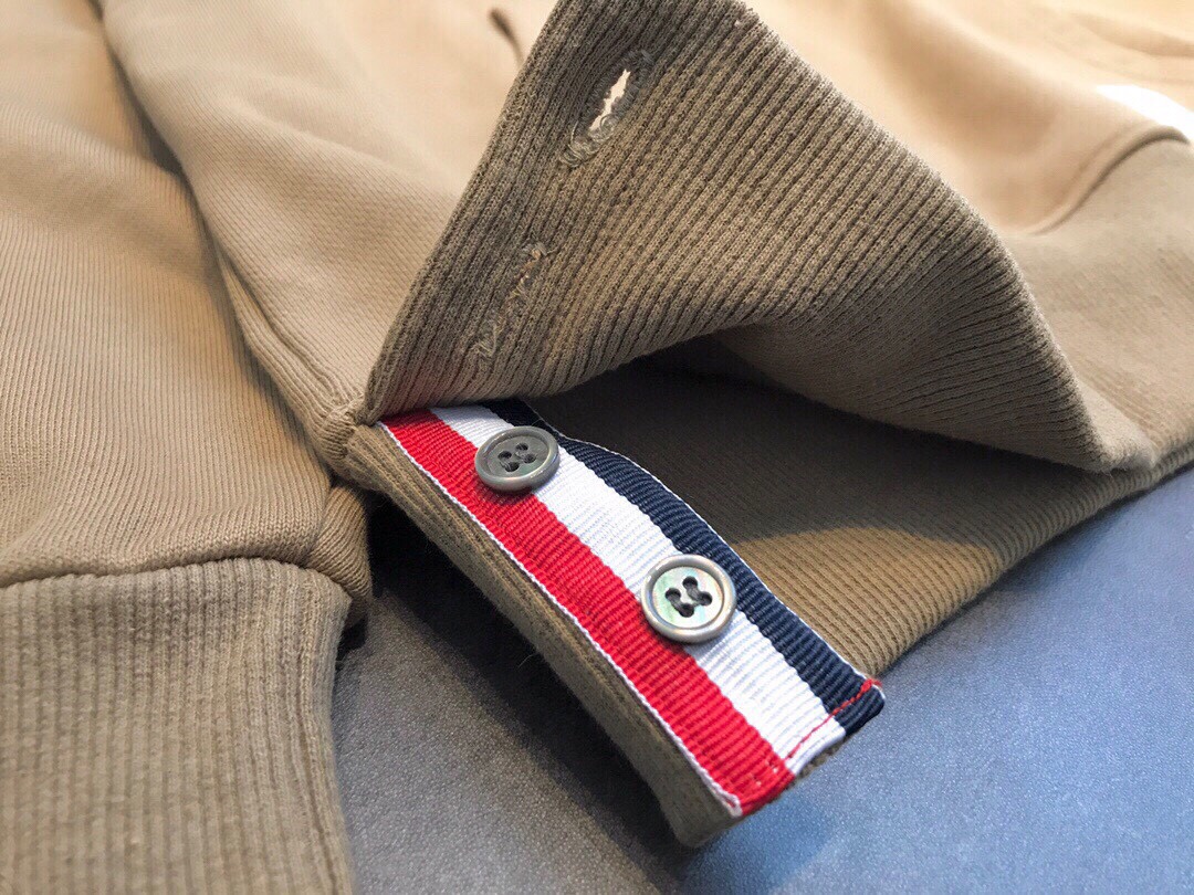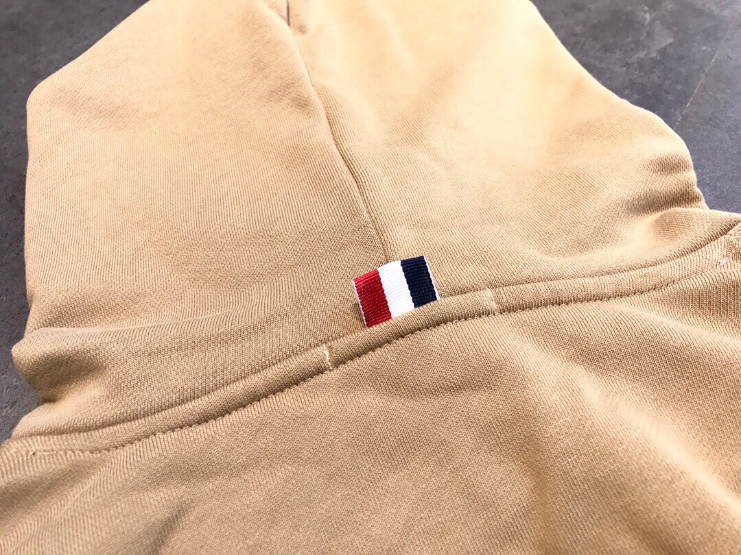 130 货号115733130 ks 🌞潮~TB卡色加绒🔥连帽 上身太好看了 面料原色定织定染高克面料 上身相当舒服 袖子地方区分胶印版本 这个深进去印的相当有质感立体 衣服左右下摆都是彩条加贝壳纽扣 衣服口袋上面经典的羊皮标 配色袖口底边 面料定织定染420G加绒舒服 男女同款 尺寸m L
