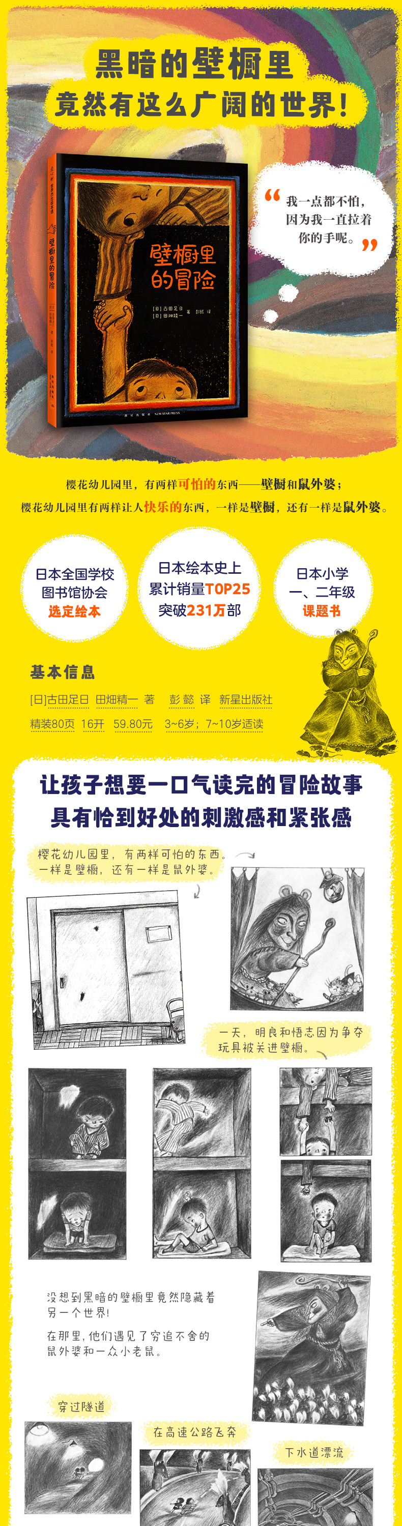 樱花幼儿园里有两样可怕的东西,一样是壁橱,另一样是鼠外婆。***,明良和悟志因为争夺玩具被关进壁橱。没想到黑暗的壁橱竟然变成了一条隧道,通往另一个世界。在那里,他们遇见了可怕的鼠外婆,两个人手拉着手,展开了一场大汗淋漓的奇妙冒险……