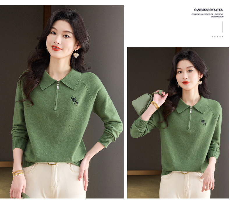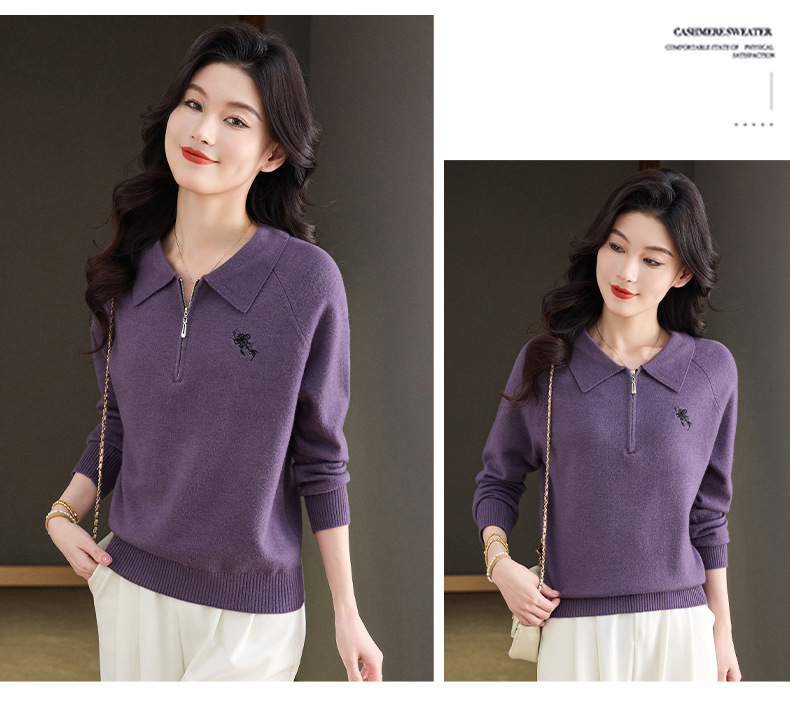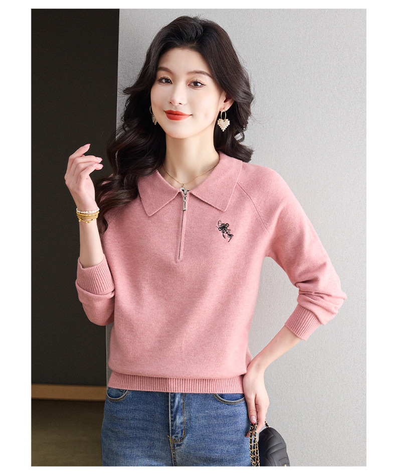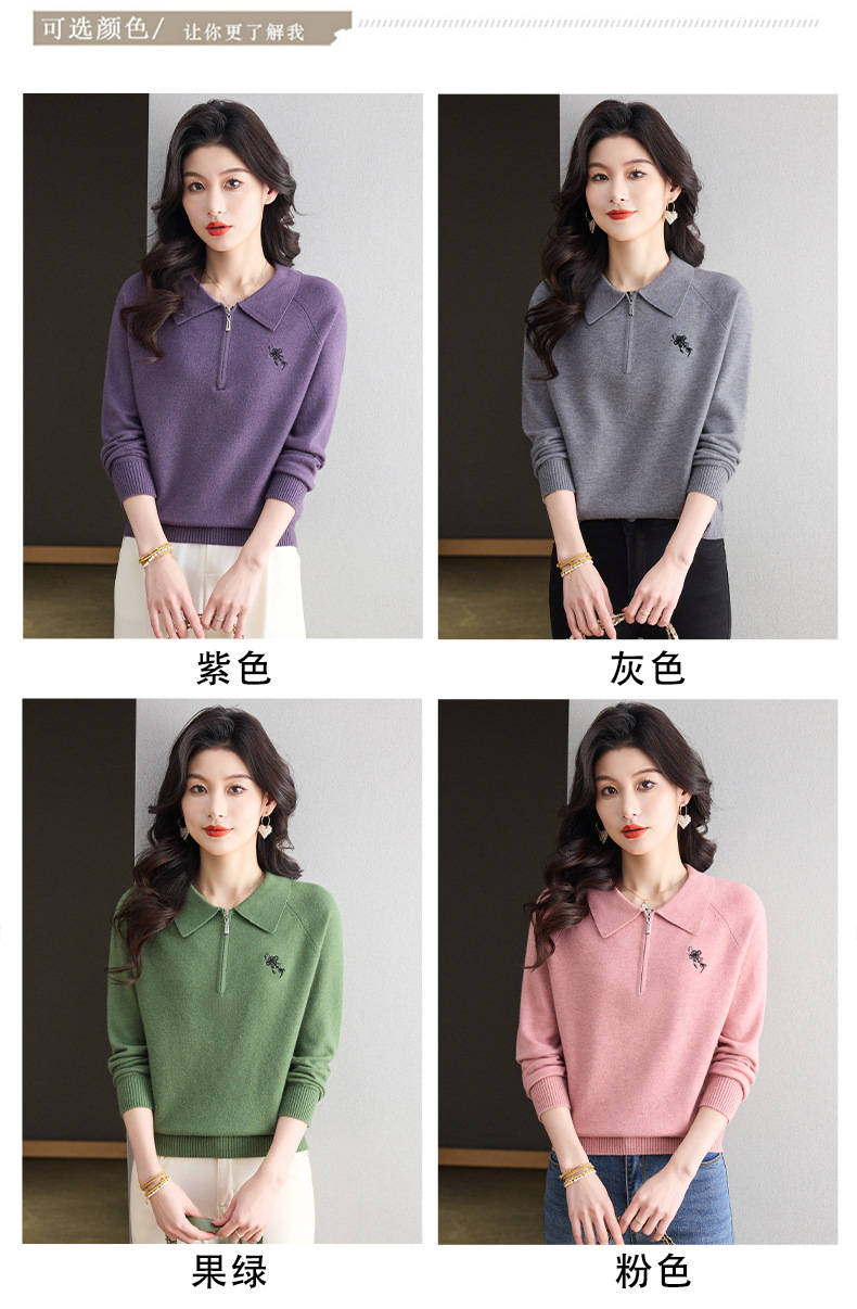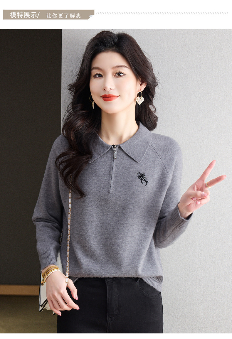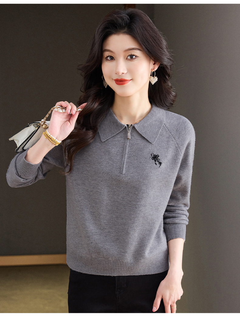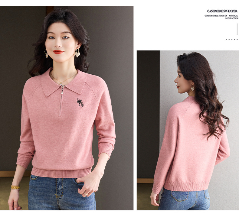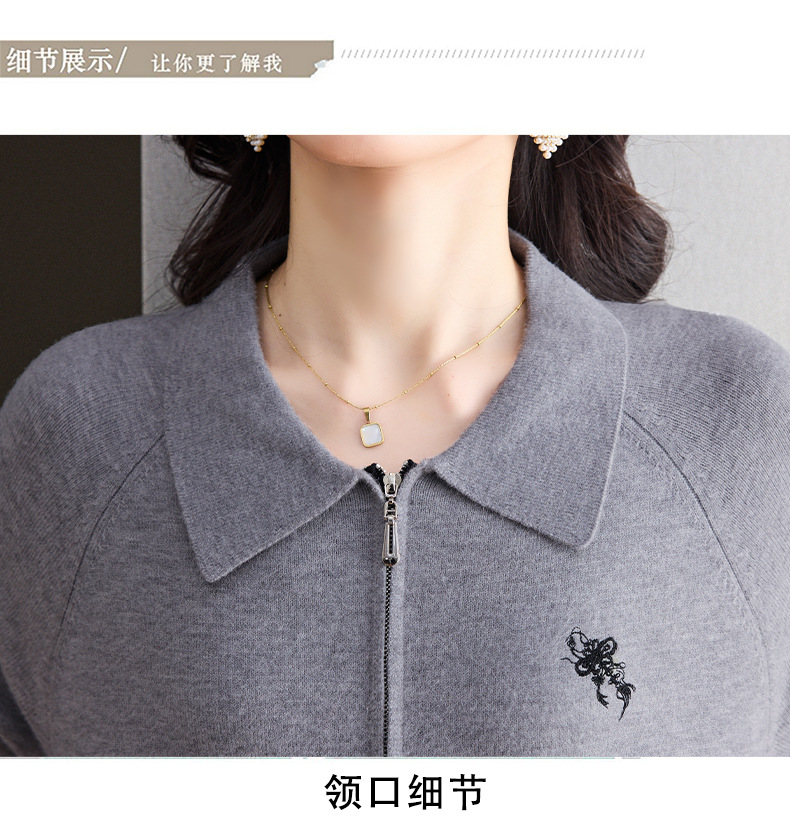 CC-101-82057娃娃翻领针织长袖t恤女士2025春秋季新款洋气拉链打底衫刺绣上衣T
