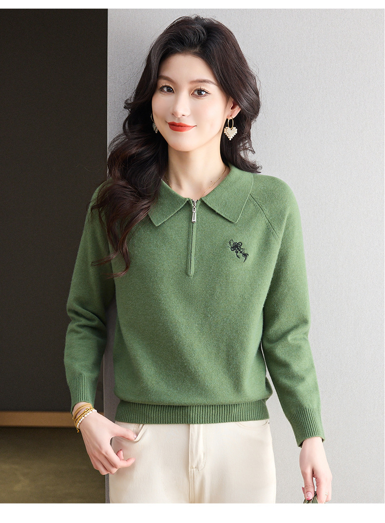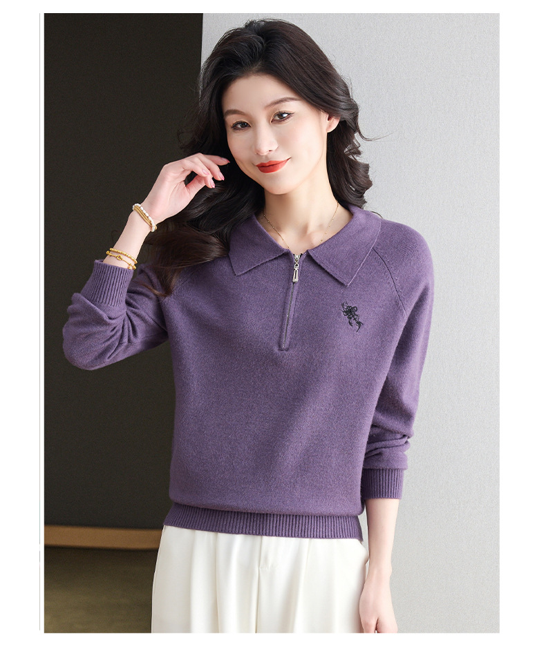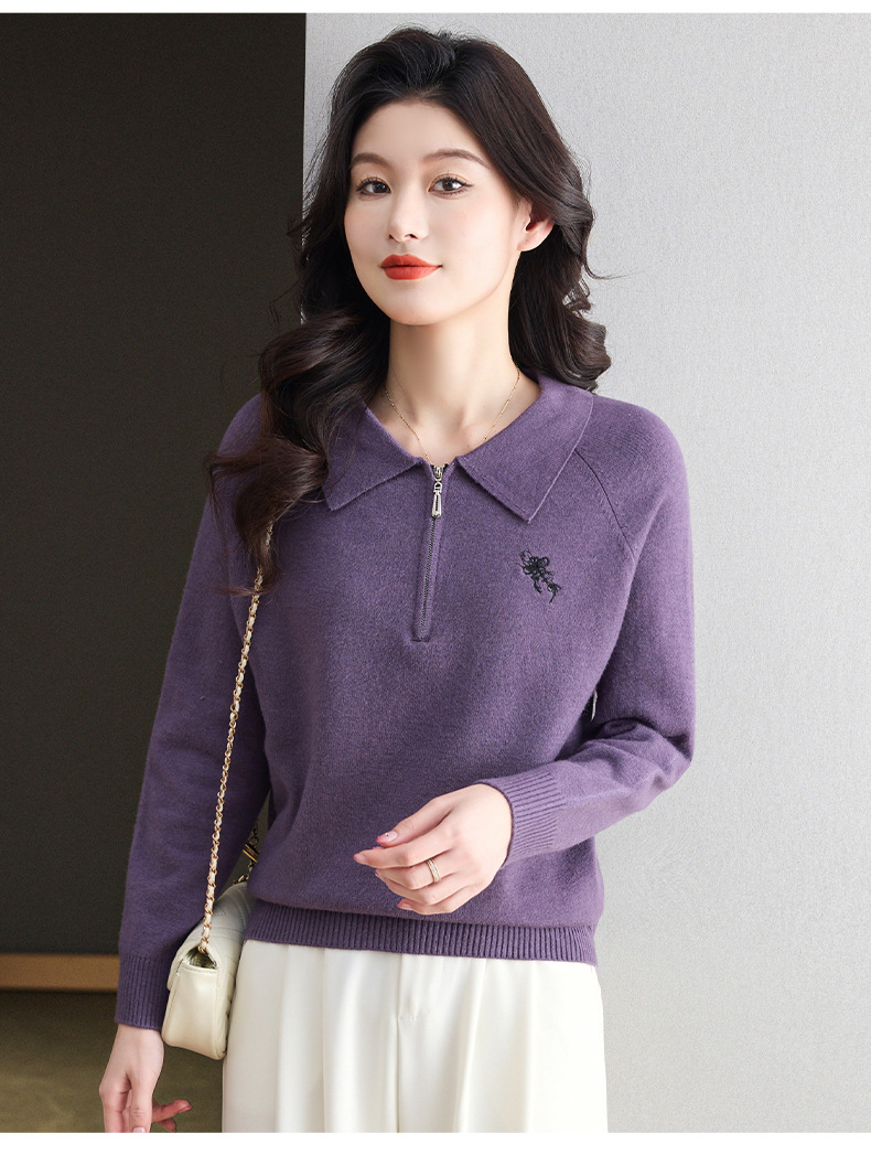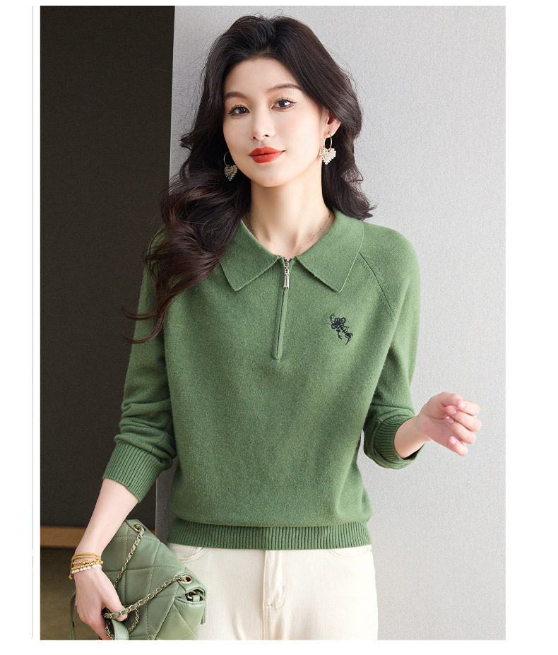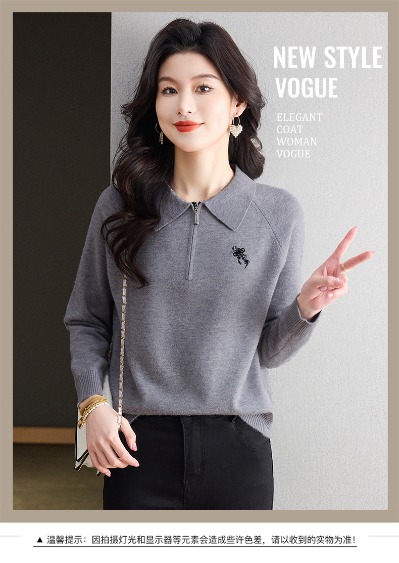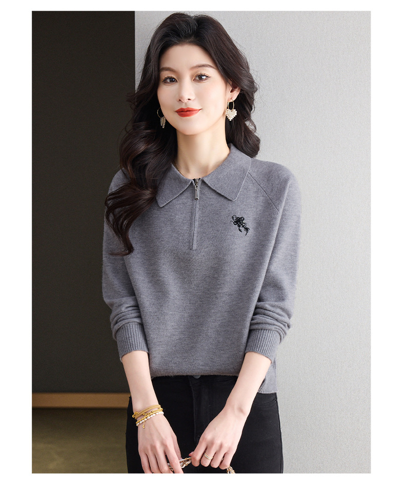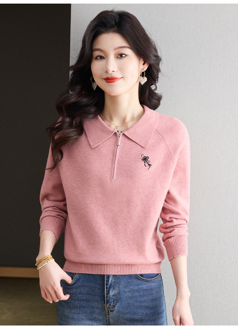 CC-101-82057娃娃翻领针织长袖t恤女士2025春秋季新款洋气拉链打底衫刺绣上衣T