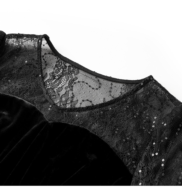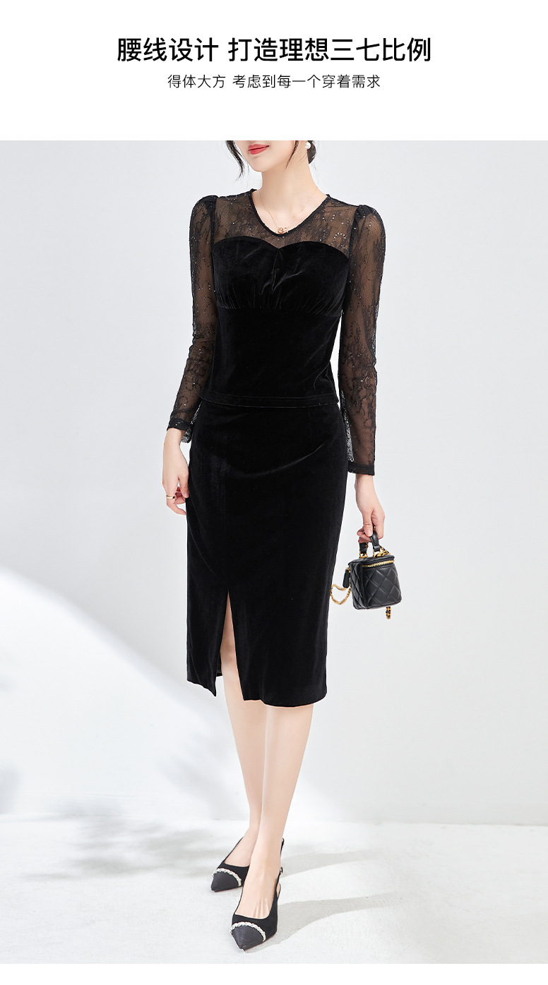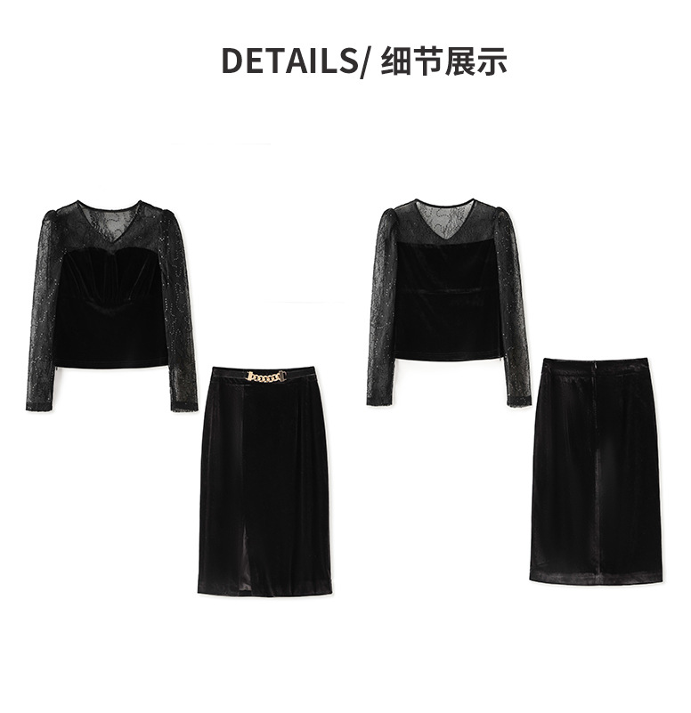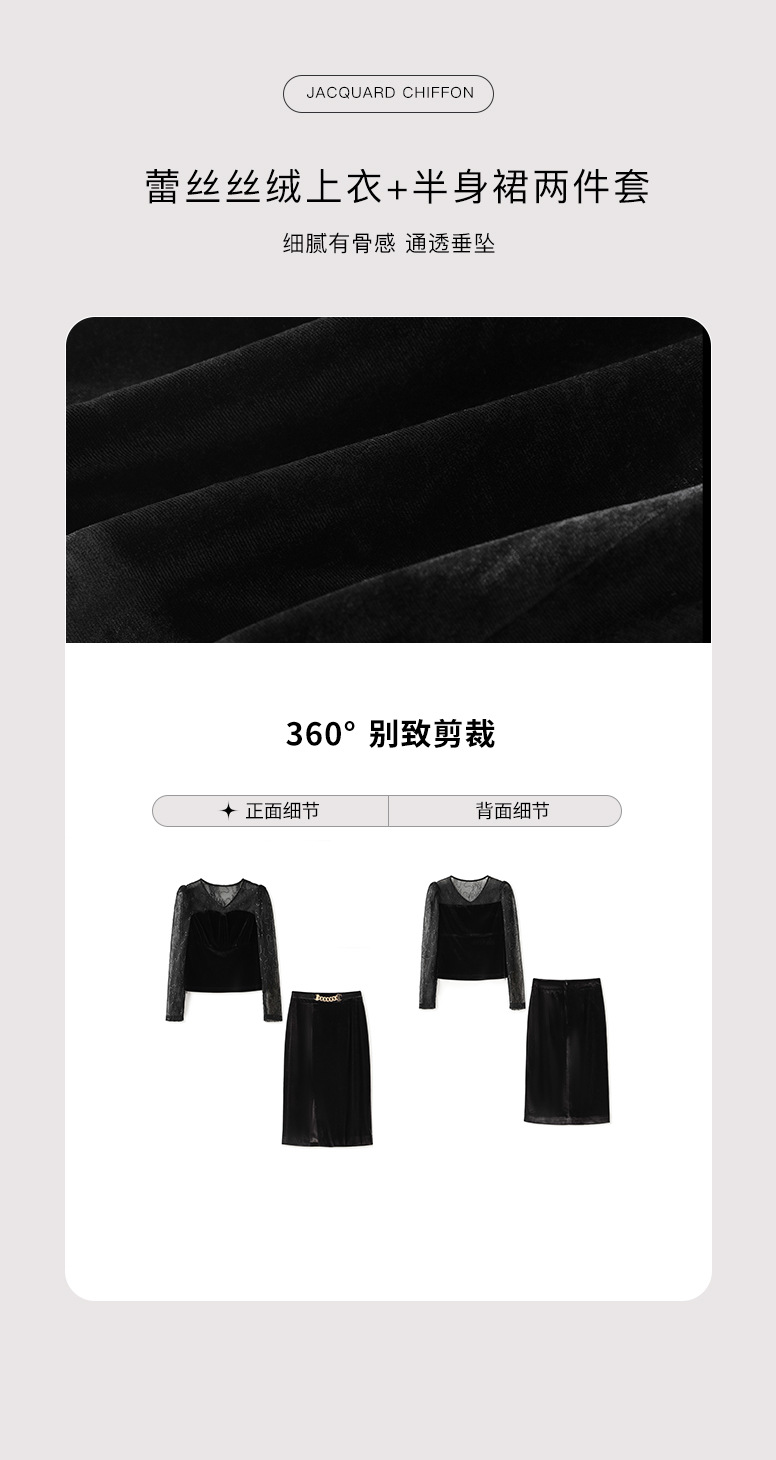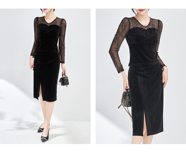 法式显瘦,丝绒拼亮片蕾丝上衣+高腰开叉半身裙两件套WLZD-2405110