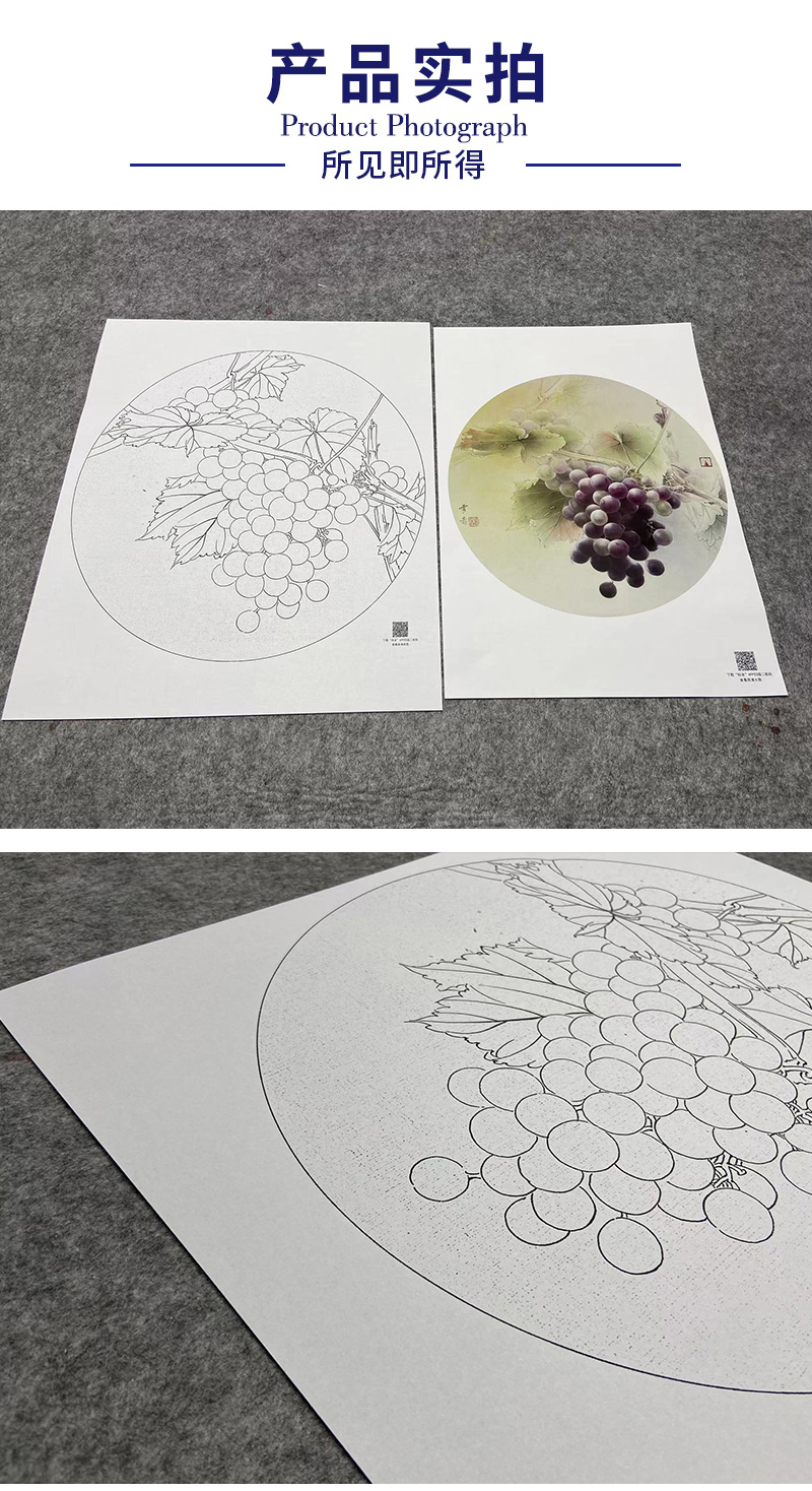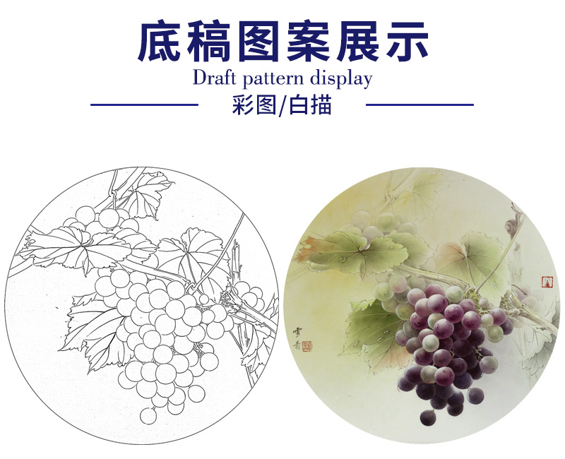 【大彩图】龚雪青工笔画白描底稿圆形小品《葡萄》临摹勾线花鸟线稿XQ07