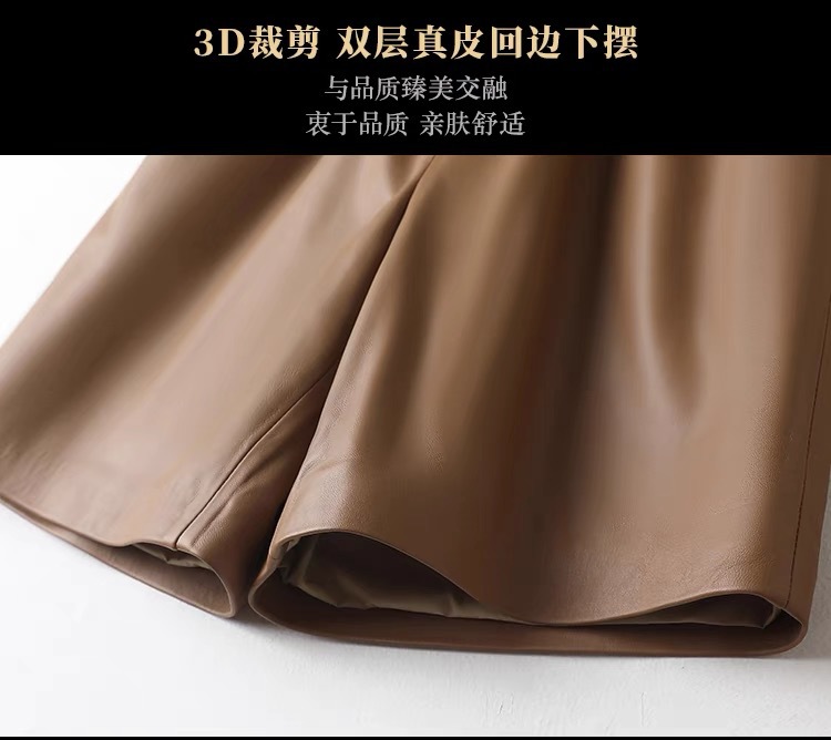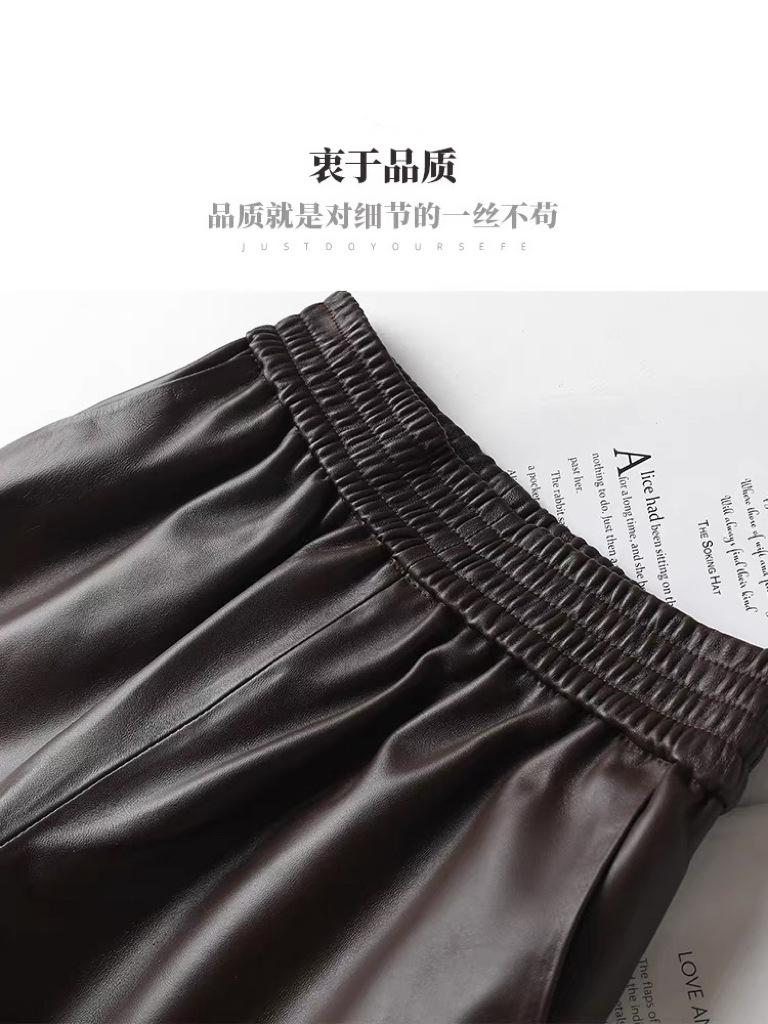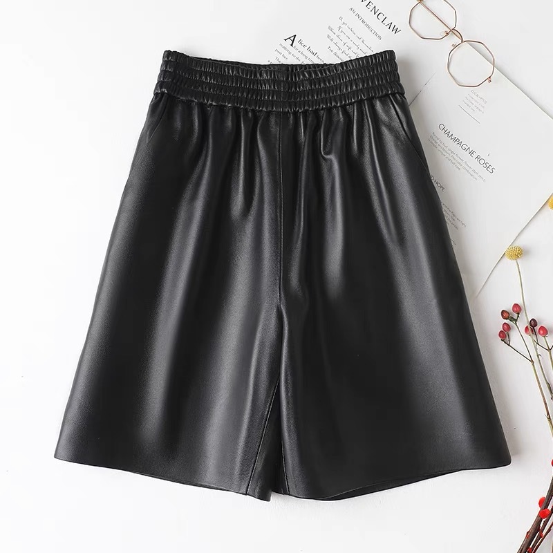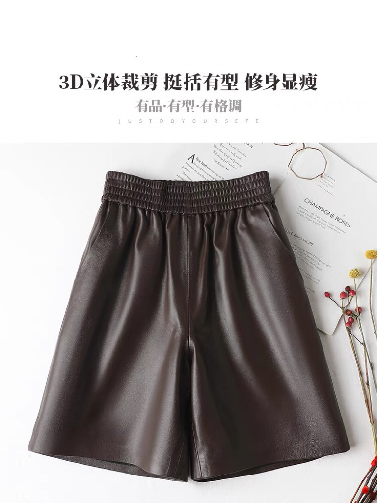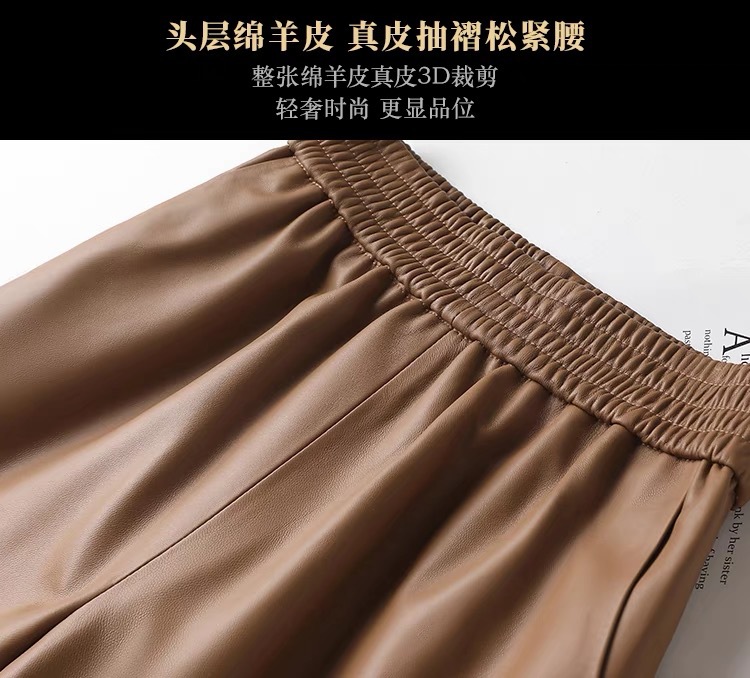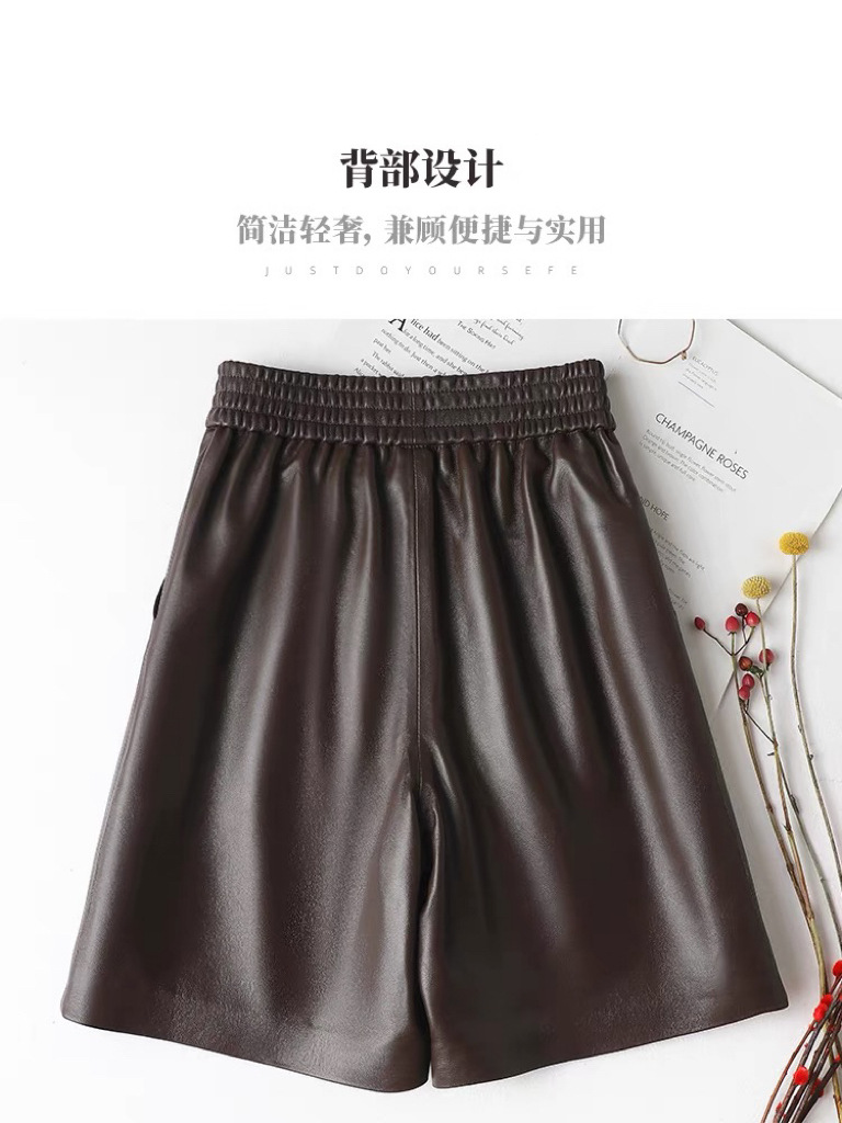 丁摩 真皮中裤女秋冬新款高腰松紧阔腿五分裤休闲皮裤子