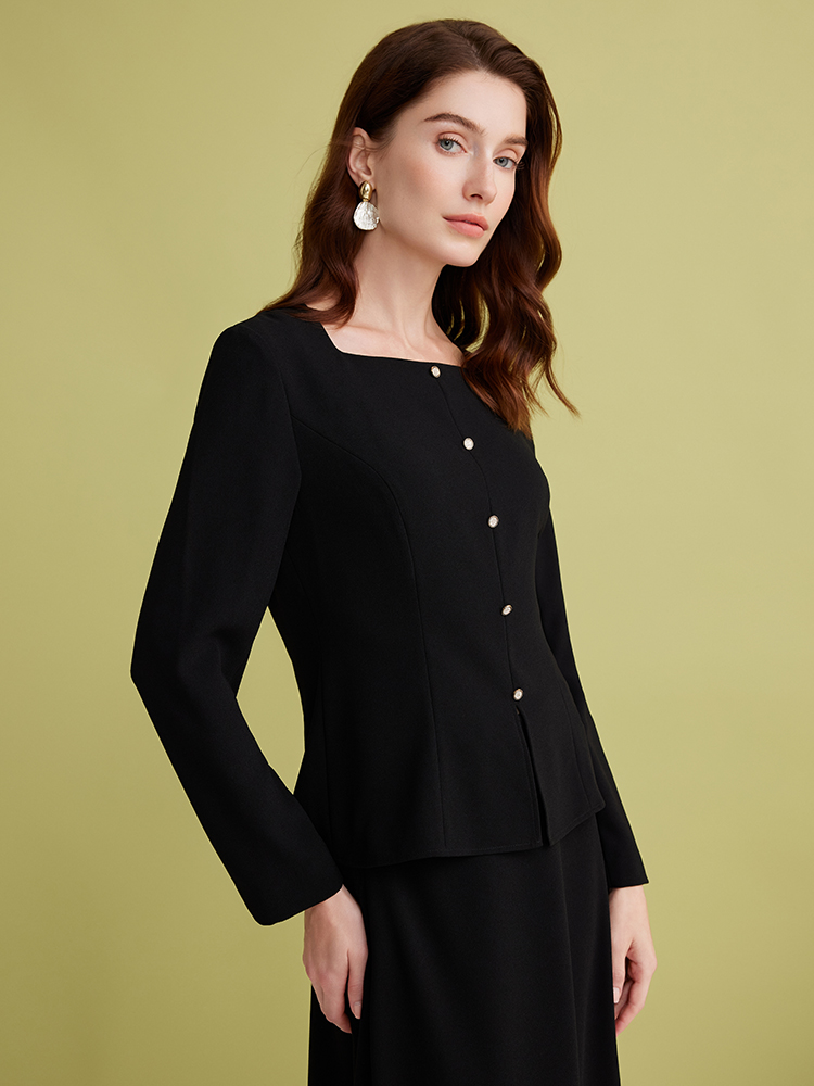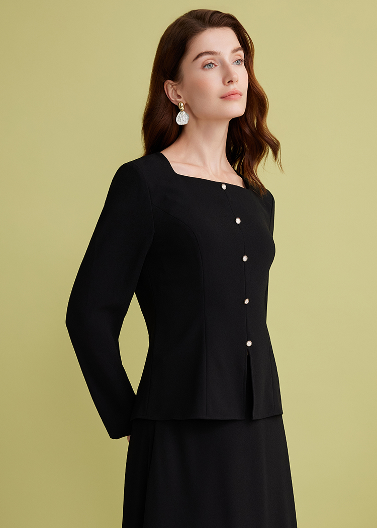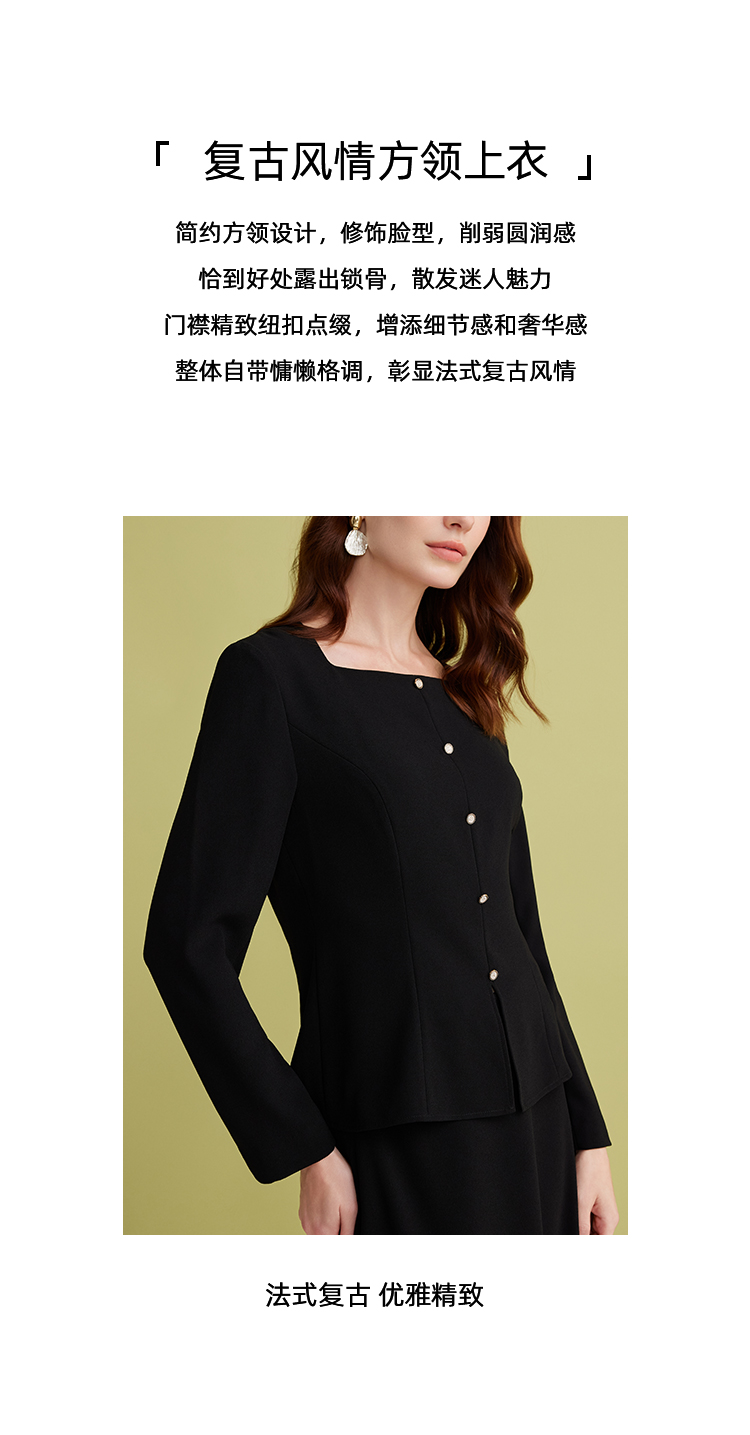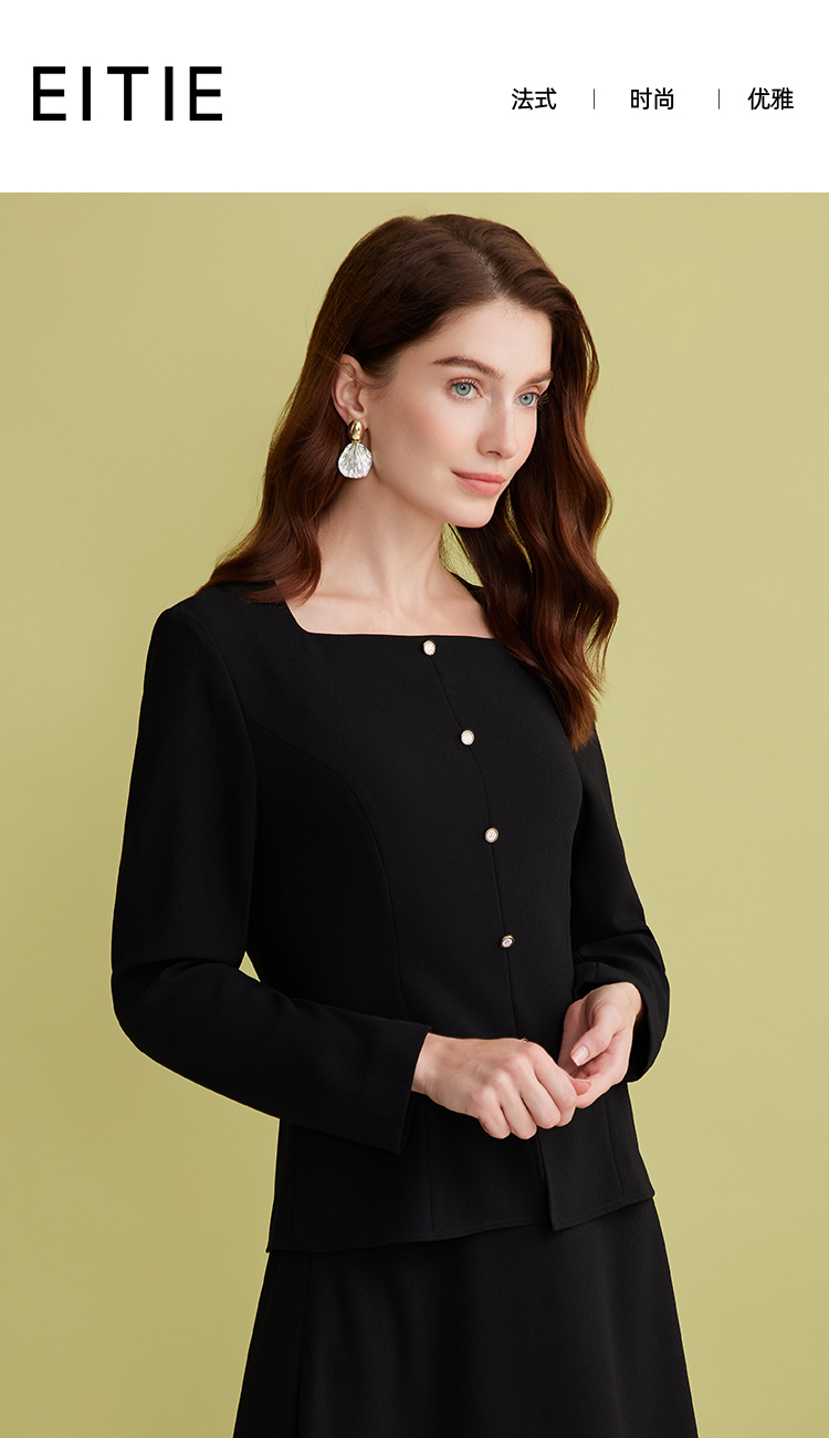 EITIE爱特爱复古气质方领收腰显瘦百搭黑色通勤上衣2025春季新款A2513517