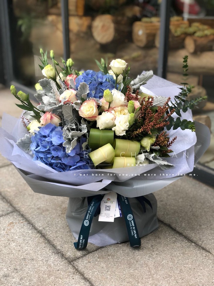 商品详情:蓝色绣球,珍爱玫瑰。山里红,剑叶,尤加利叶,洋桔梗,银叶菊,双层半开放式包装。花束高48厘米。宽40厘米。