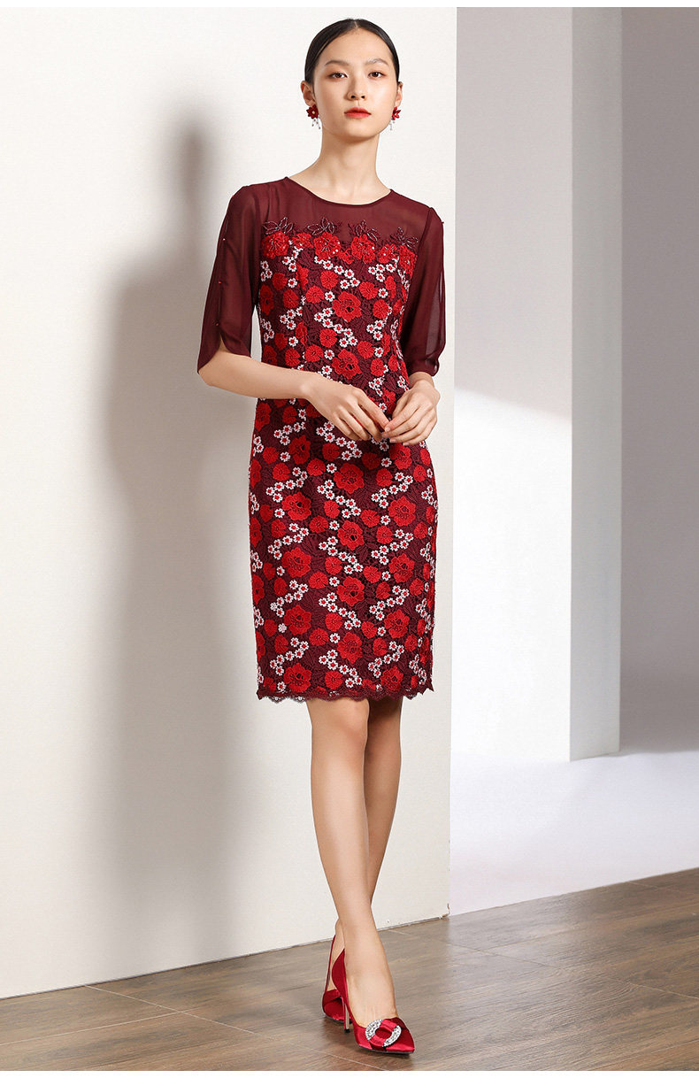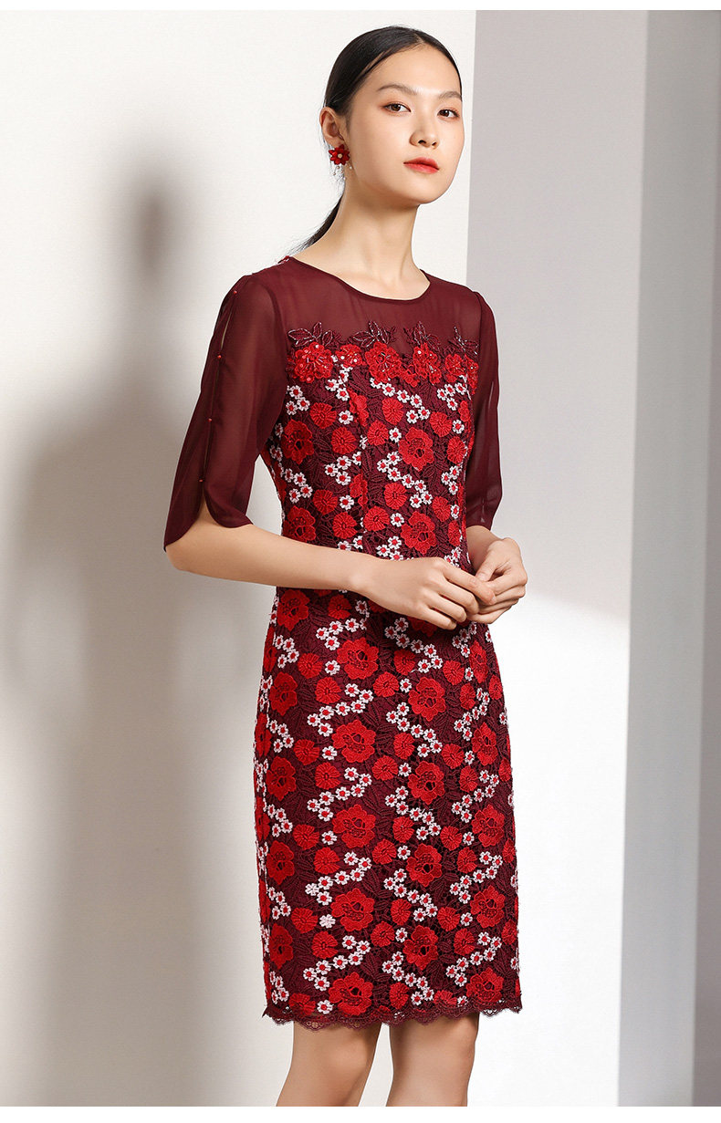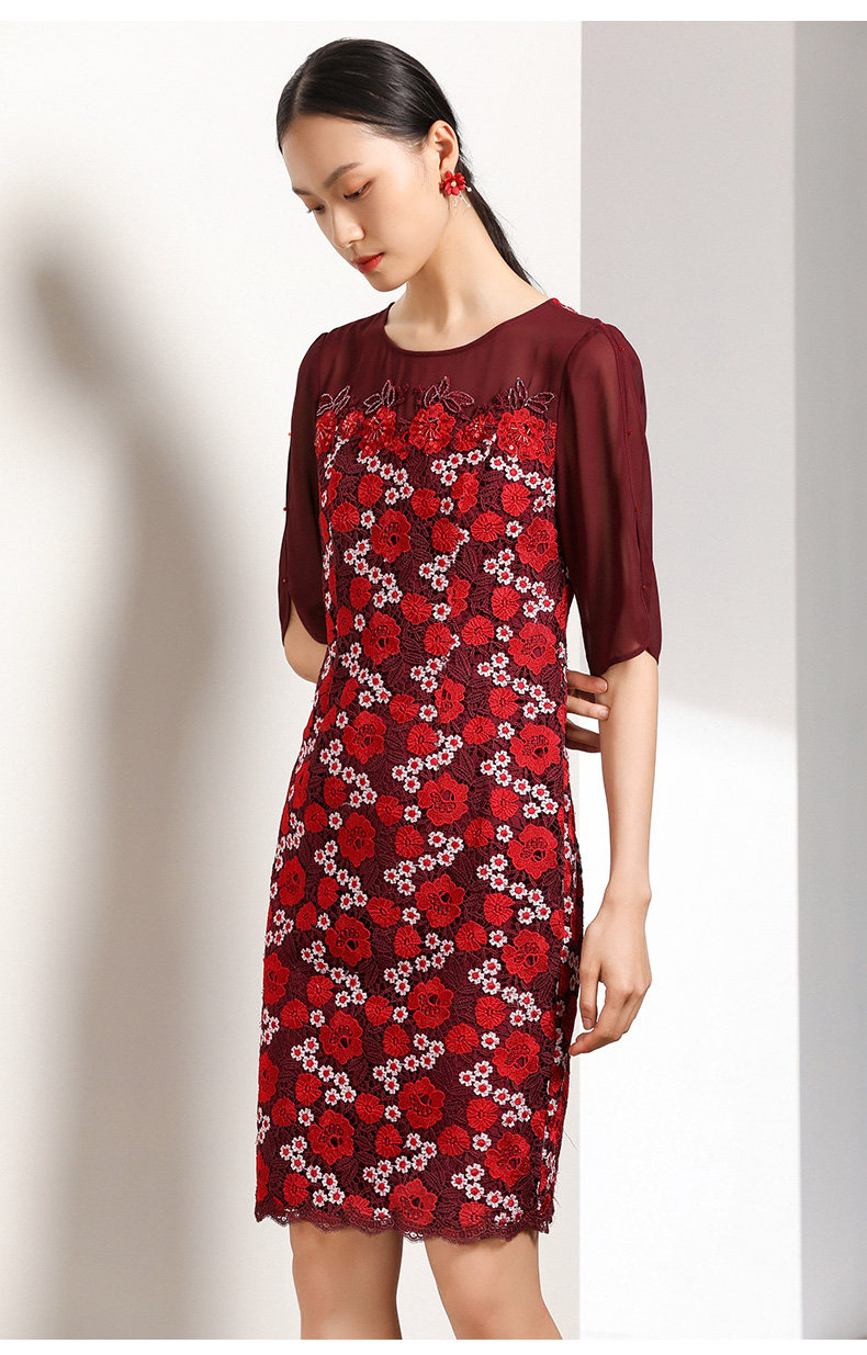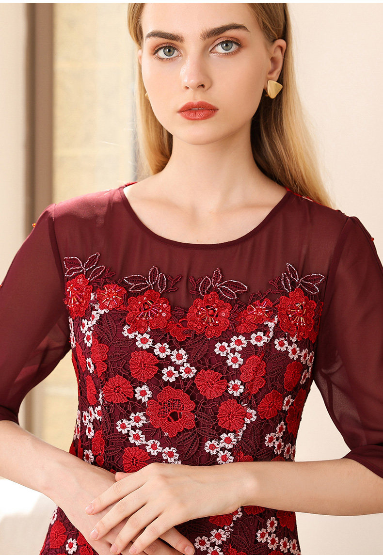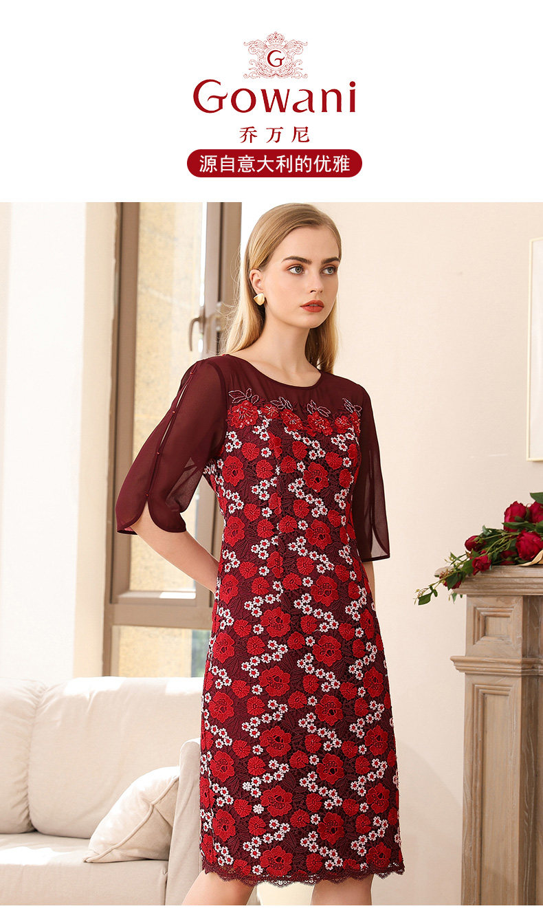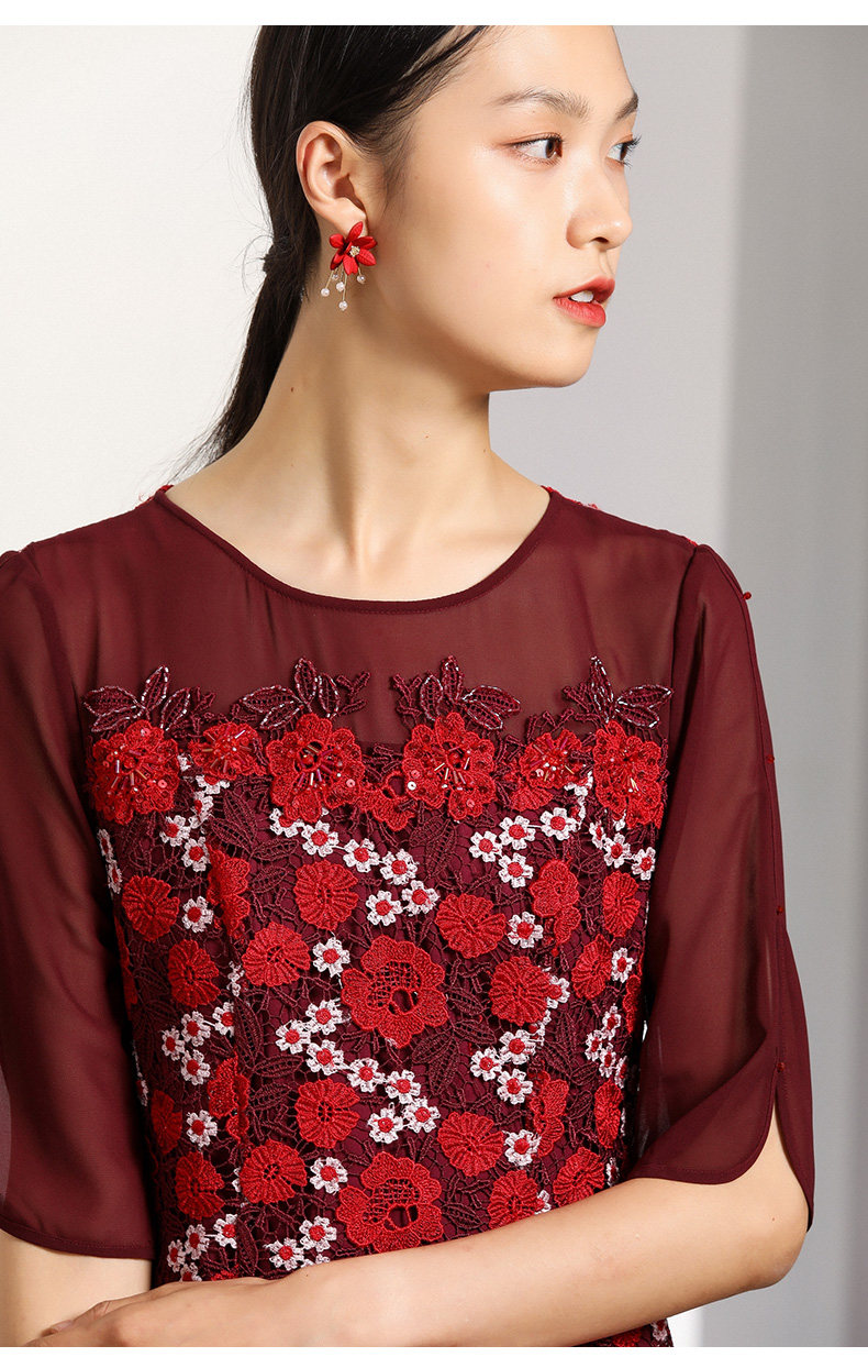 乔万尼秋装红装礼服刺绣花朵中袖连衣裙女中长EN3E367