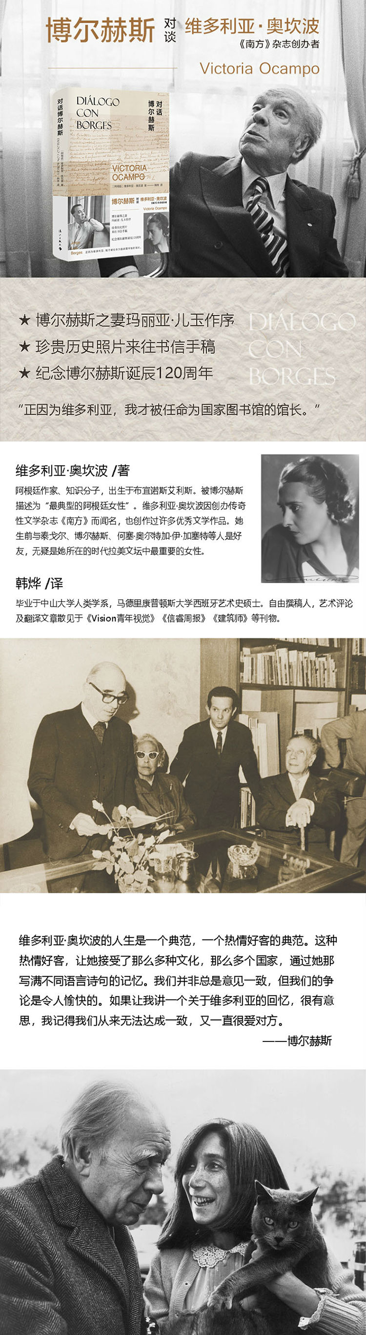 维多利亚·奥坎波因创办传奇性文学杂志《南方》(Sur)而闻名于世,也创作出版过许多优秀文学作品,无疑是她所在的时代拉美文坛中重要的女性。《对话博尔赫斯》精心记录了维多利亚·奥坎波与博尔赫斯之间的谈话历史,包括珍贵的历史照片与二人来往的书信手稿。本书首次引进中国,由博尔赫斯的妻子玛丽亚·儿玉作序,弥足珍贵。