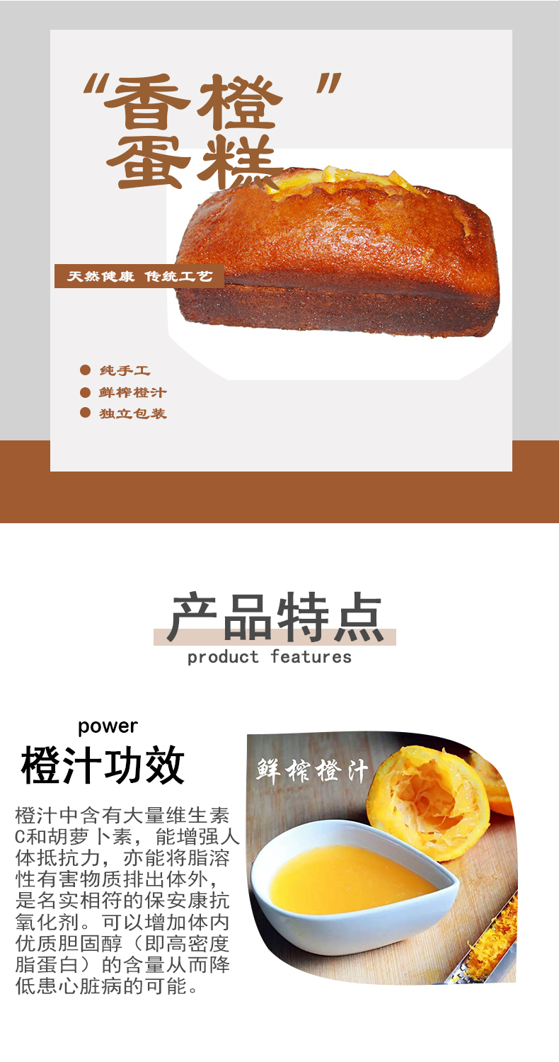 用纯手工鲜榨橙汁制作,口感香甜,无其他添加剂,健康又美味,老少皆宜。