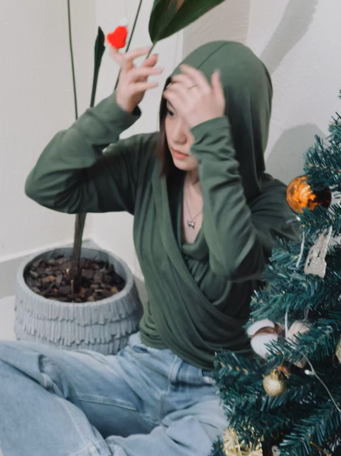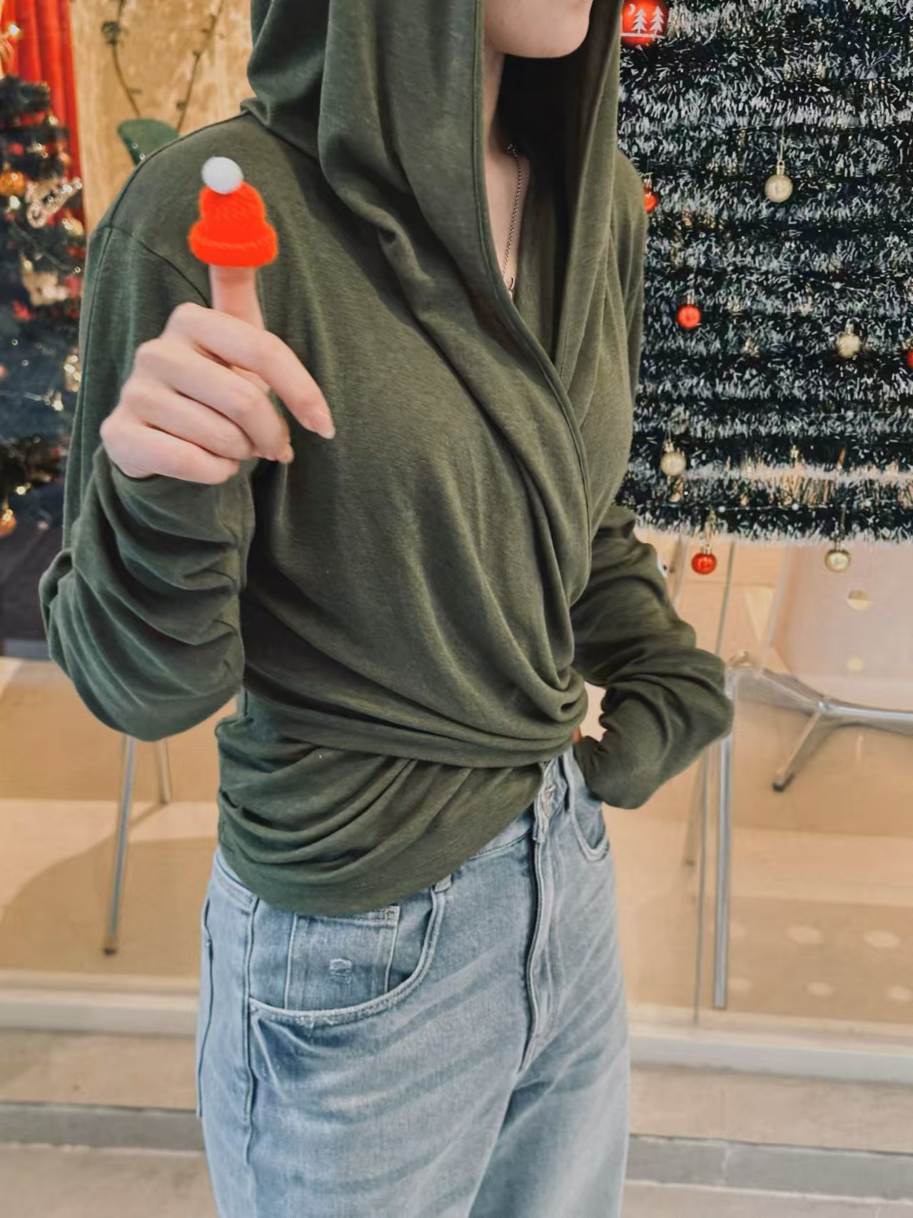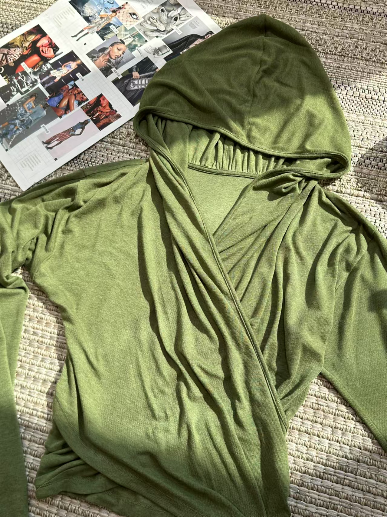 顺丰包邮42059洛诗琳柔软牛油果绿色垂褶连帽小衫220340