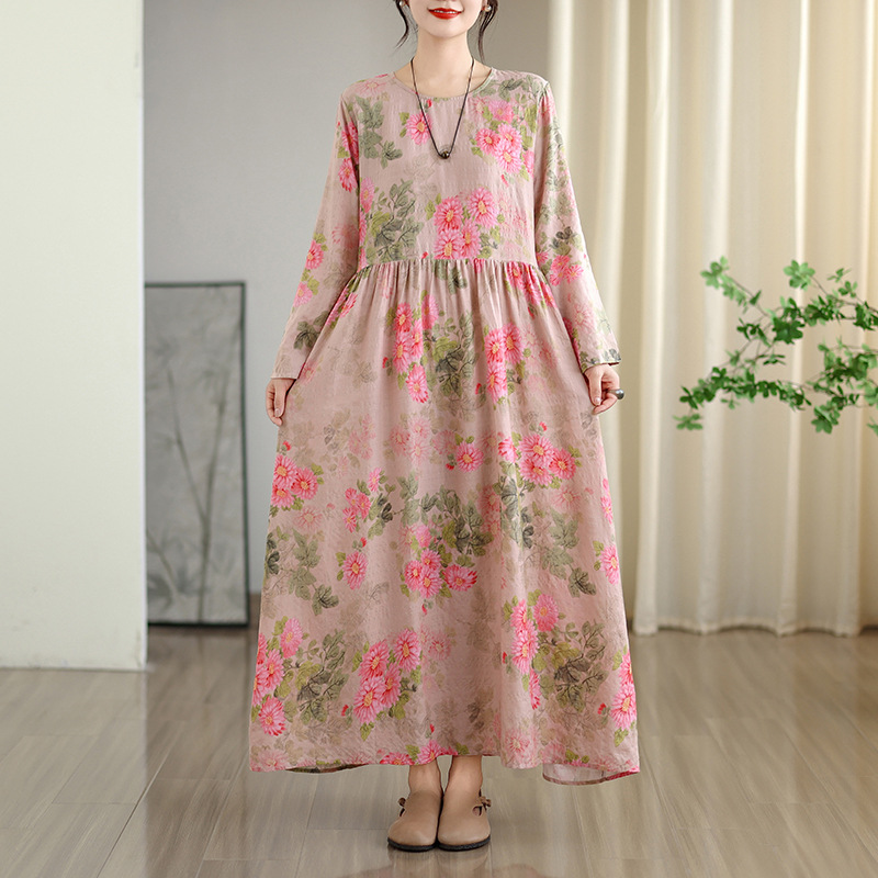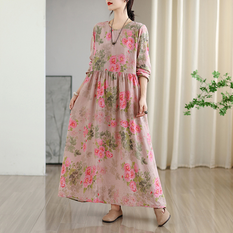 雀说 宽松大码女装印花度假风圆领文艺复古长款连衣裙