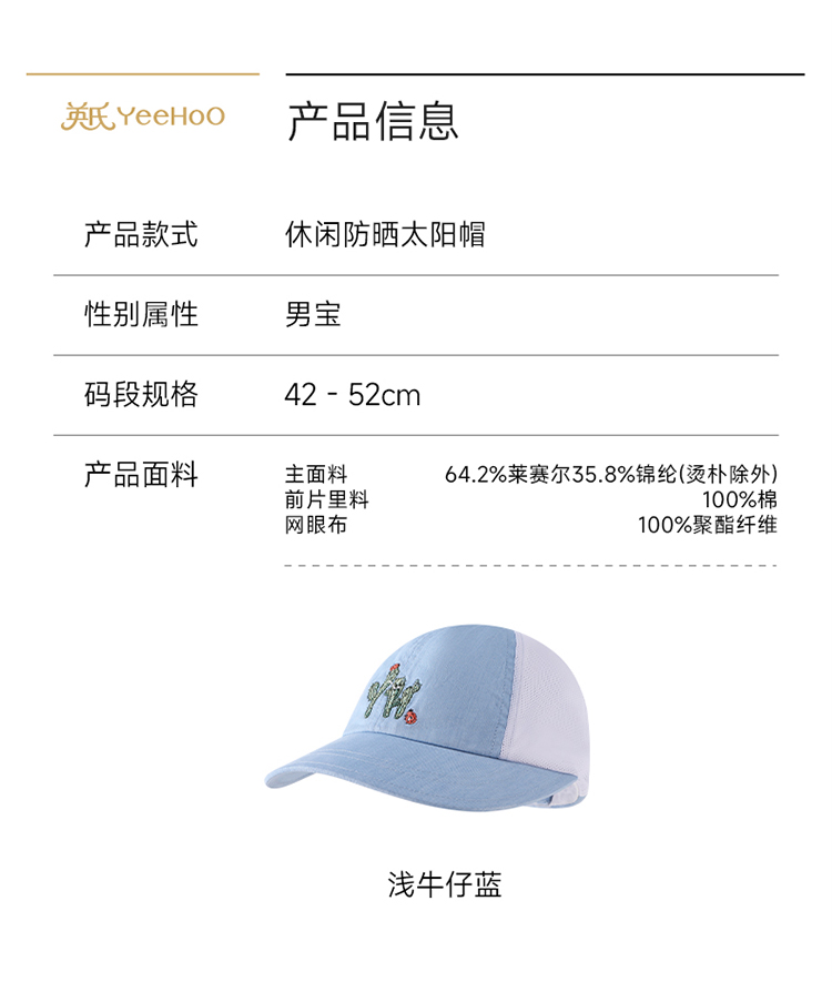 【商场同款】英氏儿童帽子男童夏季防晒鸭舌帽透气百搭遮阳帽子