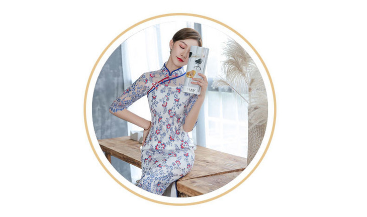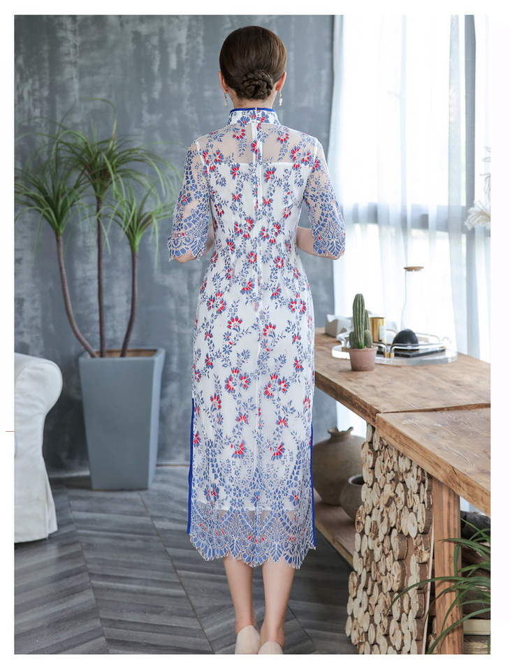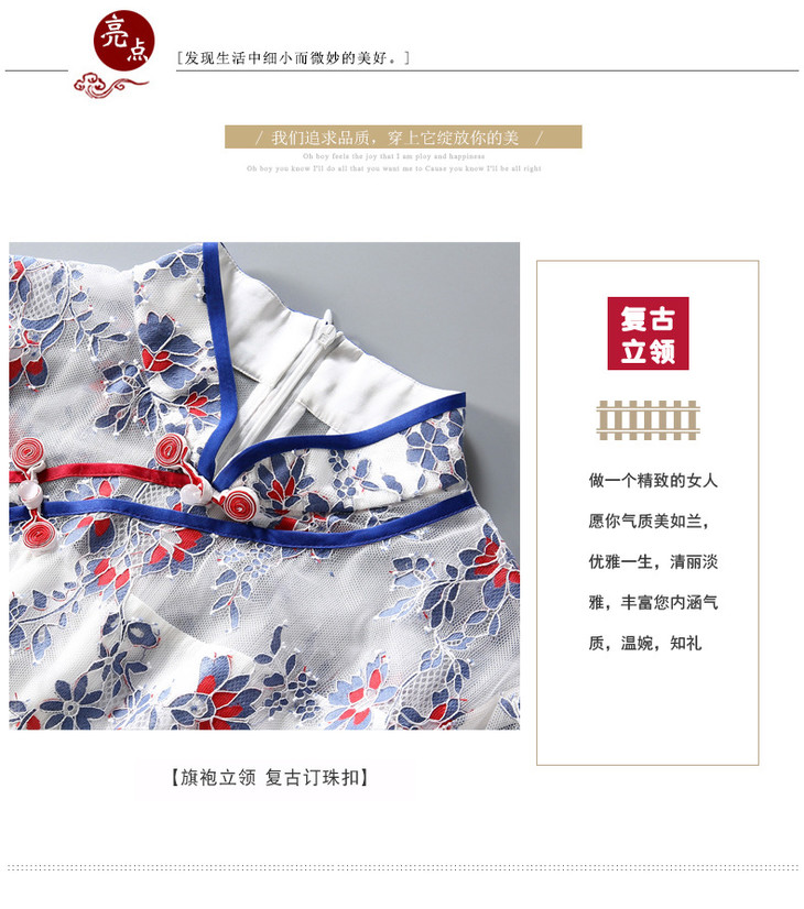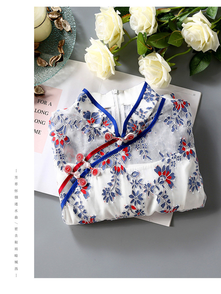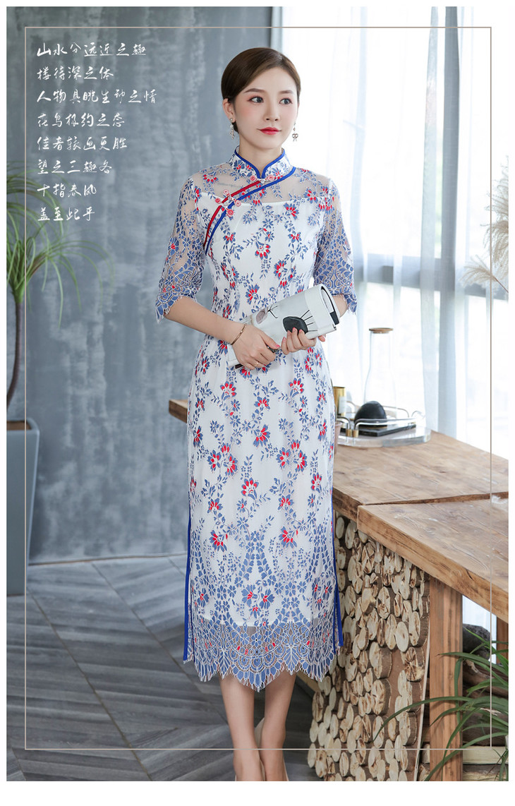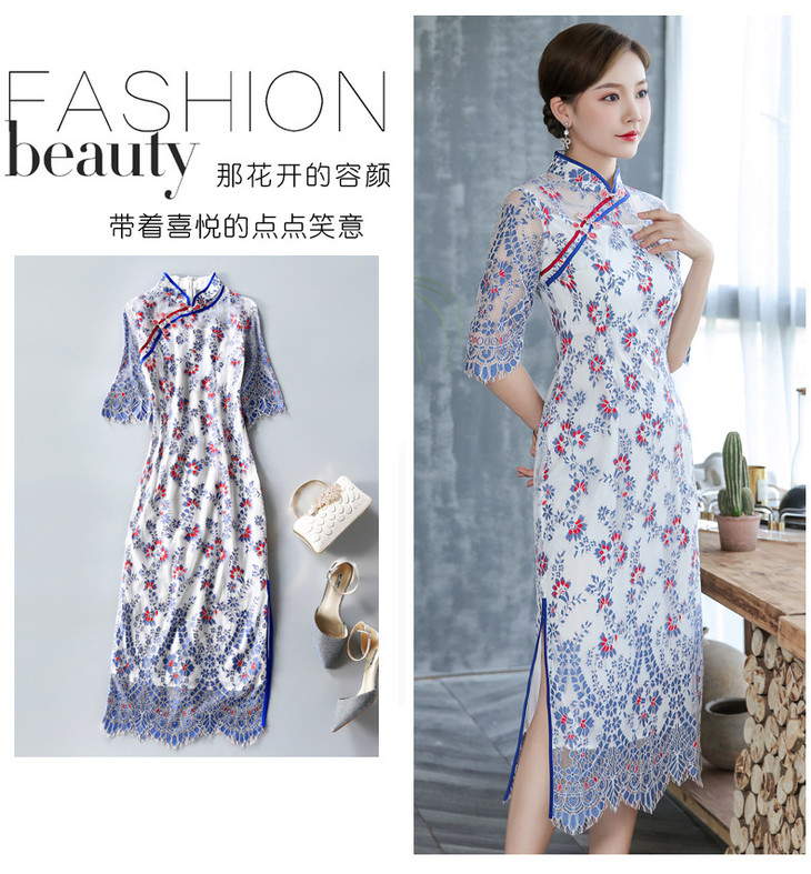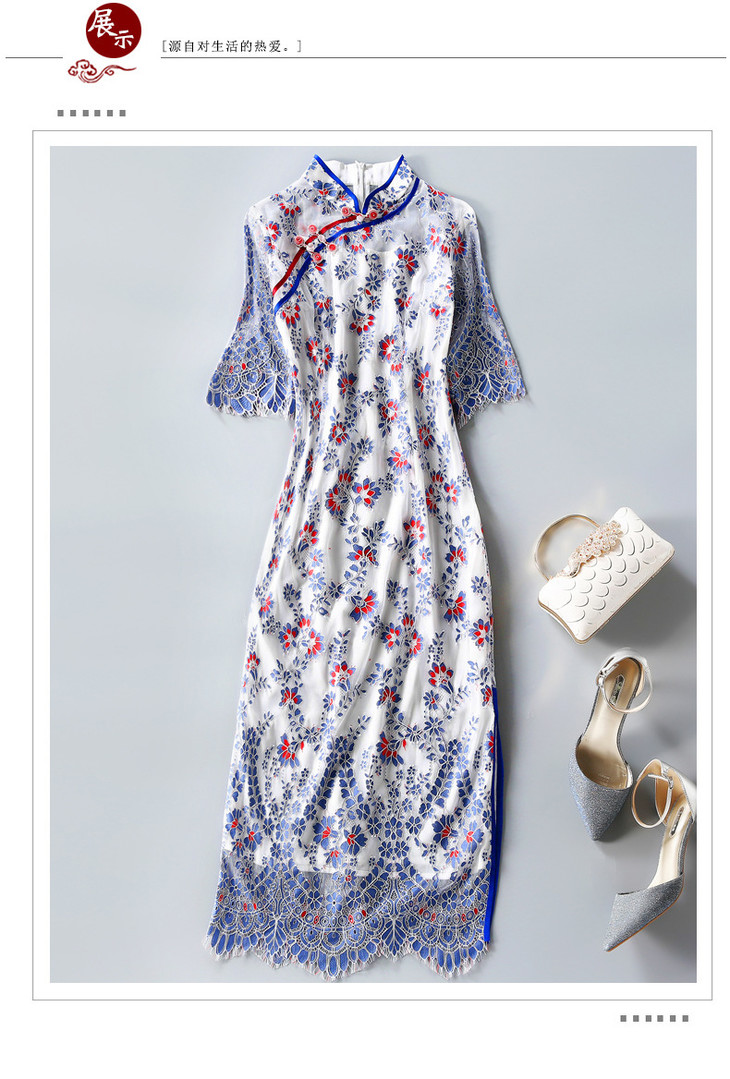 ZSM-200420复古修身,中长款喇叭袖毛边蕾丝网纱绣花旗袍
