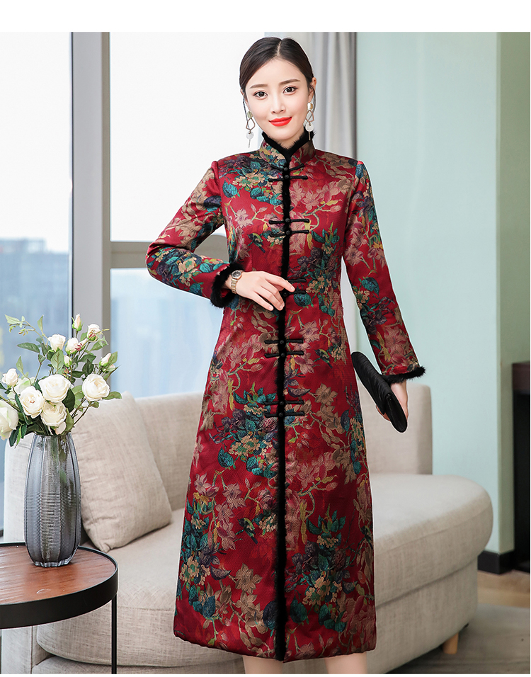 YJM新款优雅气质修身立领长袖加厚中长款印花夹棉旗袍裙