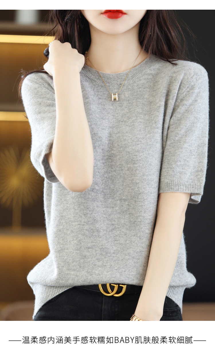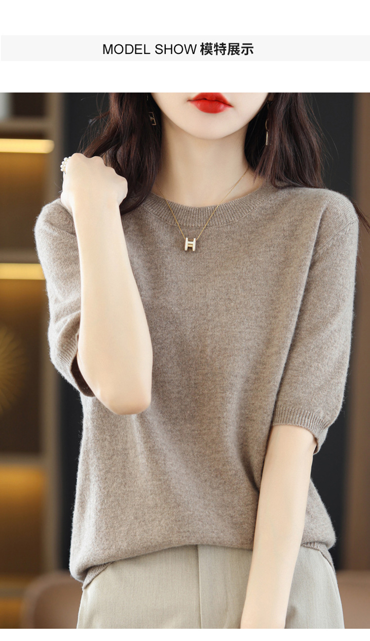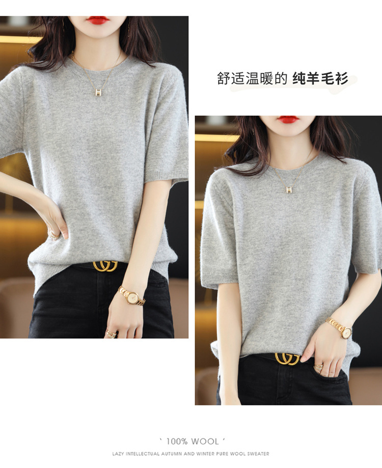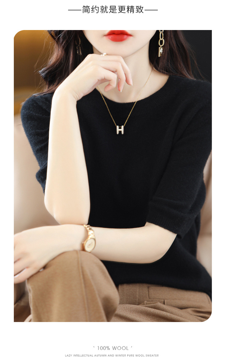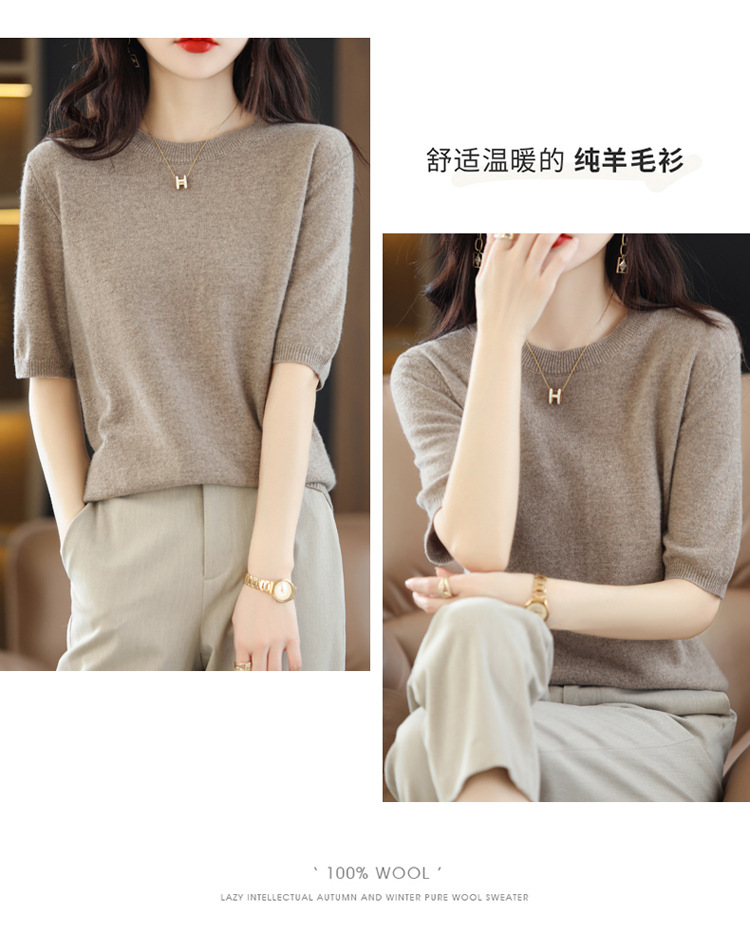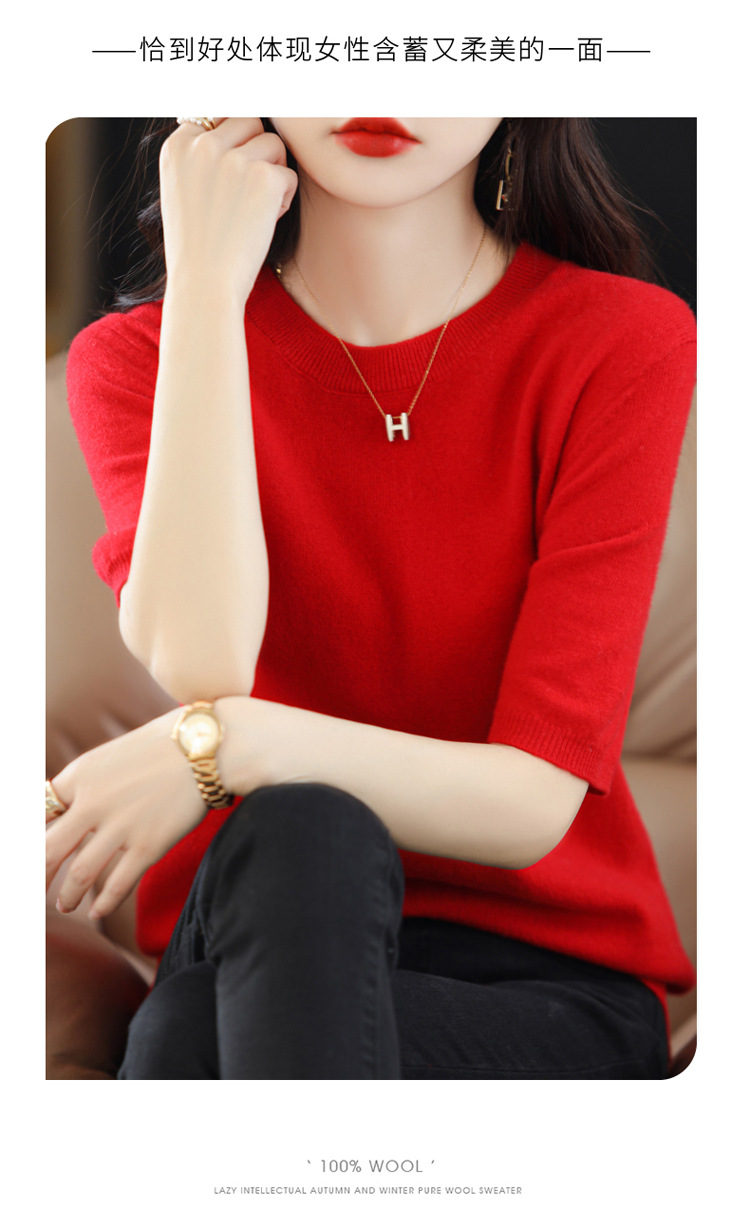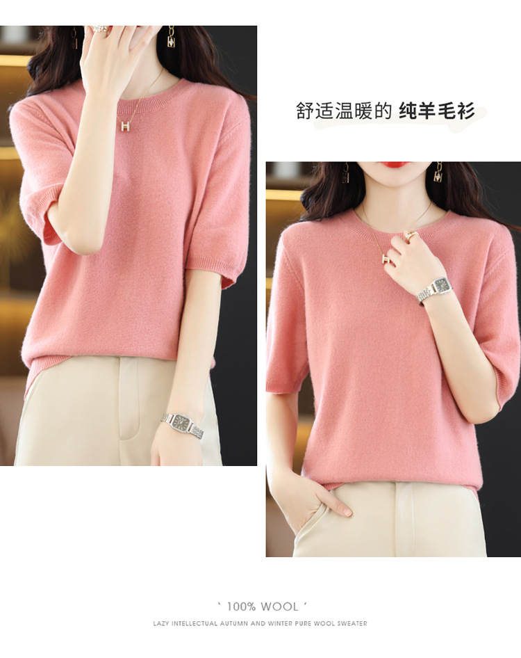 丁摩~100纯羊毛圆领五分袖针织衫女春秋短袖上衣宽松中袖T恤纯色打底衫JJIA209