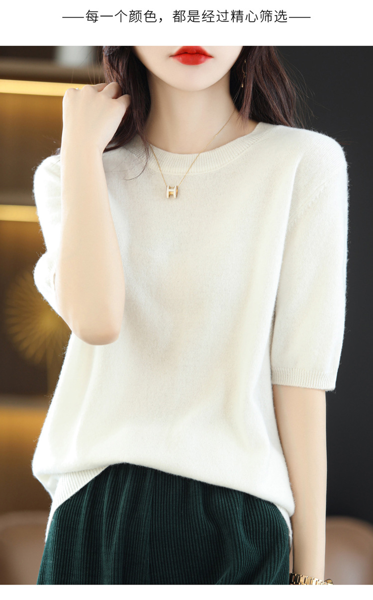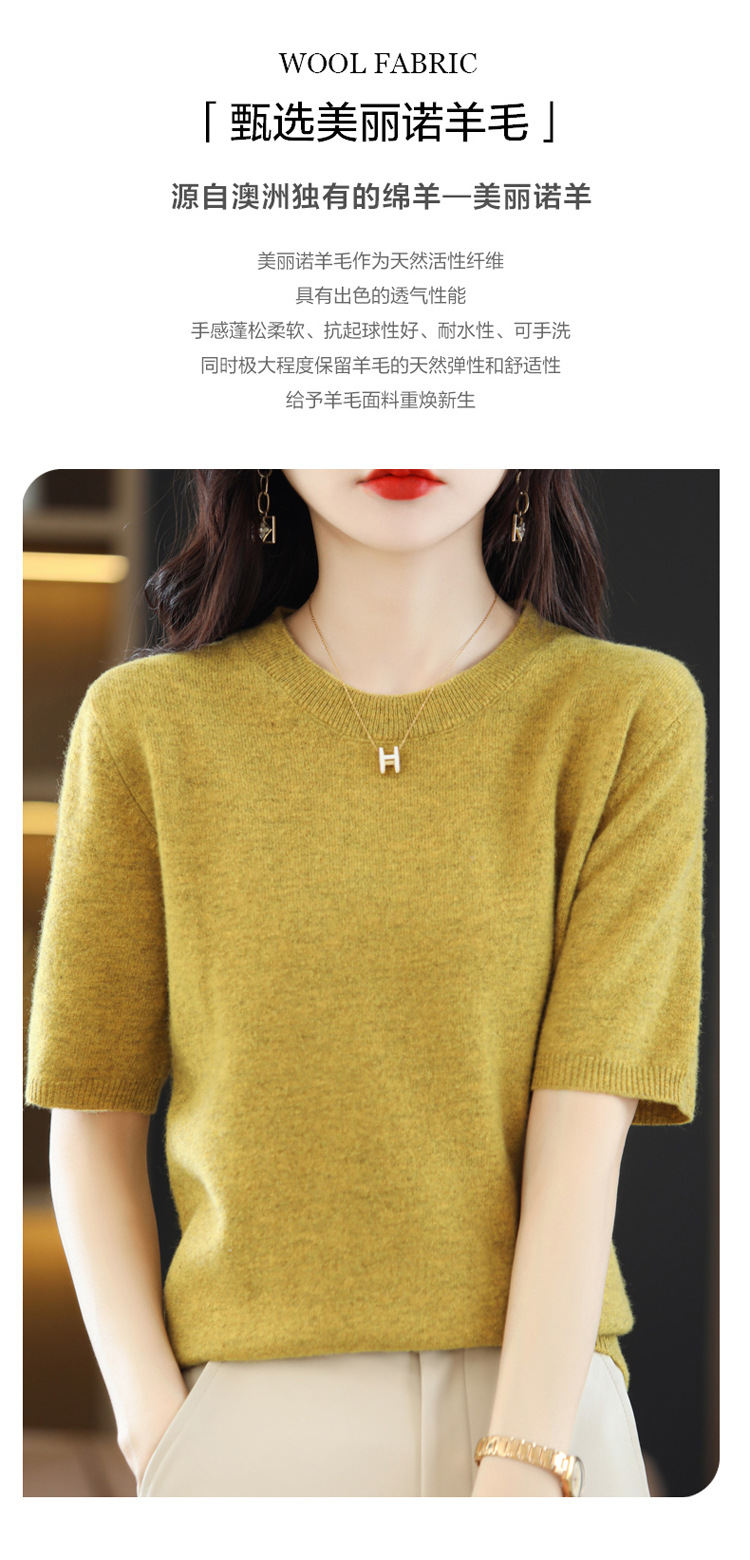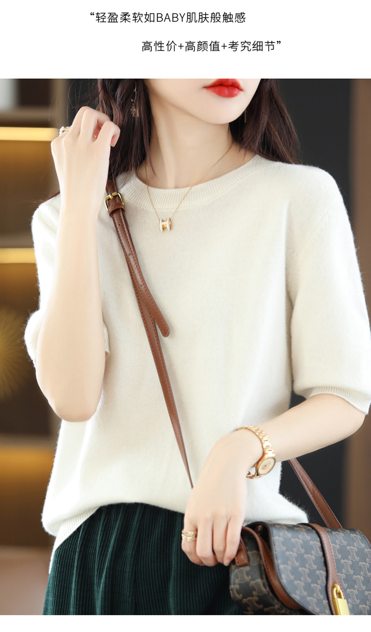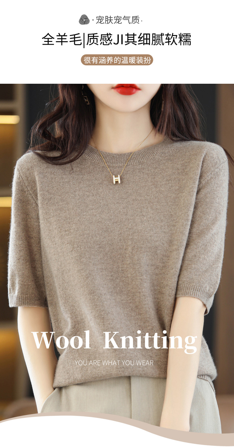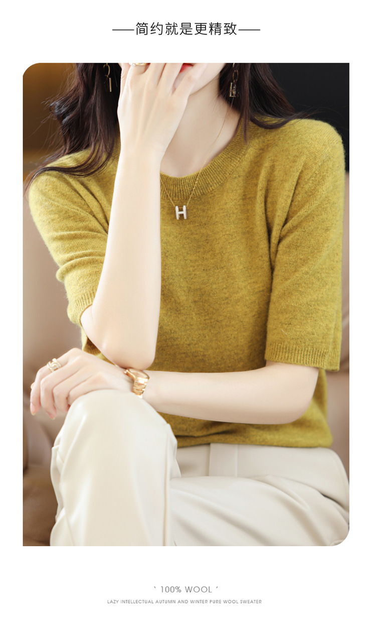 丁摩~100纯羊毛圆领五分袖针织衫女春秋短袖上衣宽松中袖T恤纯色打底衫JJIA209