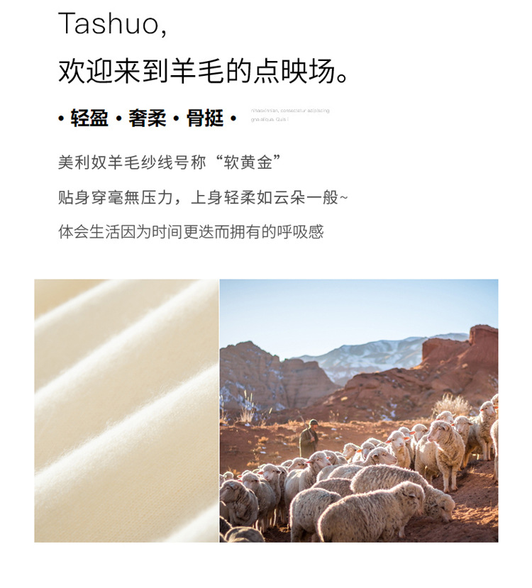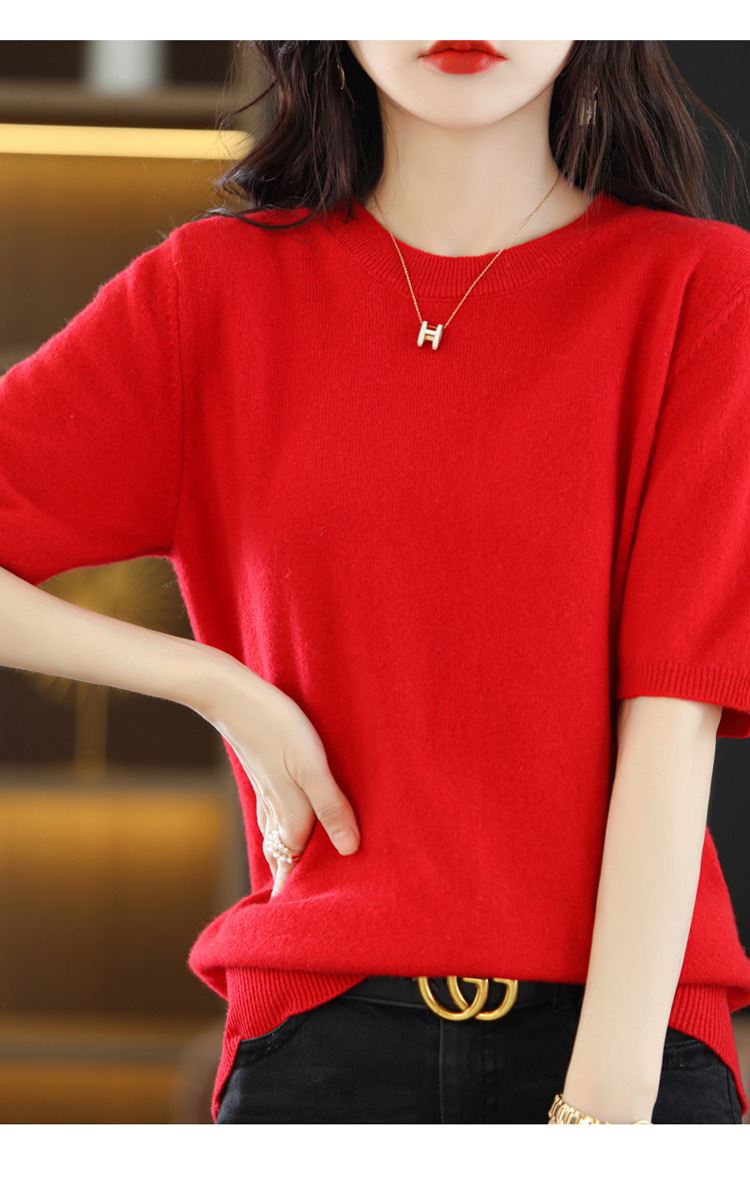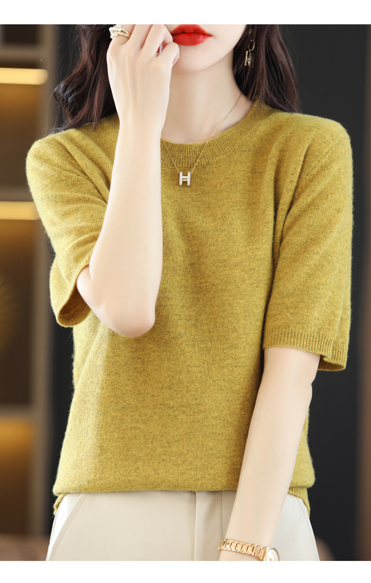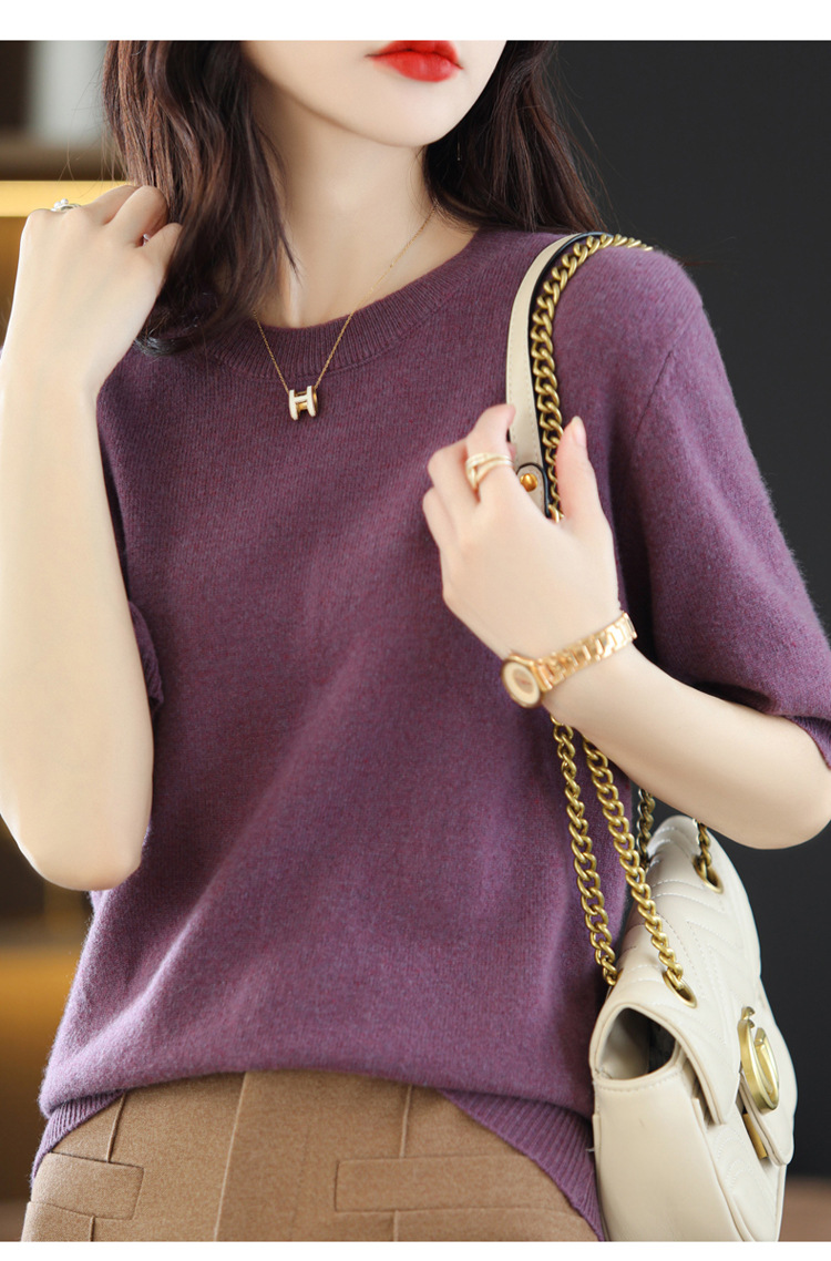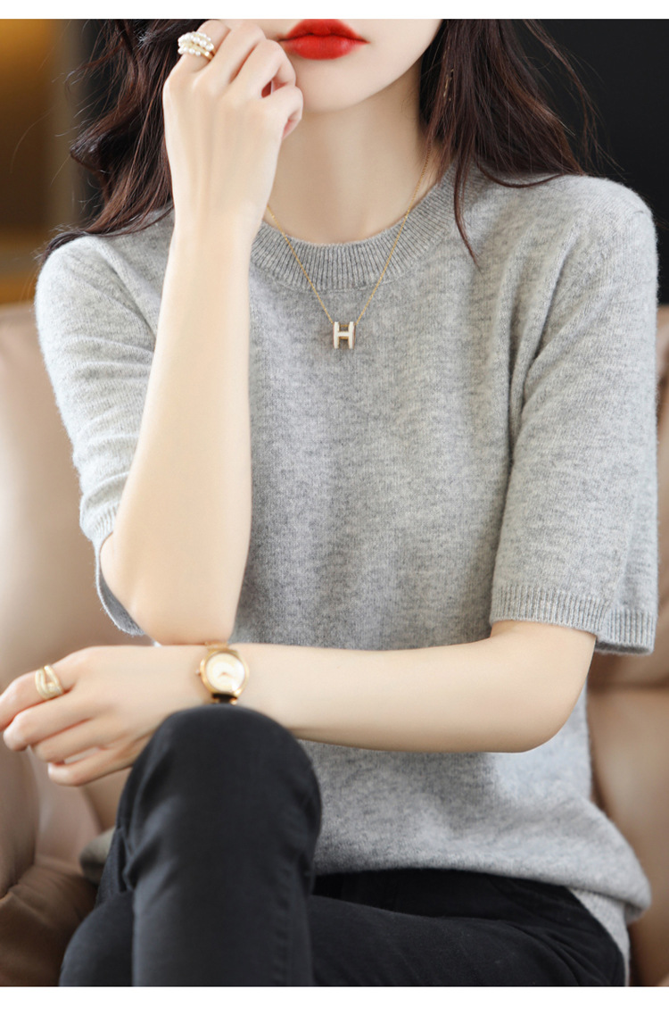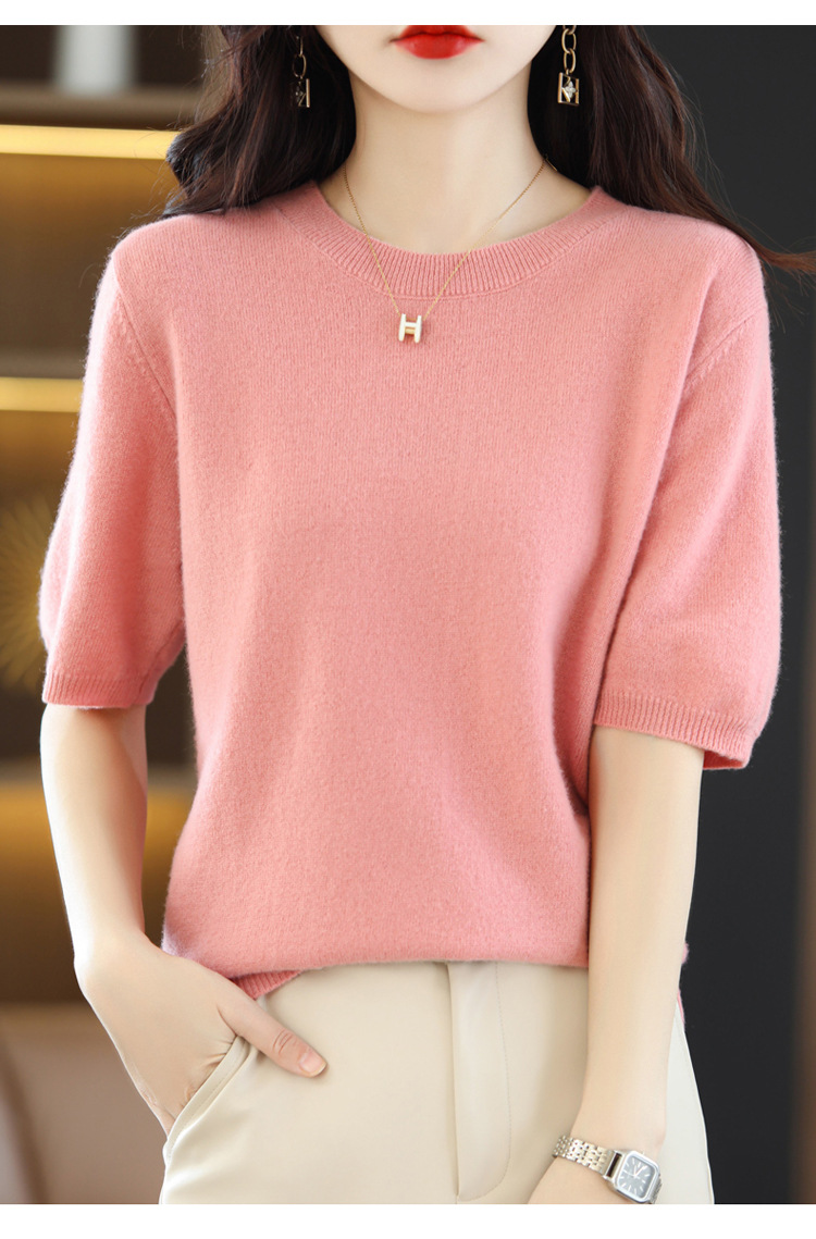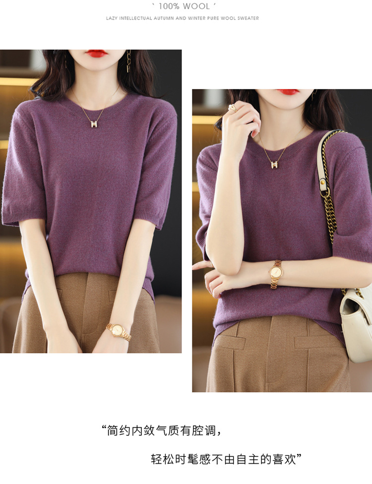 丁摩~100纯羊毛圆领五分袖针织衫女春秋短袖上衣宽松中袖T恤纯色打底衫JJIA209