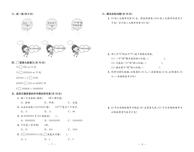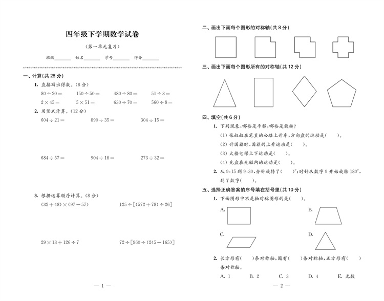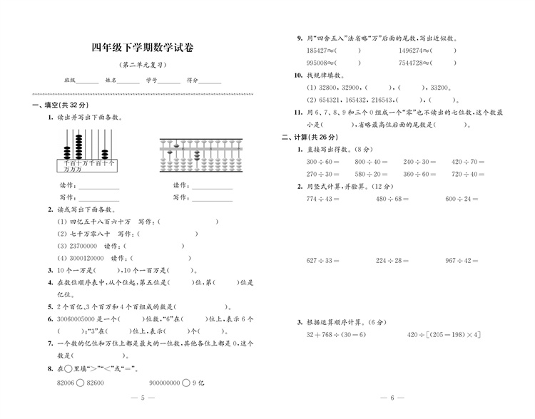 2025年春 小学数学练习与测试检测卷 四年级下册 苏教版 含电子答案 4下 小学同步教辅试卷 江苏凤凰教育出版社