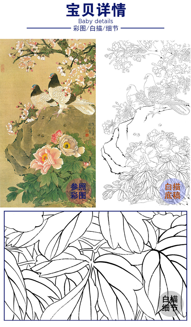 工笔花鸟白描底稿-周中耀牡丹小品《二乔》-多种白描尺寸可选-ZY04