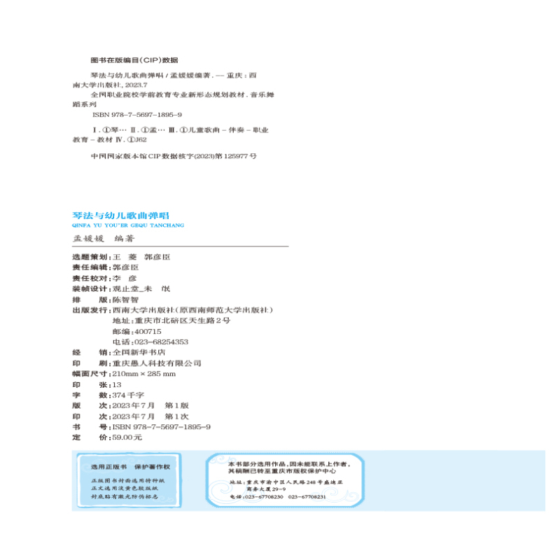 *书名:琴法与幼儿歌曲弹唱 | *ISBN:978-7-5697-1895-9 |