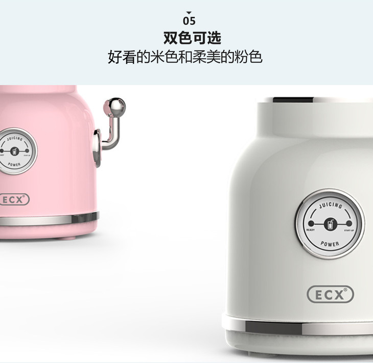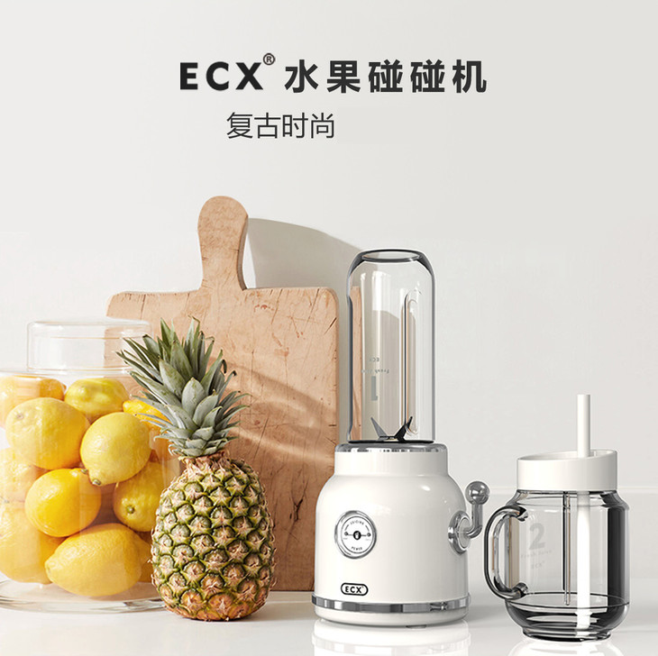 ECX水果碰碰机正式发布!ecx把轻食,健康,低卡,减脂的理念,通过产品的功能,复古概念,文化等多方面来表现本次产品。产品使用最能体现高级的米色和女性柔美的粉色,更加突出了产品金属配合复古概念的特征。同时增添了时尚的气息。特别设计的梅森吸管杯型和运动随行杯,满足了各类人群的特殊需求。同时抽拉与个性插画风格的包装,保证每个产品都独一无二!