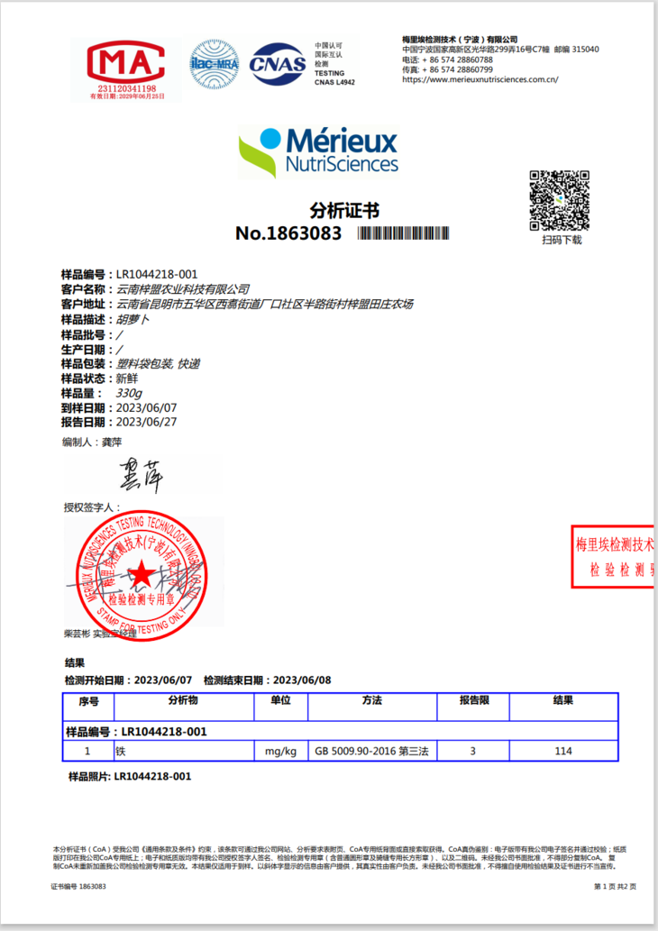 高原红土土壤种植,土壤铁元素含量高,经过送检的有机胡萝卜样品铁元素含量为114mg/kg,一般胡萝卜铁含量平均值为3mg/kg,铁元素含量多了非常多哦。