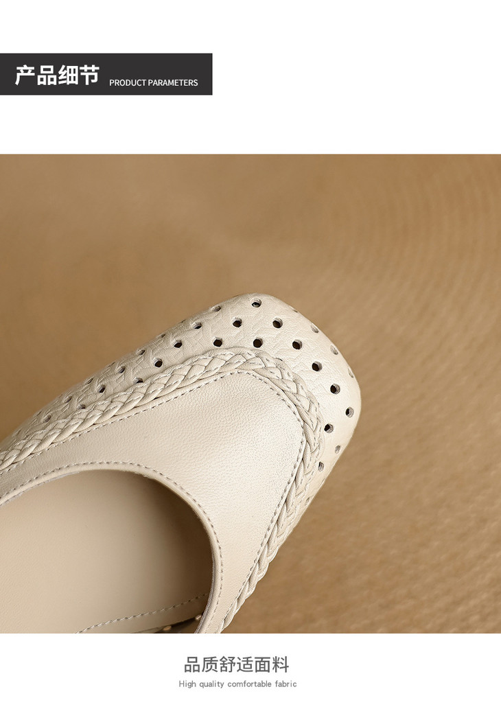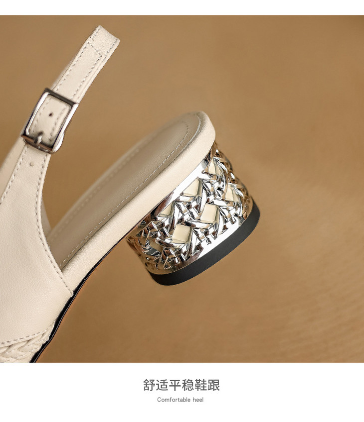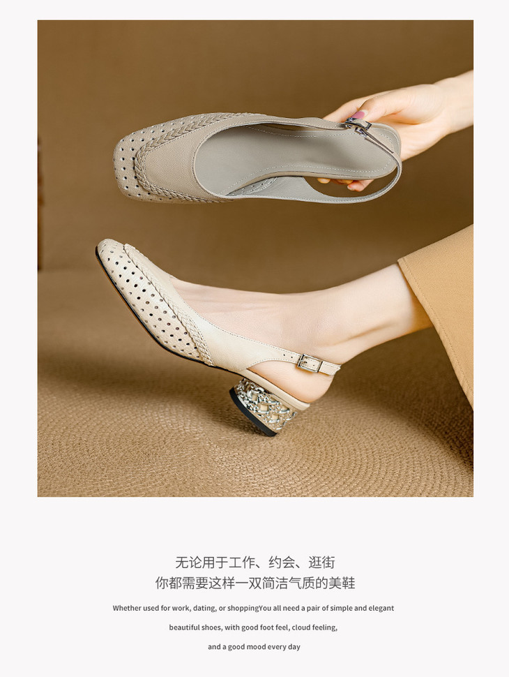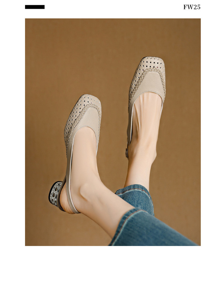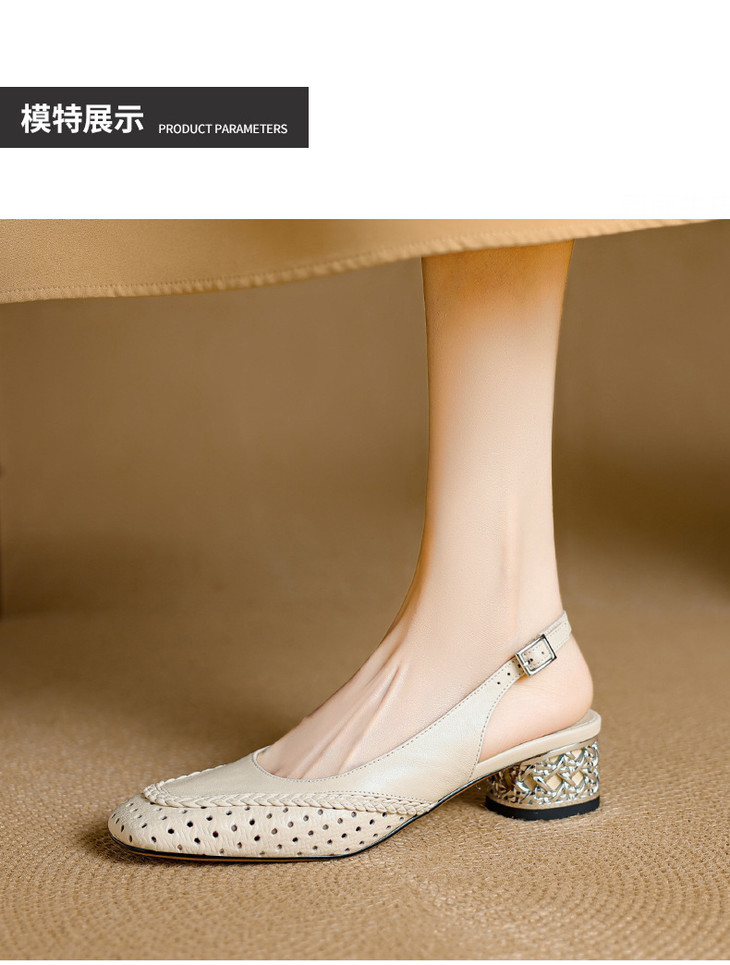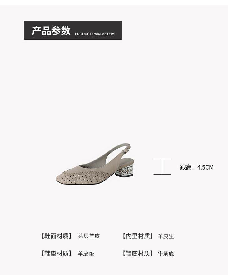 【预售5天】设计感小众编织羊皮方头镂空洞洞鞋法式粗跟一字带包头罗马凉鞋K1623