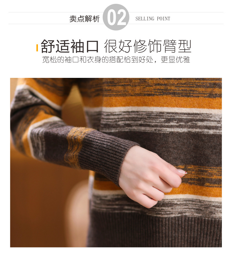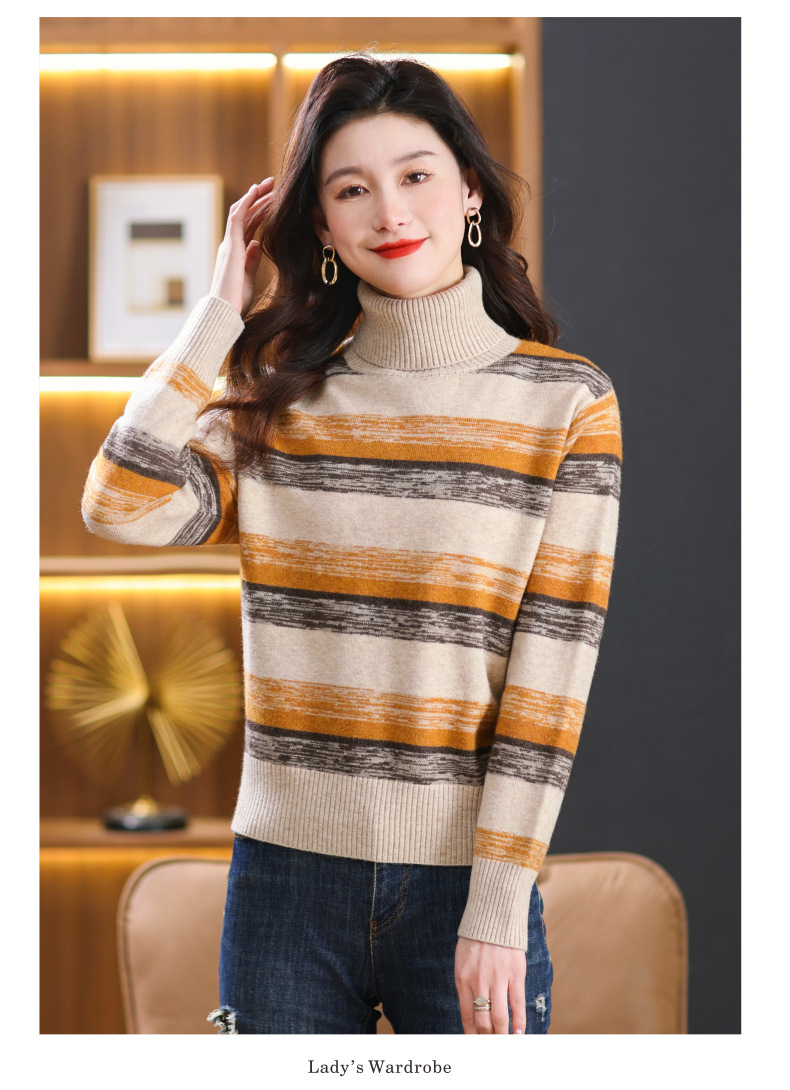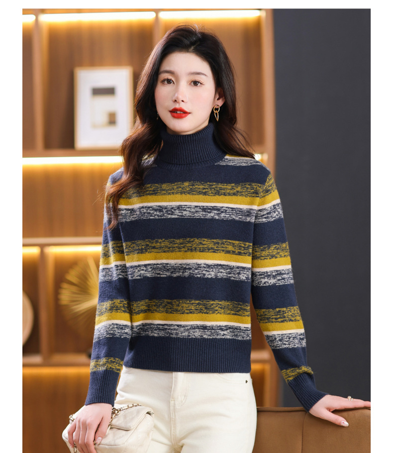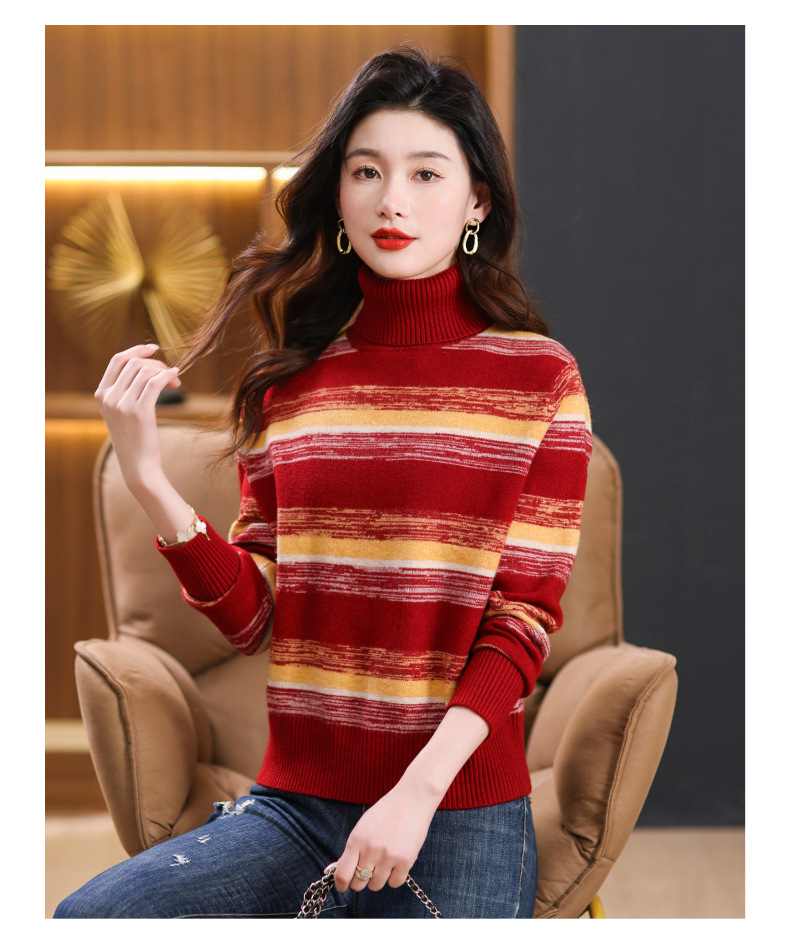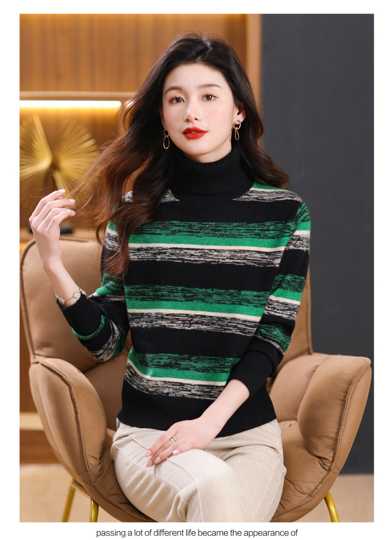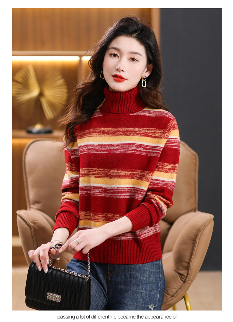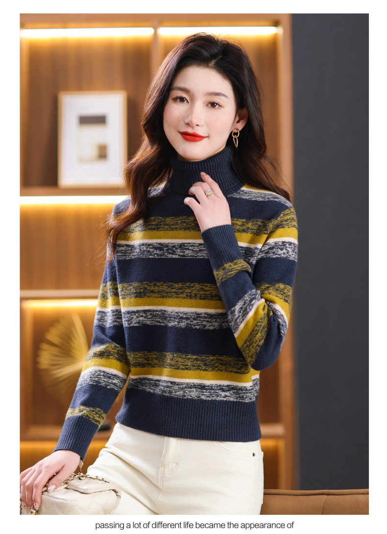 秋冬季新款,女士加厚条纹拼色打底衫高领洋气宽松内搭翻领毛衣CC-101-35363