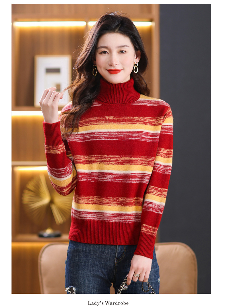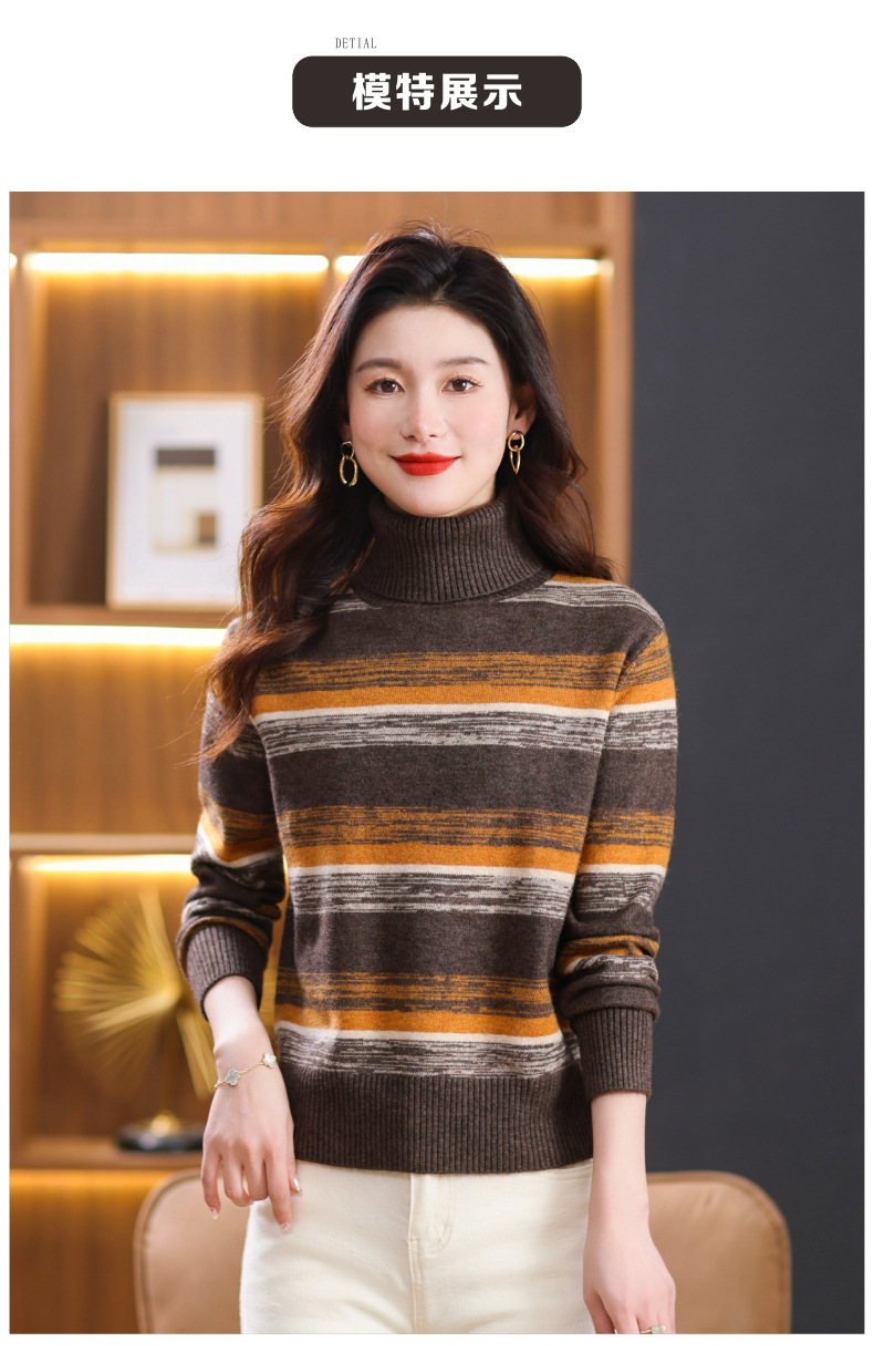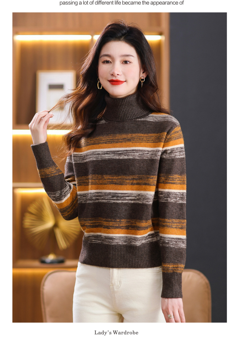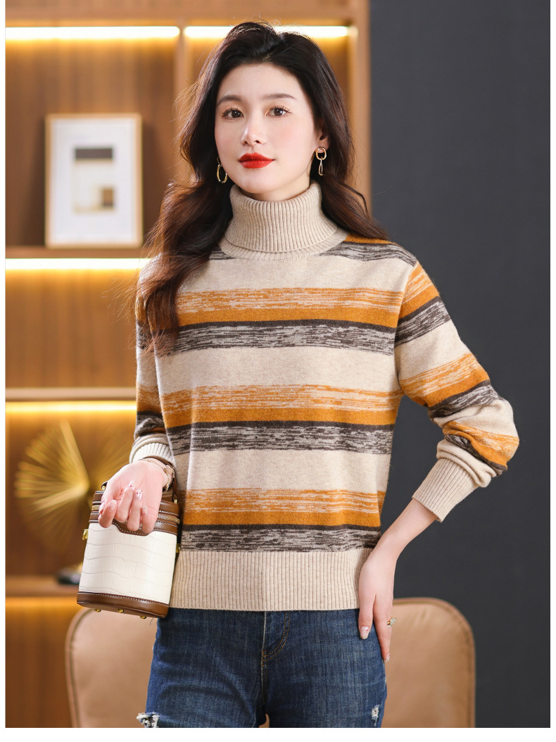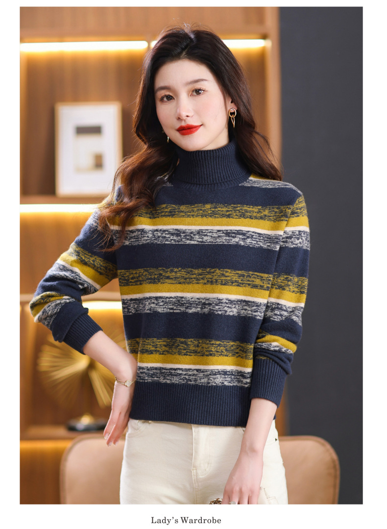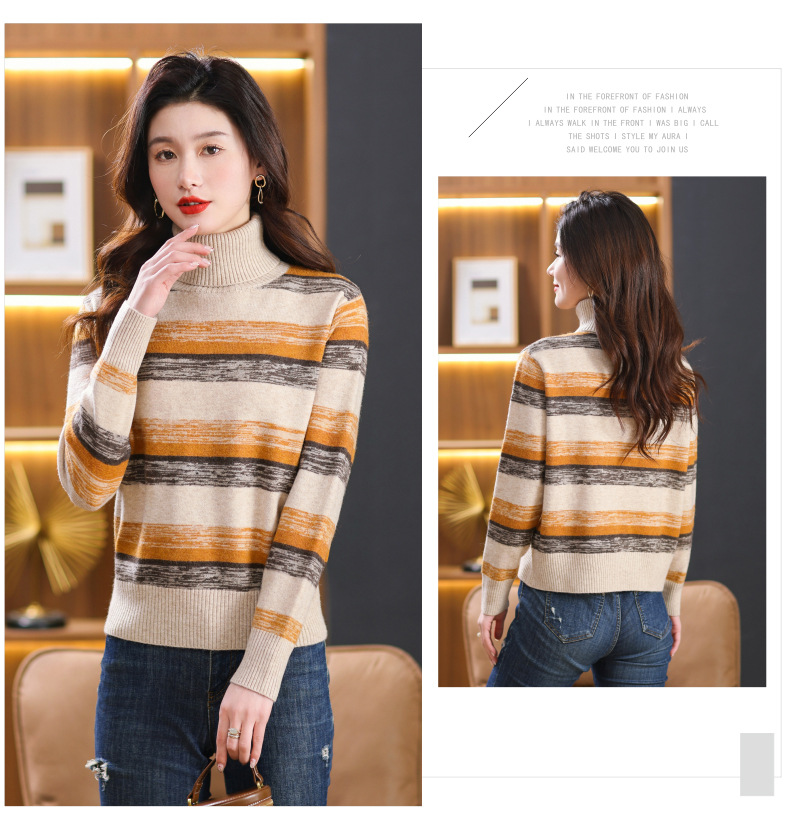秋冬季新款,女士加厚条纹拼色打底衫高领洋气宽松内搭翻领毛衣CC-101-35363