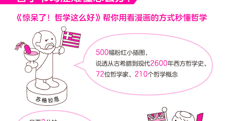 哲学书晦涩难懂怎么办?《惊呆了!哲学这么好》帮你用看漫画的方式秒懂哲学,用500幅红小插图,说透72位哲学家、2个哲学概念和2600年西方哲学史!只要三分钟,就能够认识一位哲学家、懂得一种哲学思想,一步踏入哲学世界。