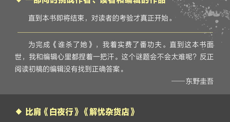《谁杀了她》是一本需要读者自己去寻找真相的小说,一个死者、两个嫌疑人、两个带着不同目的寻找真相的人,构成了整个故事。东野圭吾说:“为完成《谁杀了她》,我着实费了番功夫。直到这本书面世,我和编辑心里都捏着一把汗。这个谜题会不会太难呢?反正阅读di一稿的编辑没有找到正确答案。”