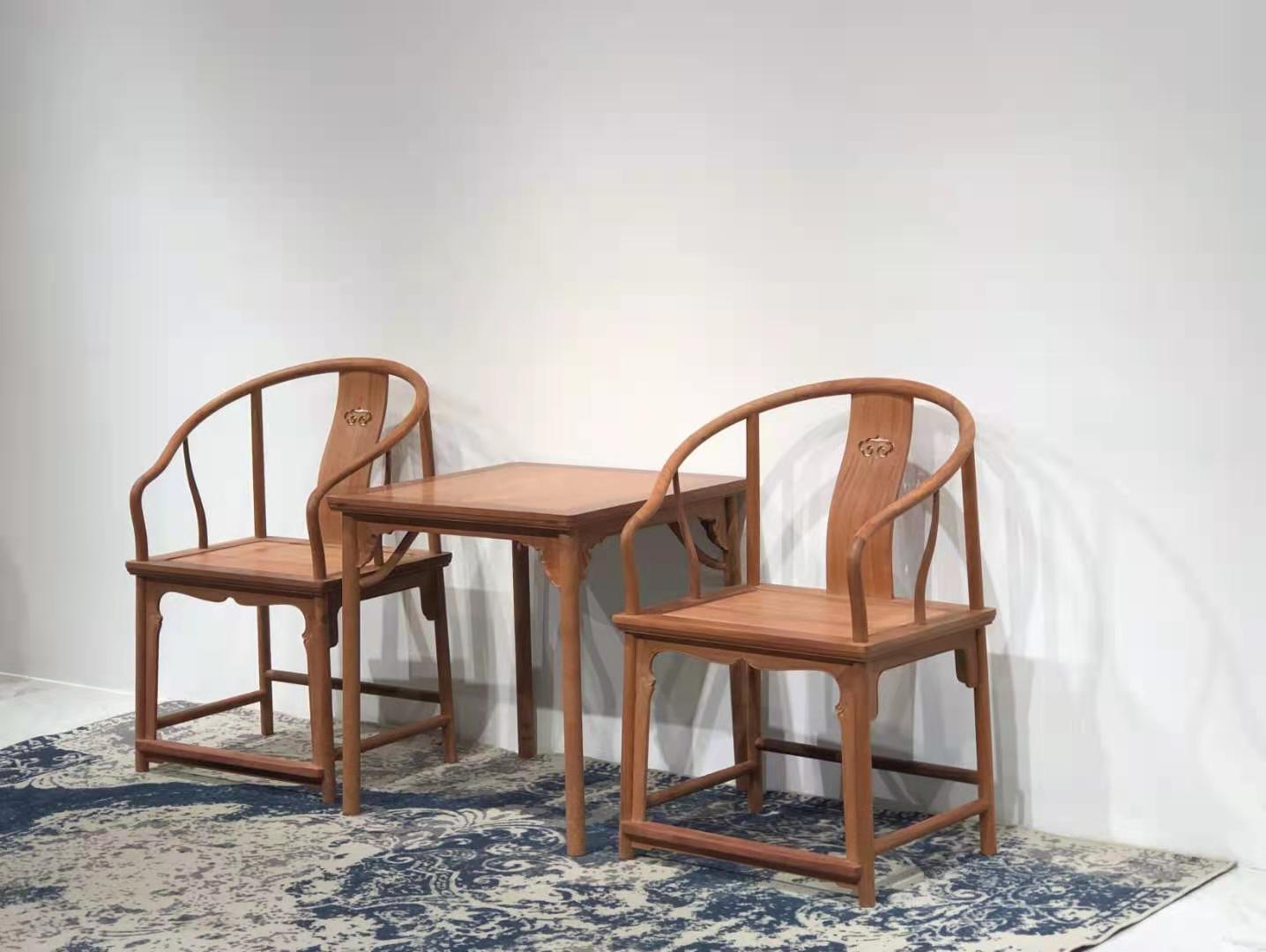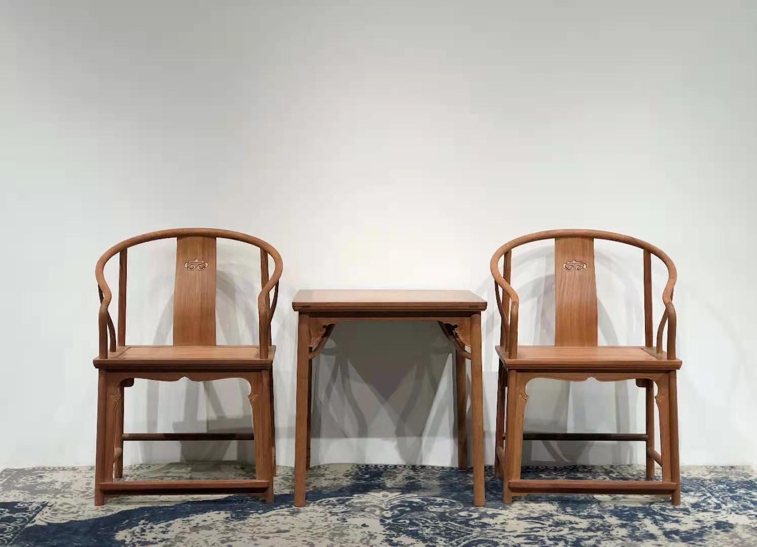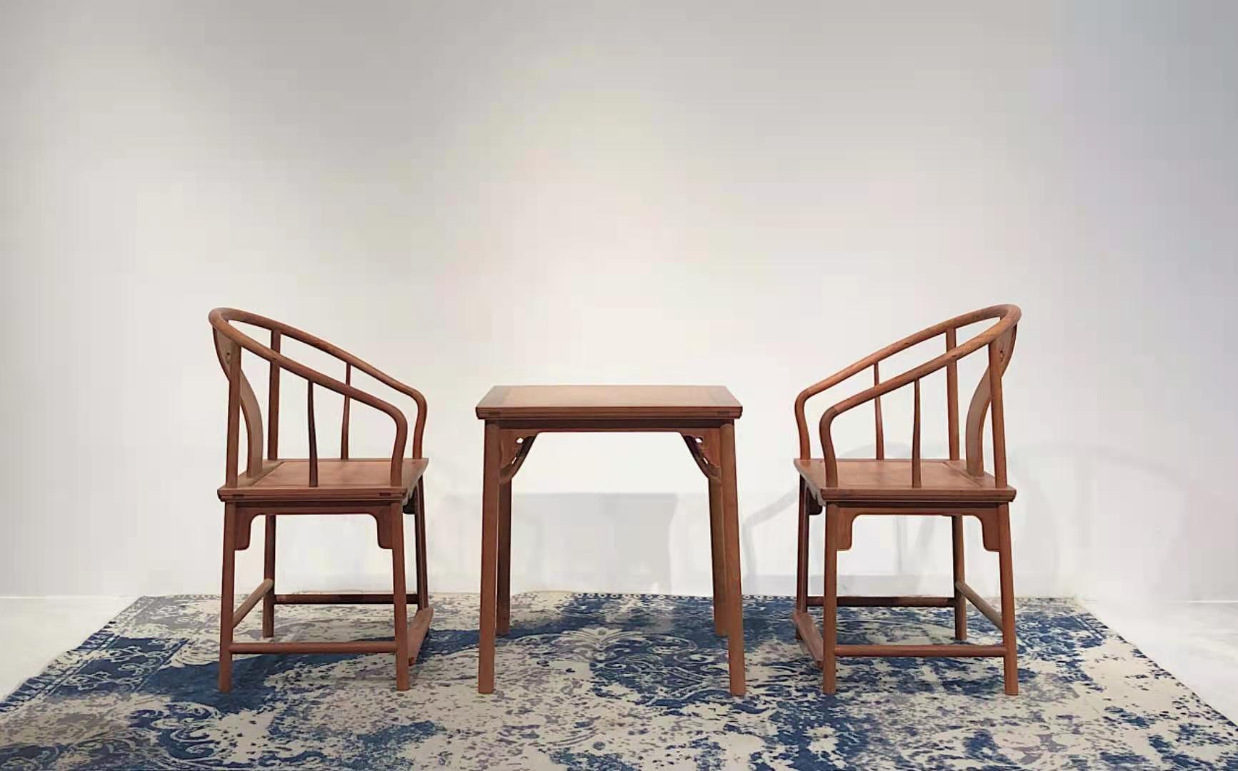 此款圈椅三件套的基本设计,有两个灵感来源,一是赫赫有名的安思远藤条垂手圈椅,二是改正统的小茶几为小棋桌。这种设计打破了传统圈椅更适合在室内陈设使用的惯例,赋予了它更为休闲和灵活的应用场景。