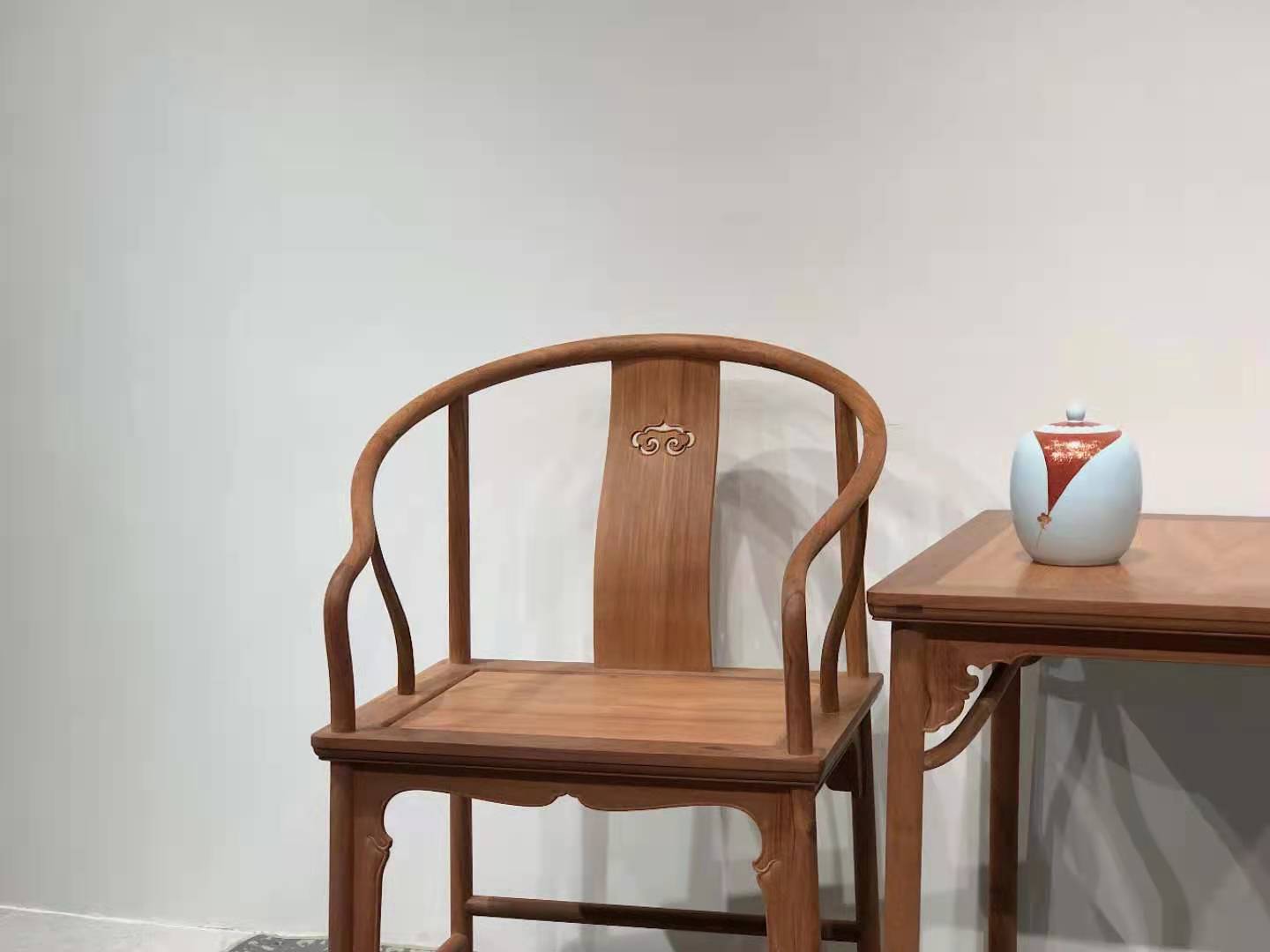 小棋桌无束腰,面微微喷出,冰盘沿用椅盘面一样的造法,圆材侧脚,霸王枨结构为腿部留下充裕的活动空间,比例控制得当。三件套基本形成1:1:1的视觉效果,存在感极强,却也不会夺了圈椅的光彩。传统家具传承的是榫卯、文化和审美,当代生活则需要更多的可能,这套圈椅,应该是一次不错的碰撞与出彩。