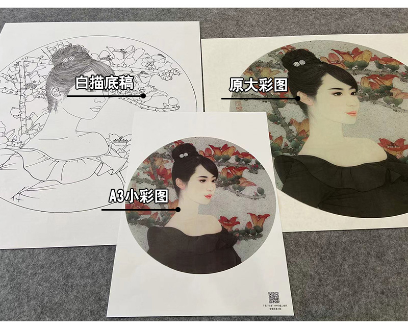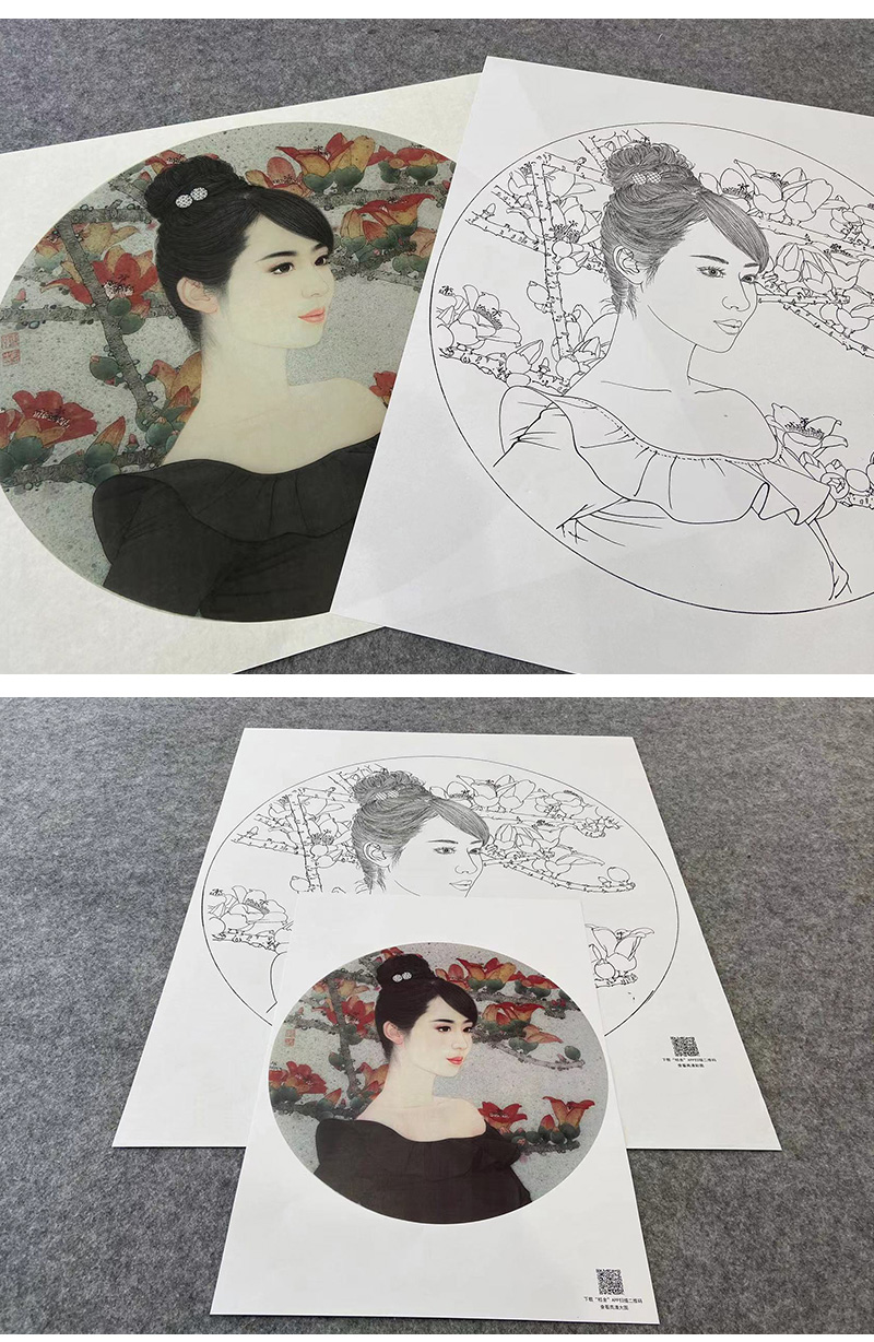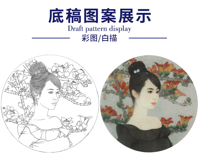 【大彩图】盘虎杰工笔画白描底稿圆形小品现代人物高清打印稿HJ36