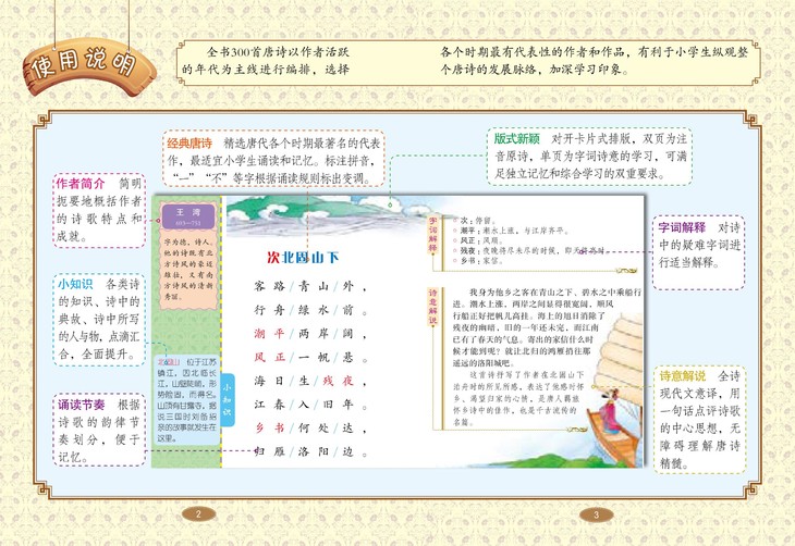 本书收录了唐朝 121 位诗人的 300 首代表作品,其中既有李白、杜甫、王维、白居易等著名诗人的传世名作,也有七岁女等民间诗人的不俗诗作,反映了唐诗不同时期的风貌和特征。每一首诗都有诵读节奏划分、拼音标注、难字和诗意解析,易学易记,非常适合小学生自主学习与背诵。