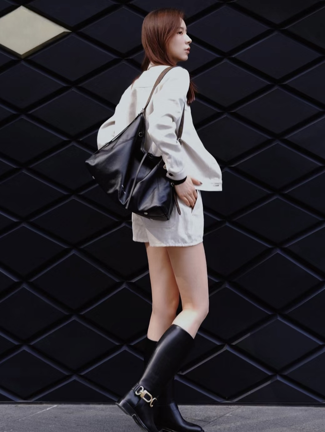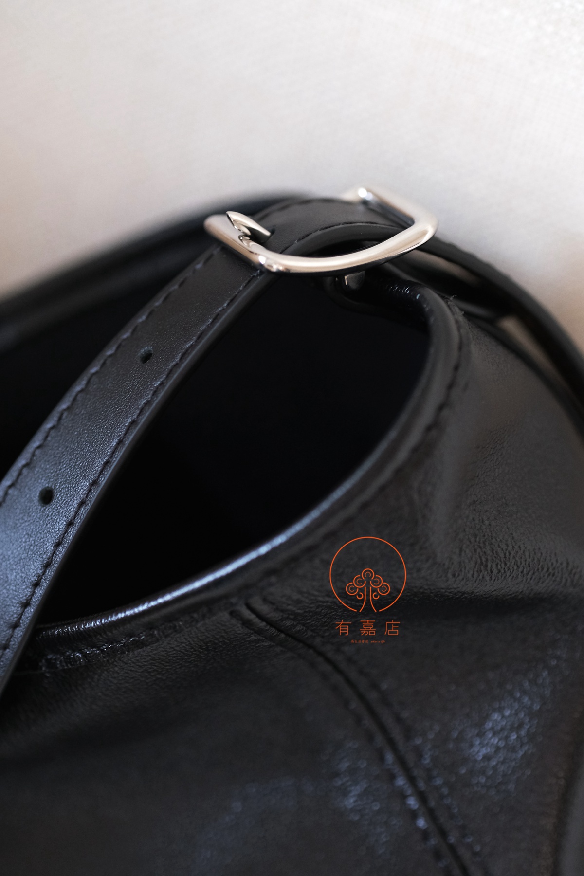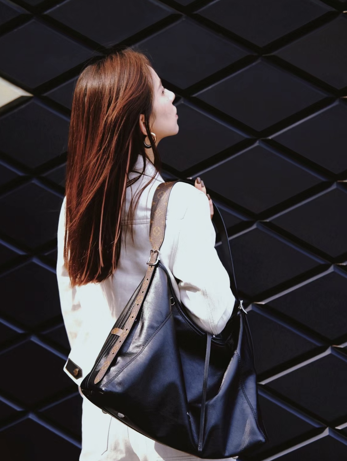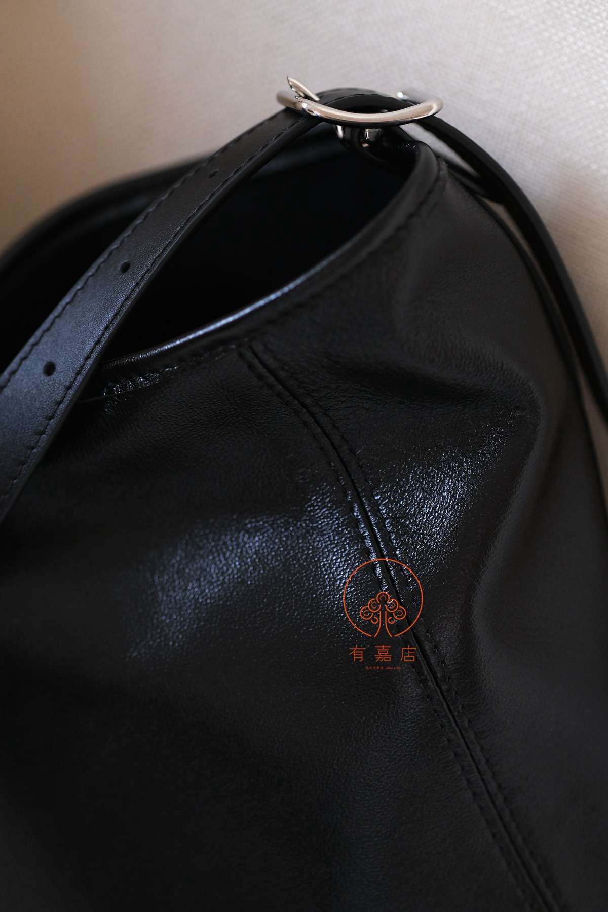 时尚慵懒廓形,抛光金属件和皮革微皱纹理互为映衬。