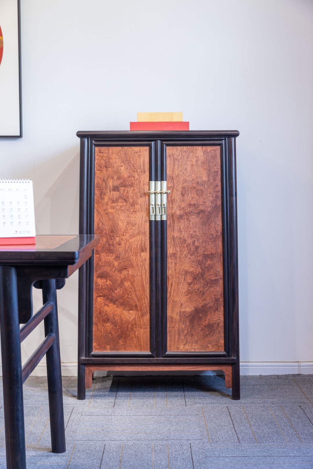 此柜整器全身光素,做撞色效果,四边框之材皆取紫光檀(东非黑黄檀),质坚材硬,暗纹迷人,嵌夹鲜丽缅甸花梨(正宗大果紫檀),赏之如姚黄魏紫。柜帽顶部平镶装板,可摆放器物,柜帽及柜门边抹混面,上下压边线,素牙头。