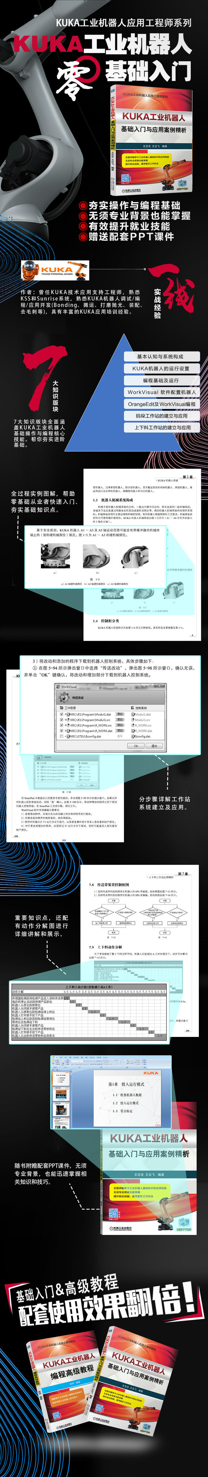 本书基于作者多年与KUKA机器人相关的从业经验来编写,全书共7章,主要围绕KUKA机器人的机械、电气、操作、配置软件、编程软件以及应用等方面展开。其中,第1章以机器人系统组成展开,主要讲述了机器人本体、控制柜、通信总线、示教器操作以及机器人相关安全等内容;第2章以机器人投入运行展开,包含系统线路连接、安全回路、数据备份、投入运行设置、零点标定等内容;第3章主要围绕机器人编程展开,内容包括运动编程以及逻辑信号编程等;第4章介绍基于WorkVisual软件的机器人工程项目配置,比如机器人项目的上传与下载、通信总线与I/O信号的配置、长文本编辑等;第5章从软件编程角度出发,分别讲述了OrangeEdit软件和WorkVisual软件在编程方面的使用;第6章与第7章分别围绕码垛工作站以及上下料工作站展开,其中涉及I/O配置、坐标系建立、联机表单编程、KRL语言编程、流程分解、程序清单等内容。