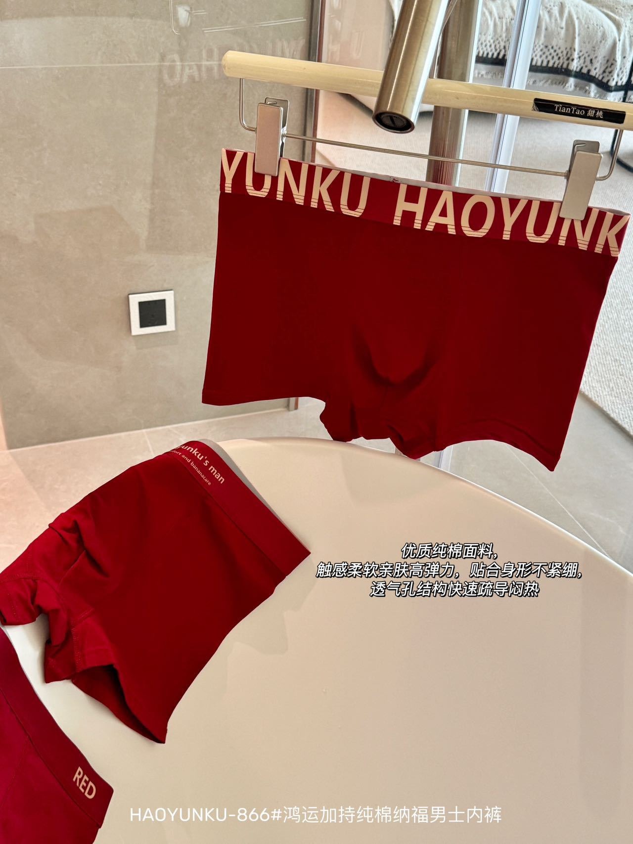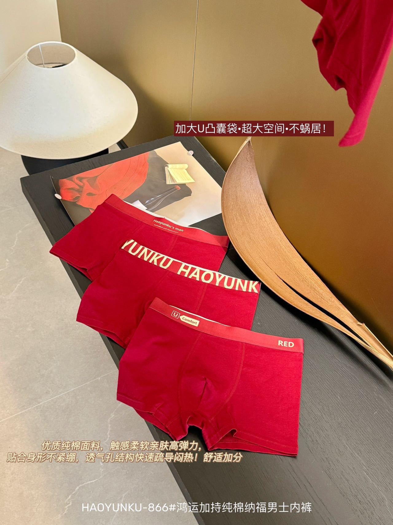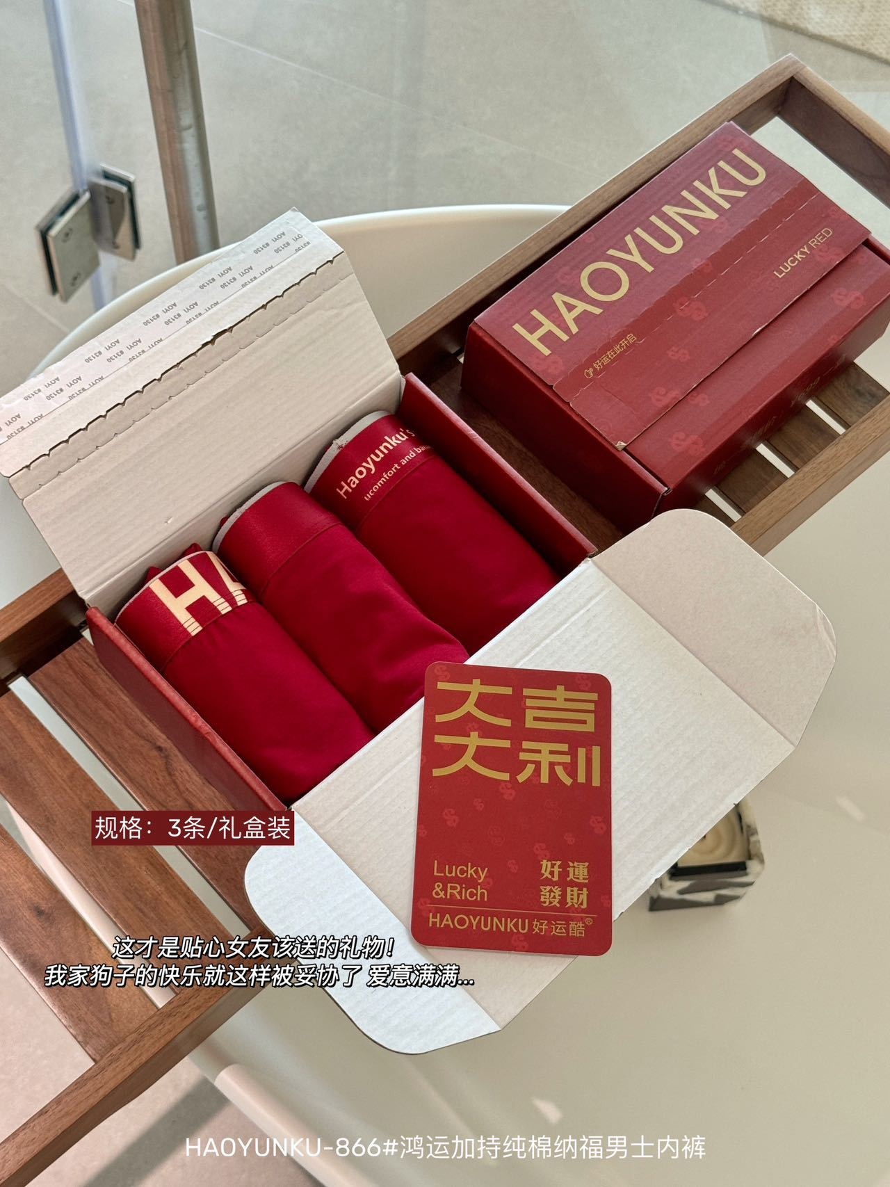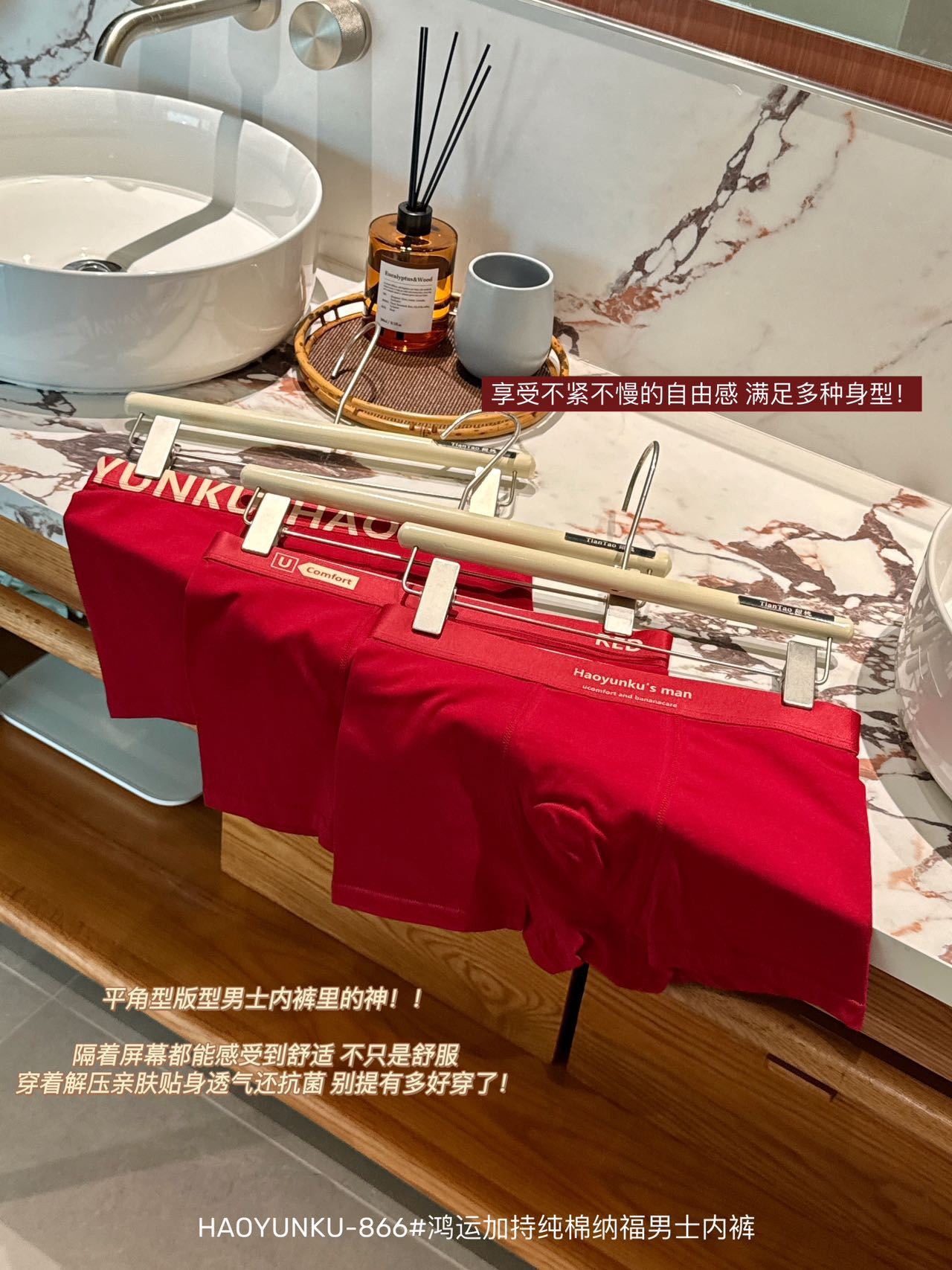 3条礼盒装【旺本命解水迎❗️鸿运加持顺风顺水】866#本命年喜庆鸿运大红纯棉男士内裤裸感透气运动青年大码平角裤。ja