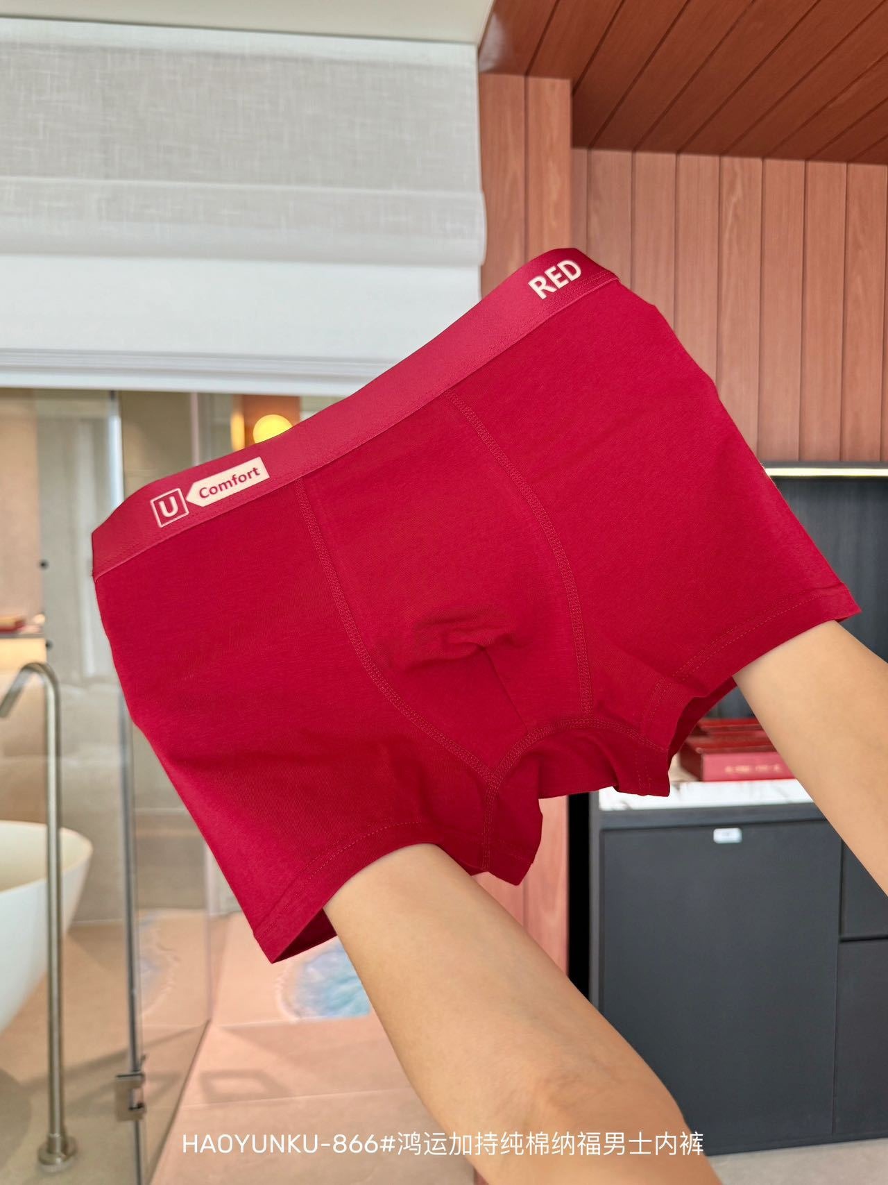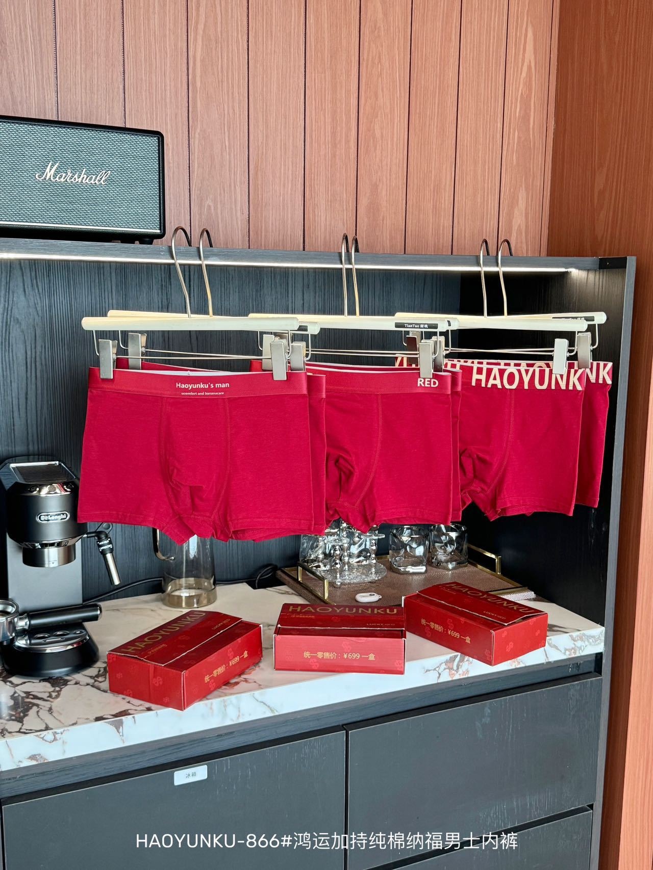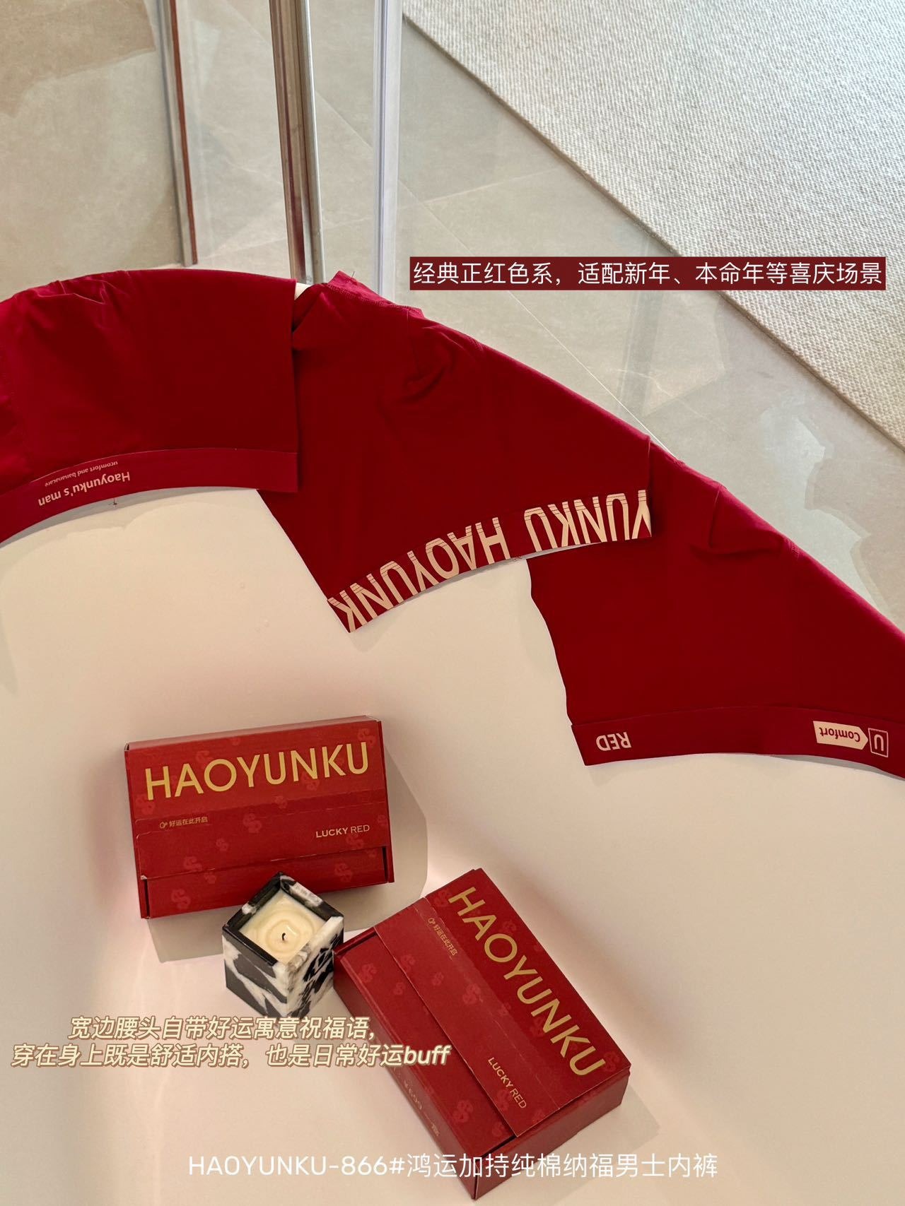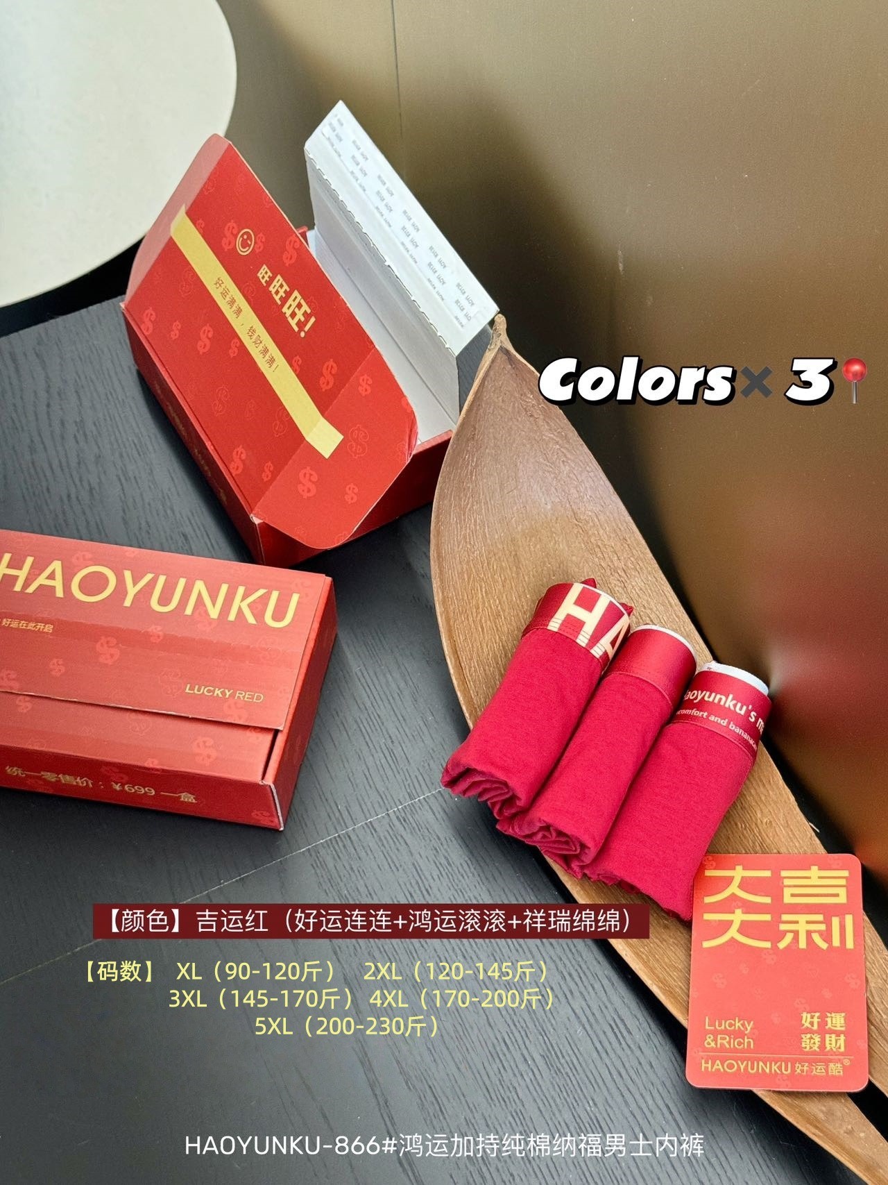3条礼盒装【旺本命解水迎❗️鸿运加持顺风顺水】866#本命年喜庆鸿运大红纯棉男士内裤裸感透气运动青年大码平角裤。ja