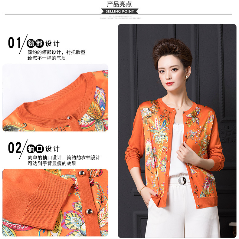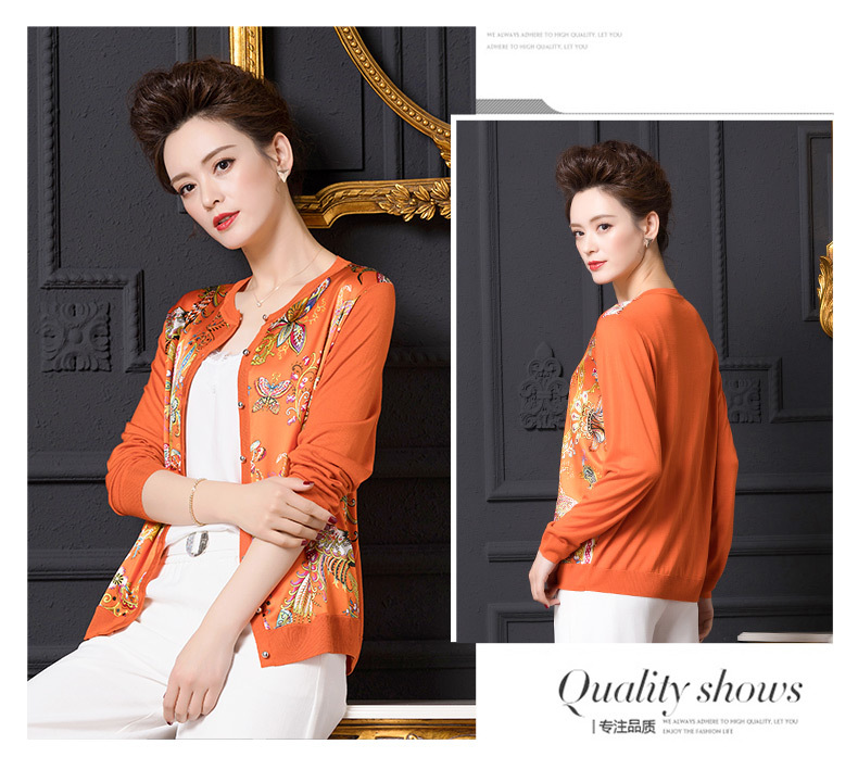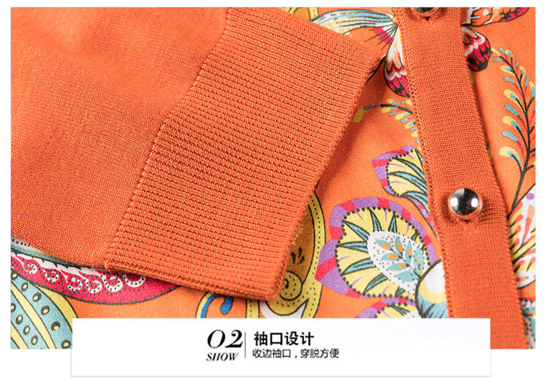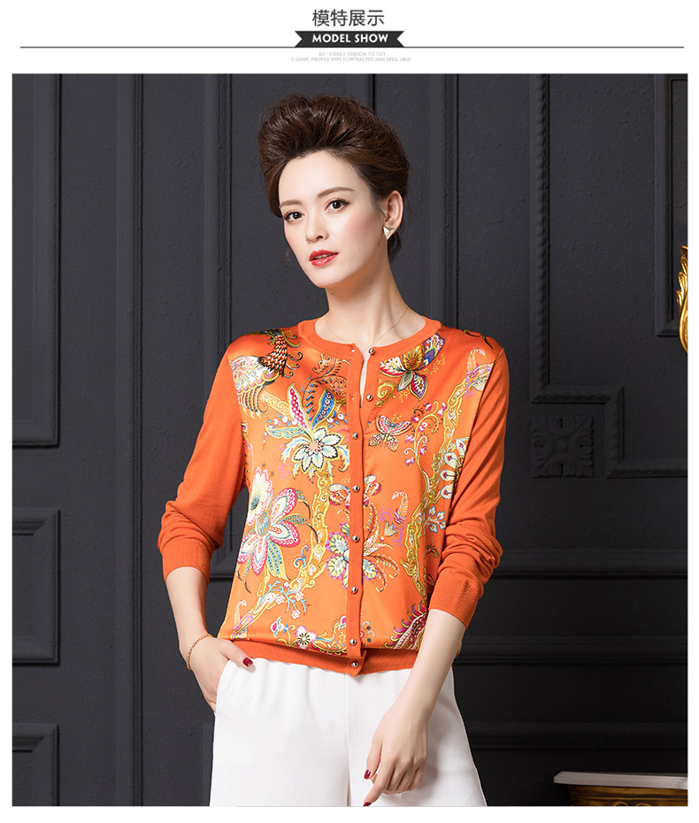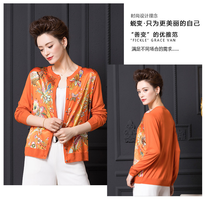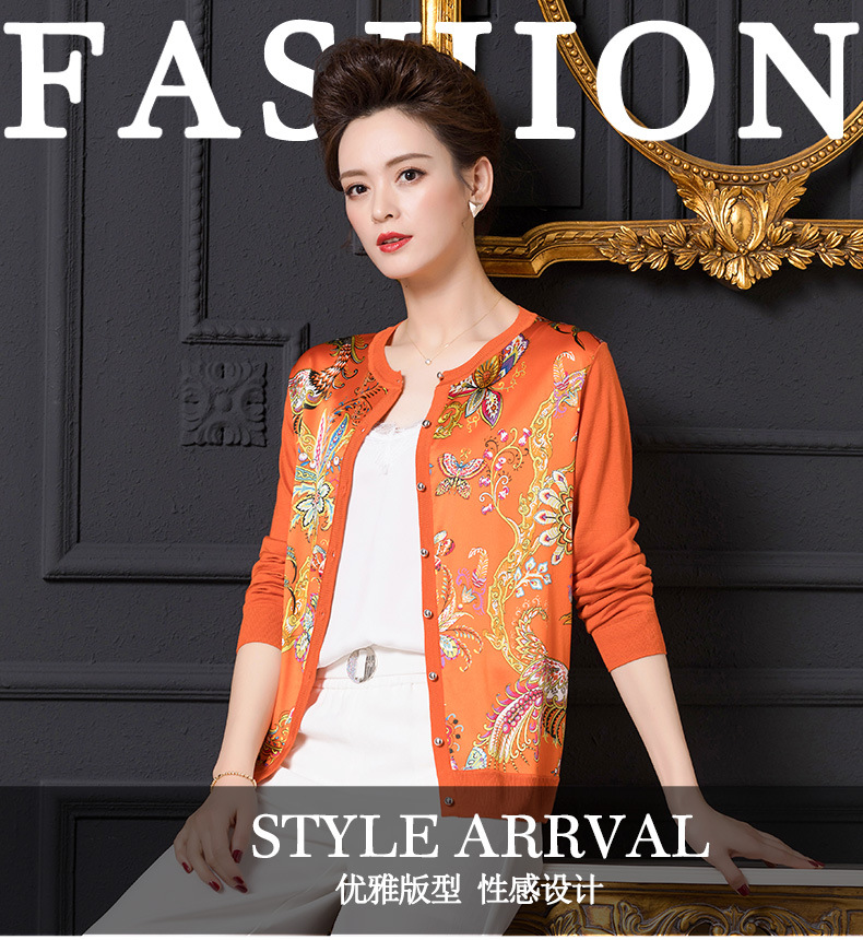 复古印花真丝开衫女式桑蚕丝薄外套单排扣圆领针织衫 QW-6626