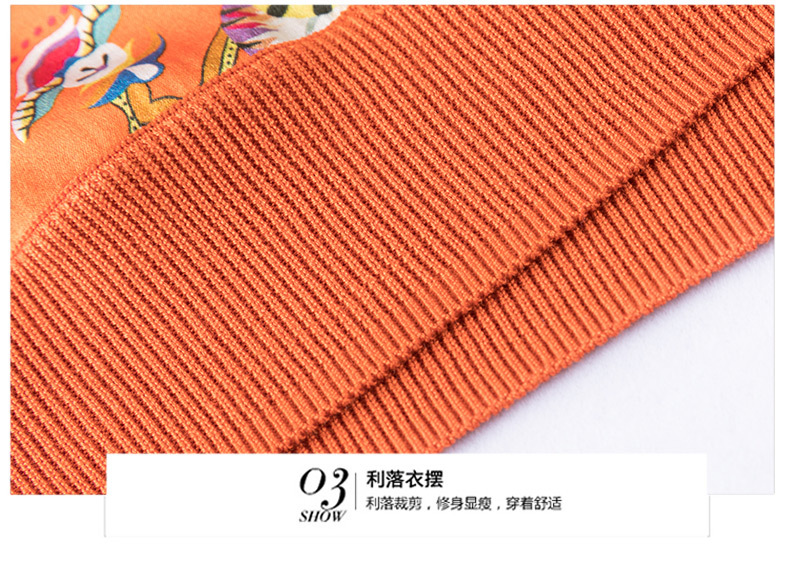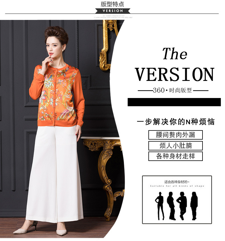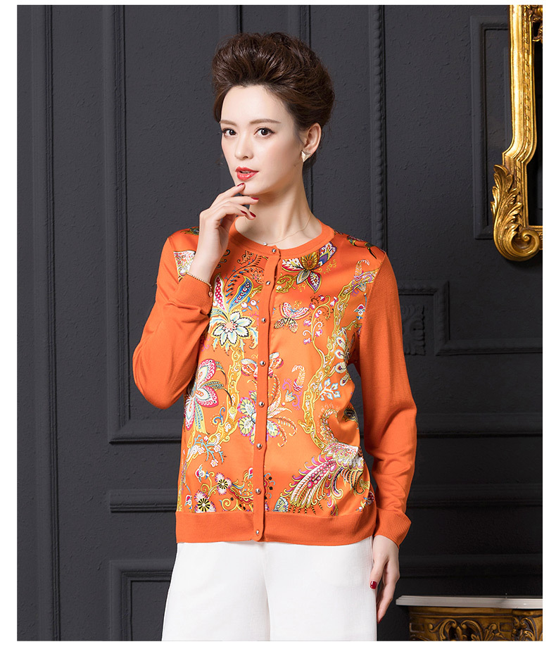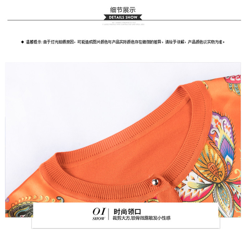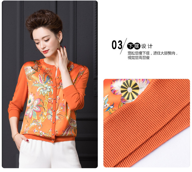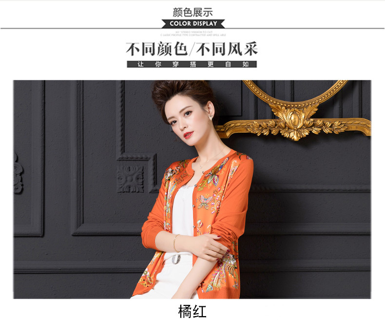 复古印花真丝开衫女式桑蚕丝薄外套单排扣圆领针织衫 QW-6626